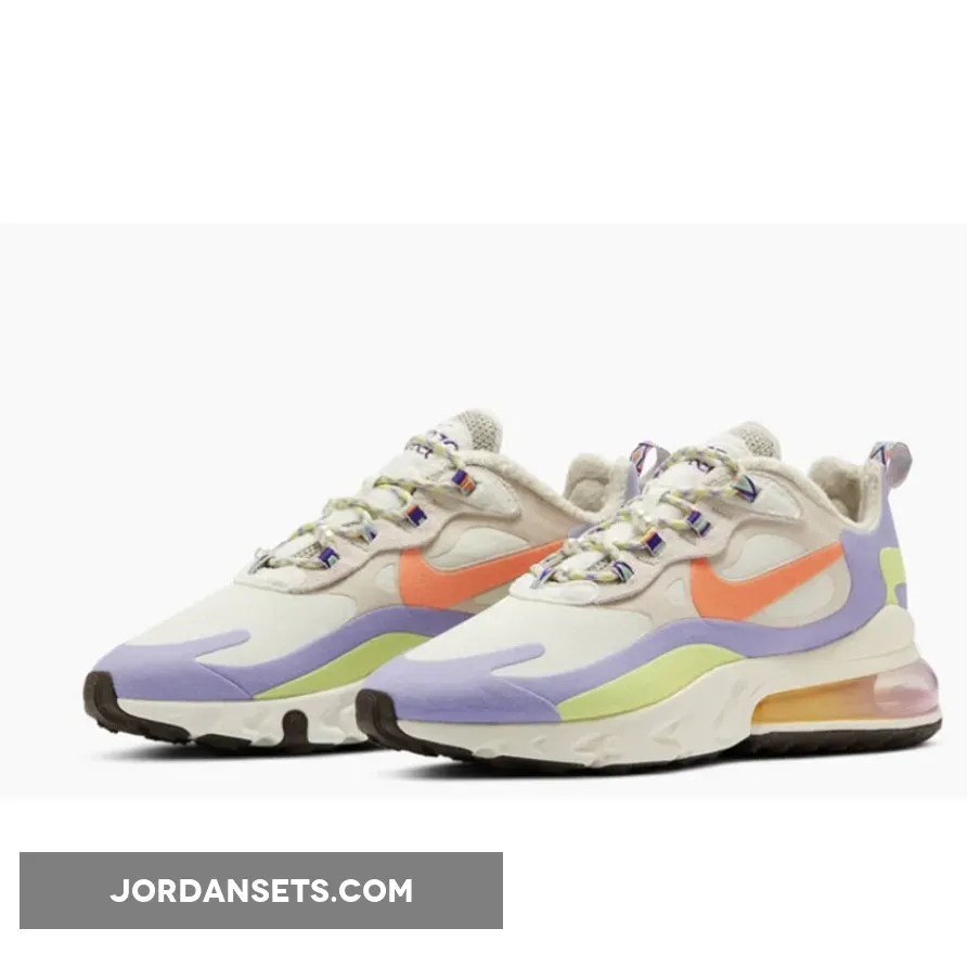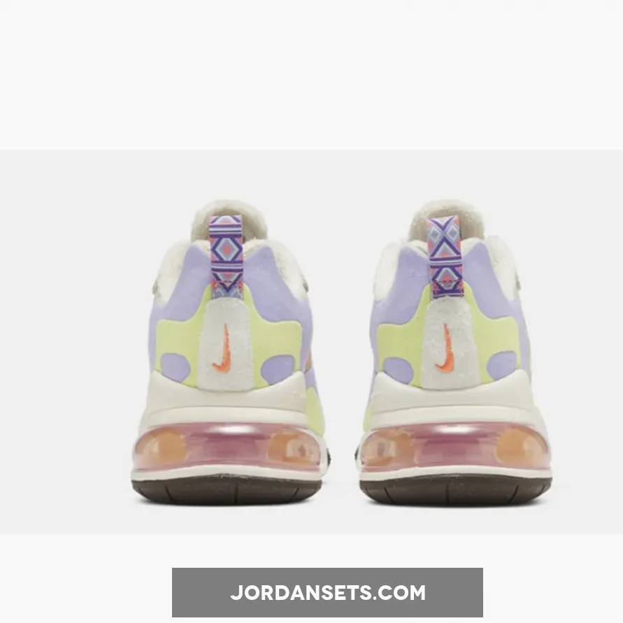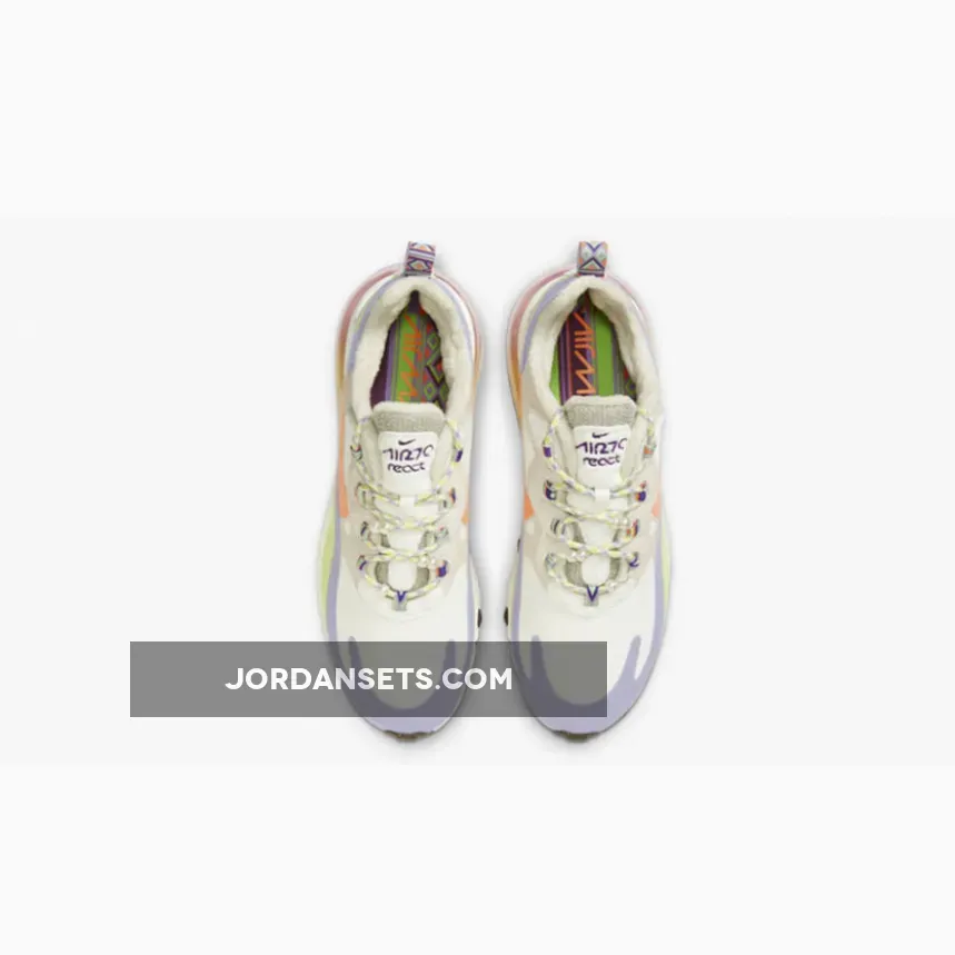 This offering of the Nike Air Max 270 React features a mix of White and Beige covering the upper detailed with pastel Orange, Purple, and Yellow tones. Suede eyelet overlays, pearls spotted throughout the laces, fleece lining to keep warm during the colder months highlighted with a native patterns on the lace loops, heel tab, and insoles.