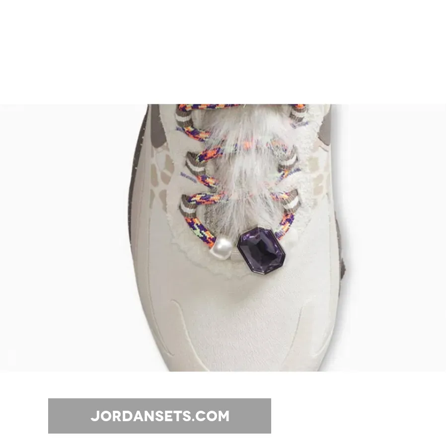 The most outstanding of the offering’s features would undoubtedly be the attached fur that outfits a large section of the instep. Its hairs are wrapped over top by colorful rope laces whose topmost loop is accessorized with a green carabiner and a complementing paracord keychain. What’s more, the vamp brings along the brand’s penchant for jewelry as gems of emerald, orange, and purple shades are used as if dubraes. A light tan then lies underneath in two fashions: one a more flat, unblemished finish and the other an eccentric mosaic of animal print. Speckled soles then draw just below, volt accents the model’s matted Air unit, and terry cloth warms from within.