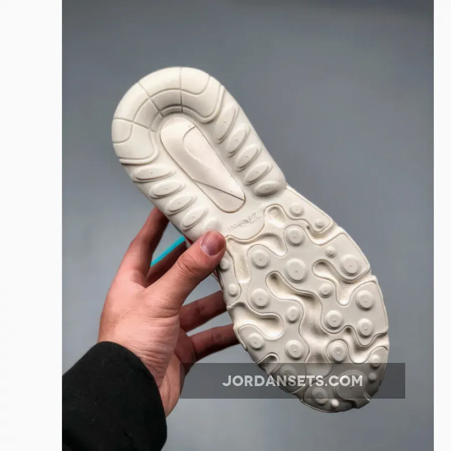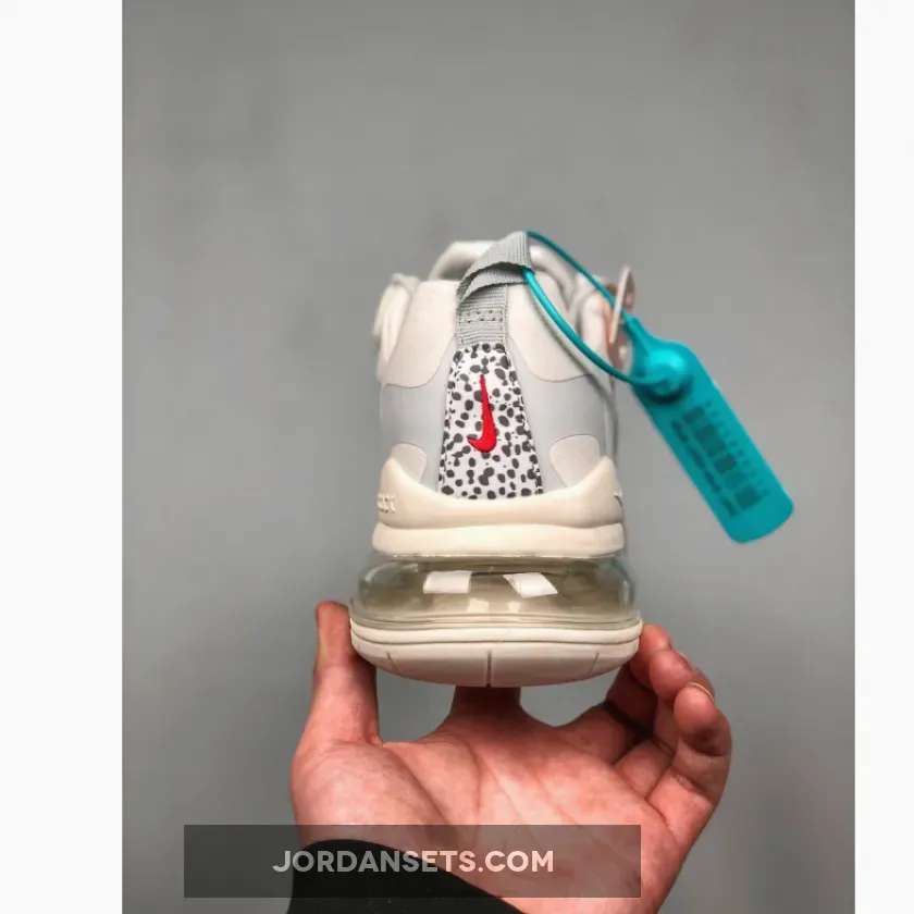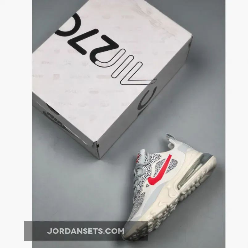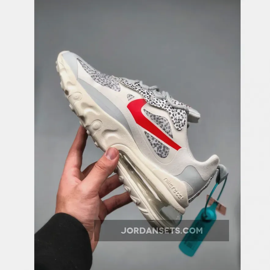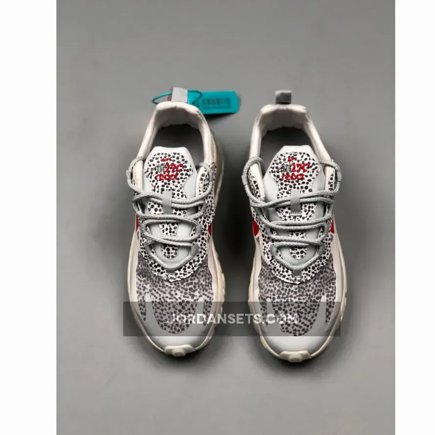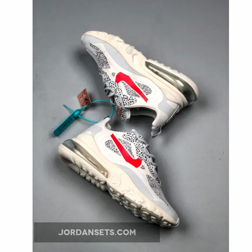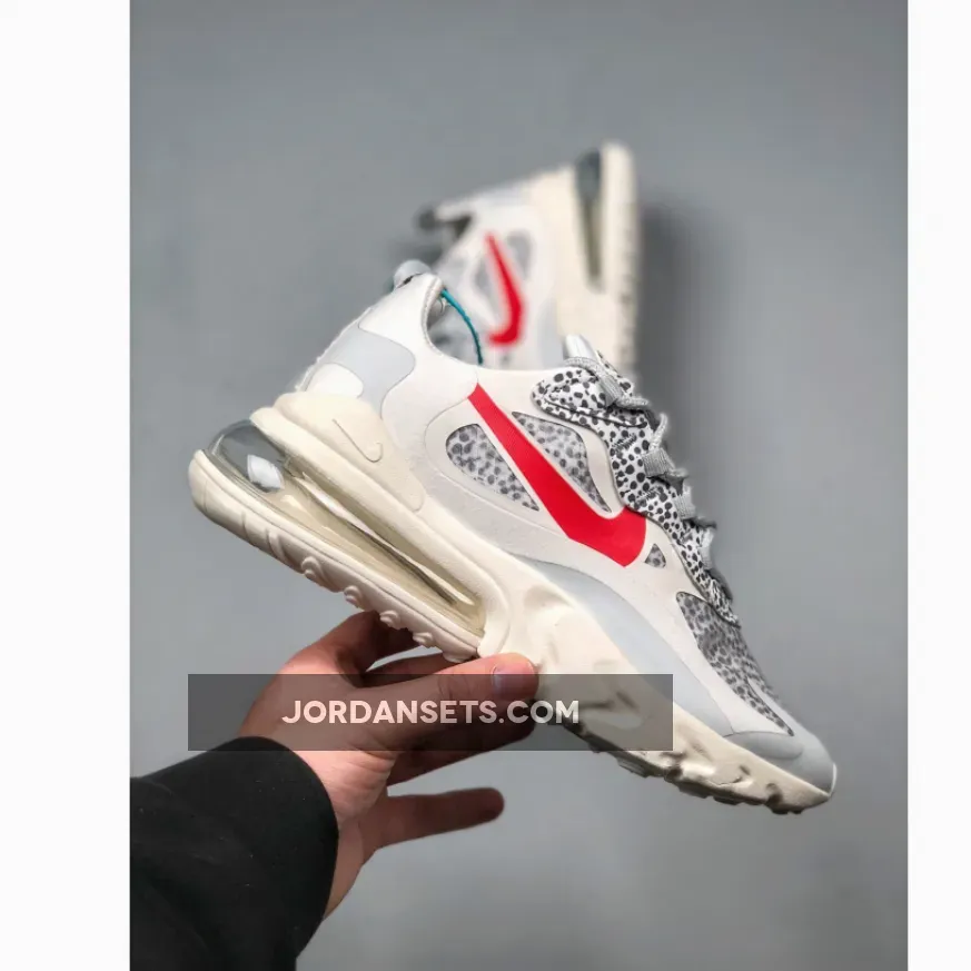 This offering of the shoe features a White upper with Safari patterns on the tongues, lacestays, heels, and underlays on the translucent toe and side panels. Red contrasting accents are used on the tongue and Swoosh logo atop a White React cushioned sole.