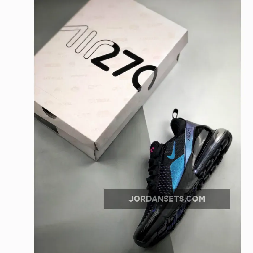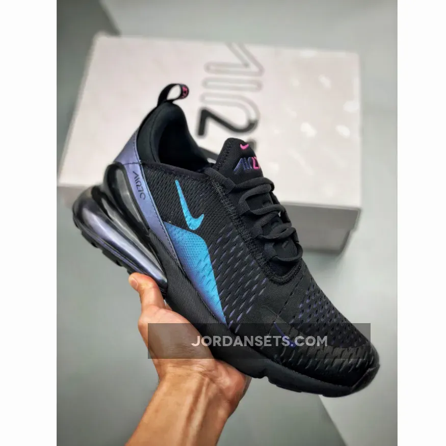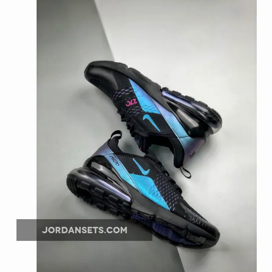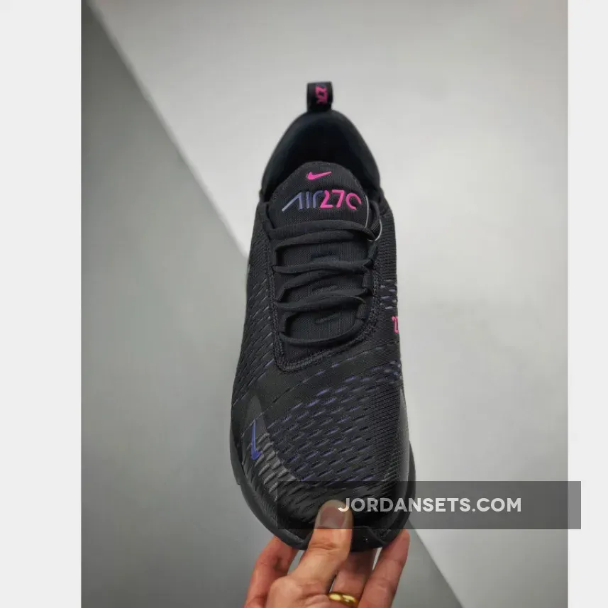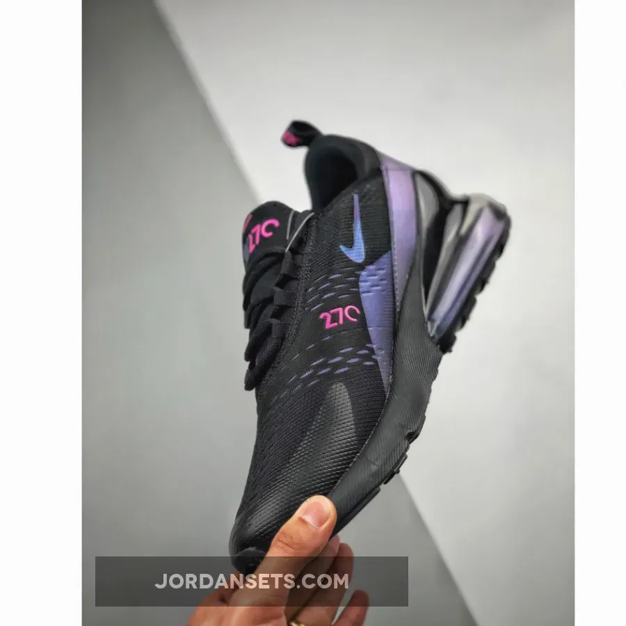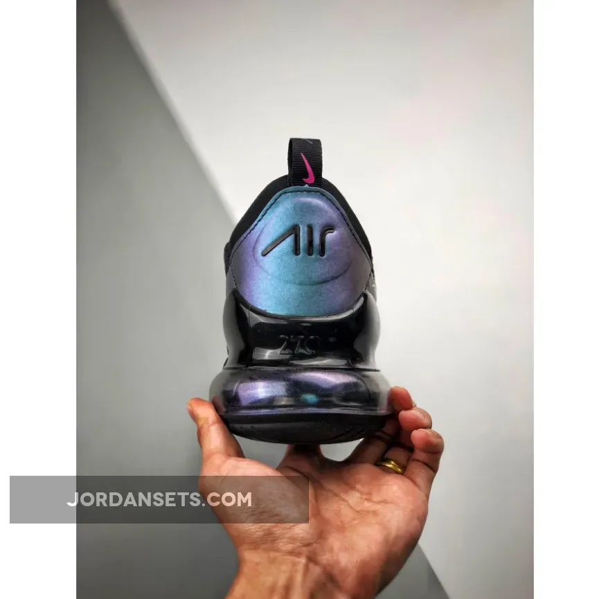 This Nike Air Max 270 features a Black-based upper paired with Regency Purple detailing and iridescent synthetic overlays and heels. Adding for a nice contrast are Laser Fuchsia accents throughout.