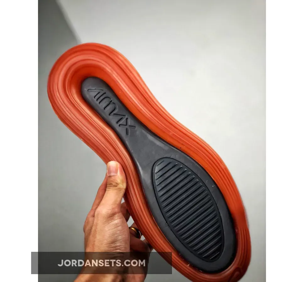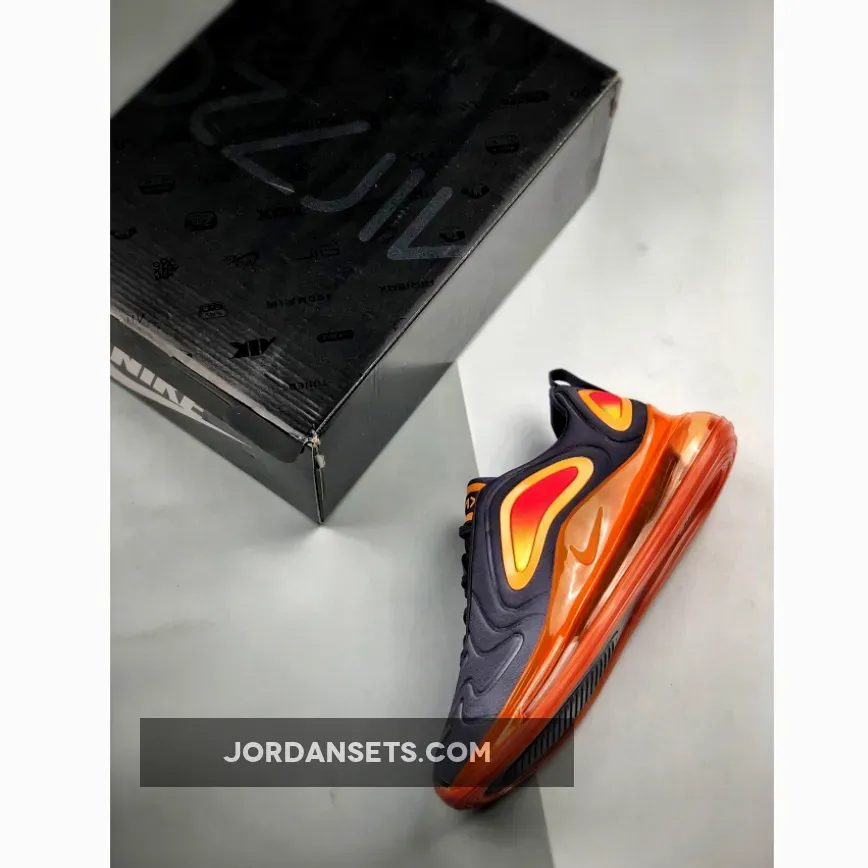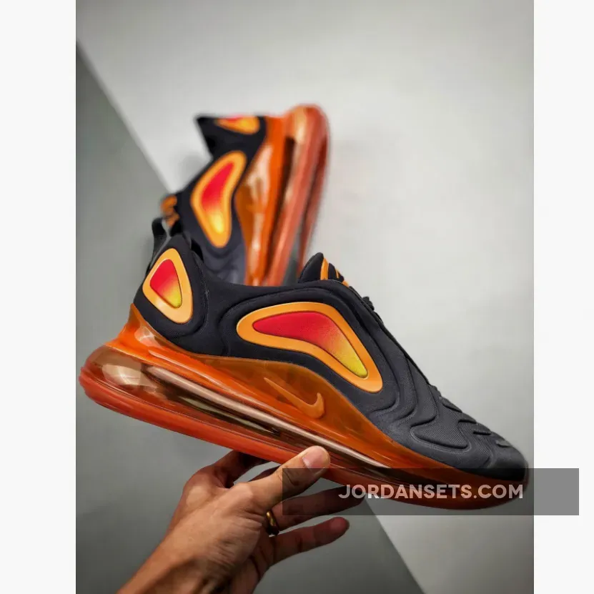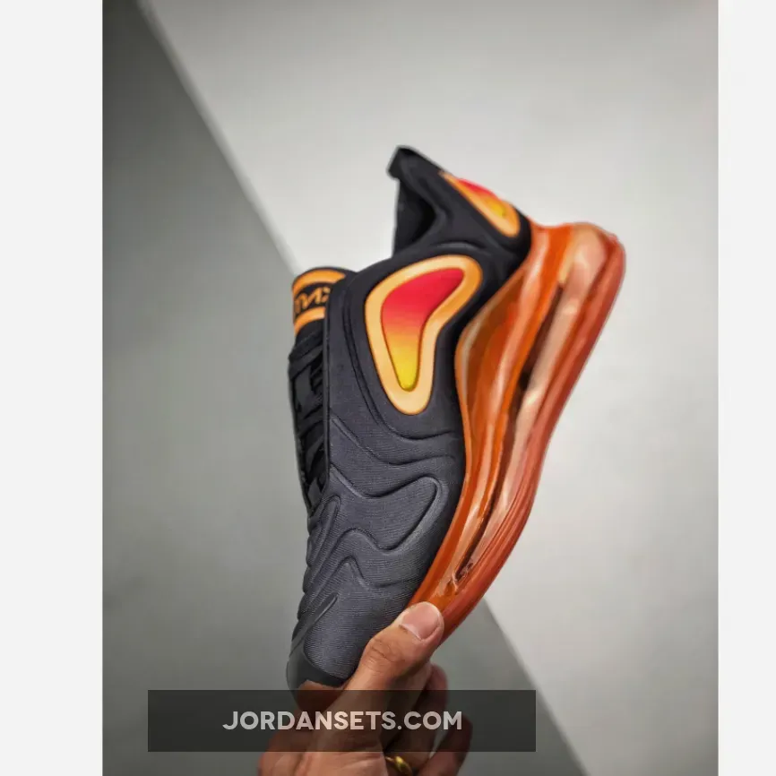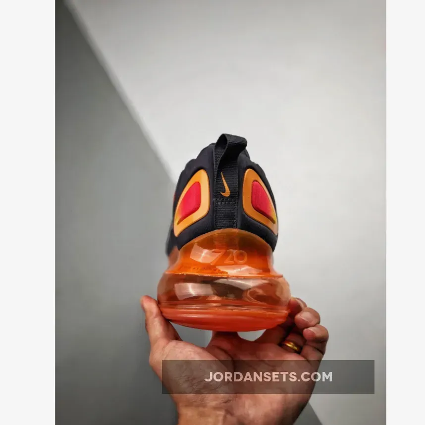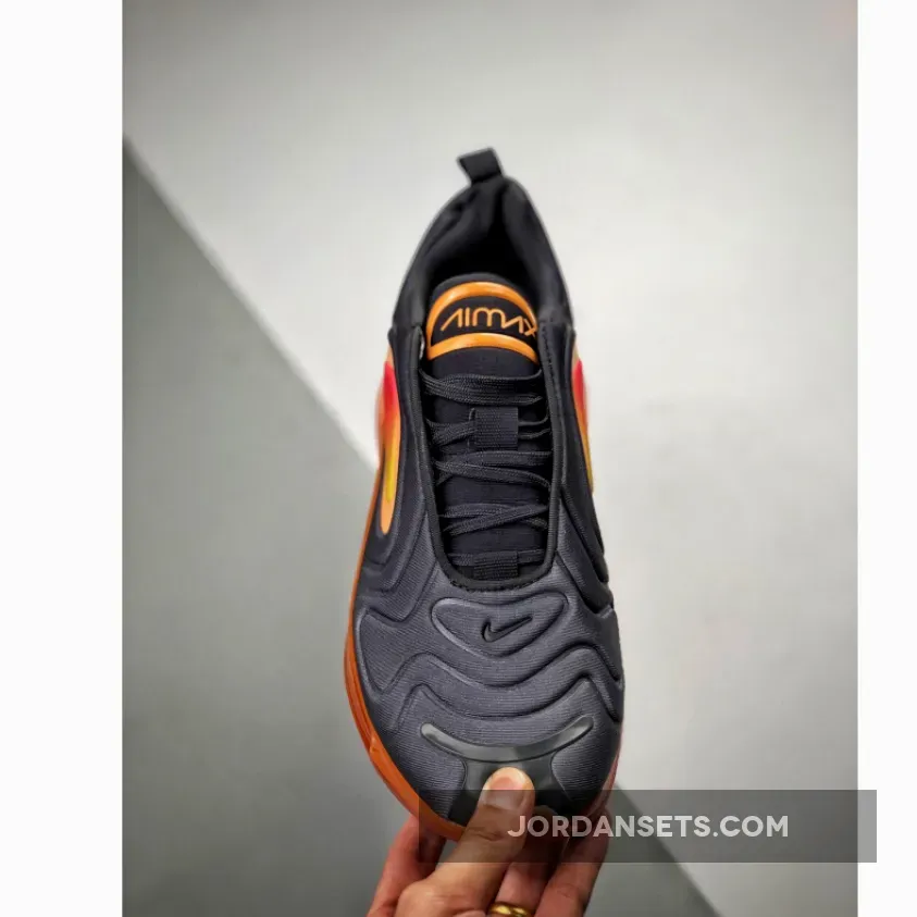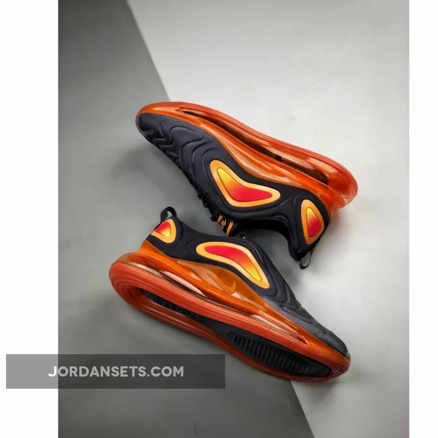 Dressed in a Black, Fuel Orange, Orange Pulse, and Yellow Pulse color scheme. This Nike Air Max 720 features a Black upper covered in Orange hues with hints of Yellow contrasted in a gradient effect on the overlays.
