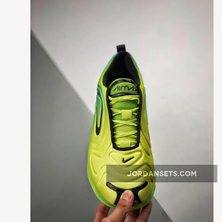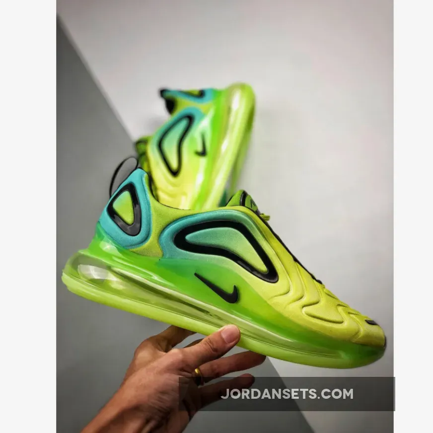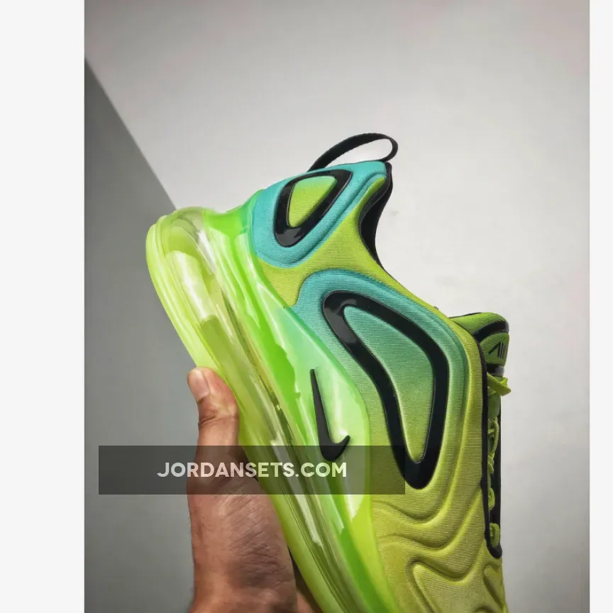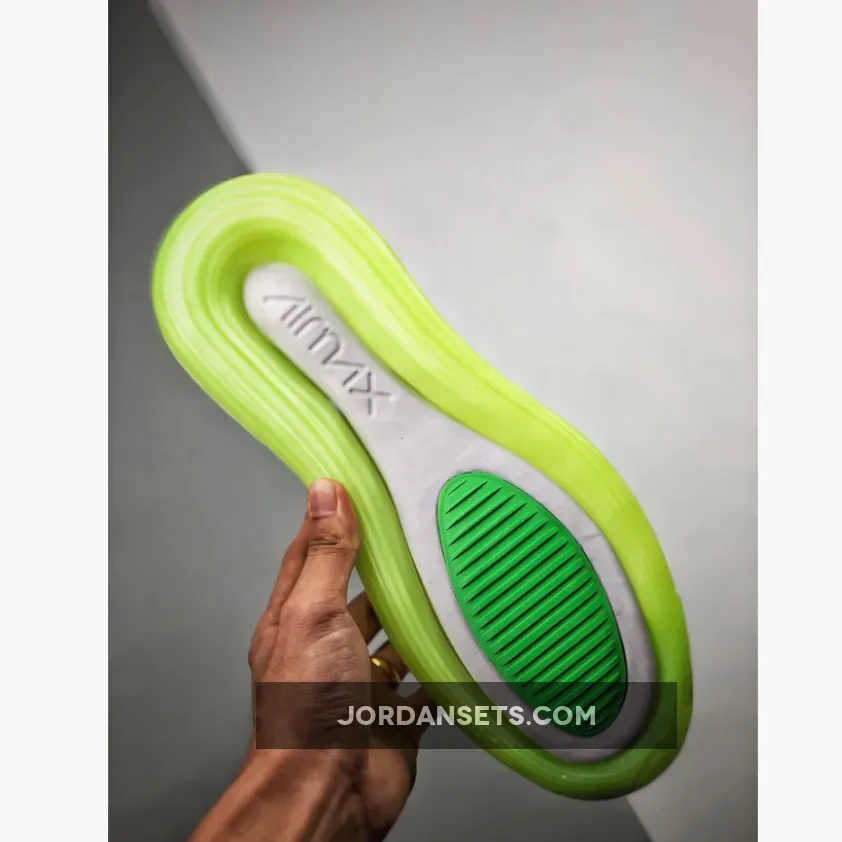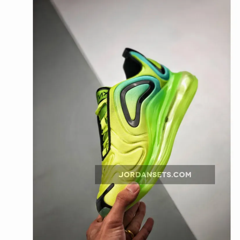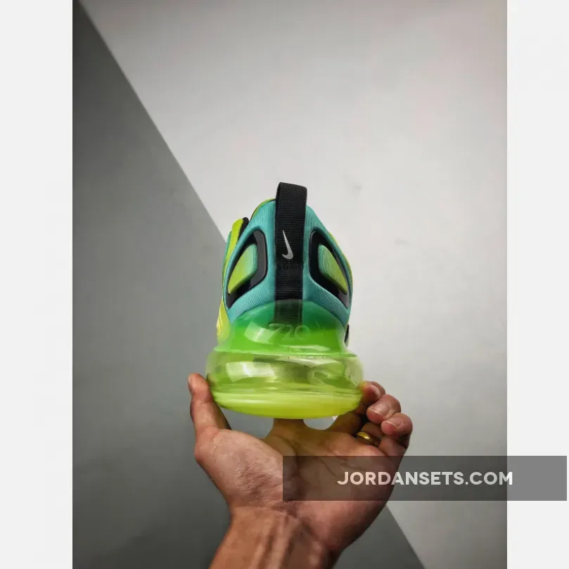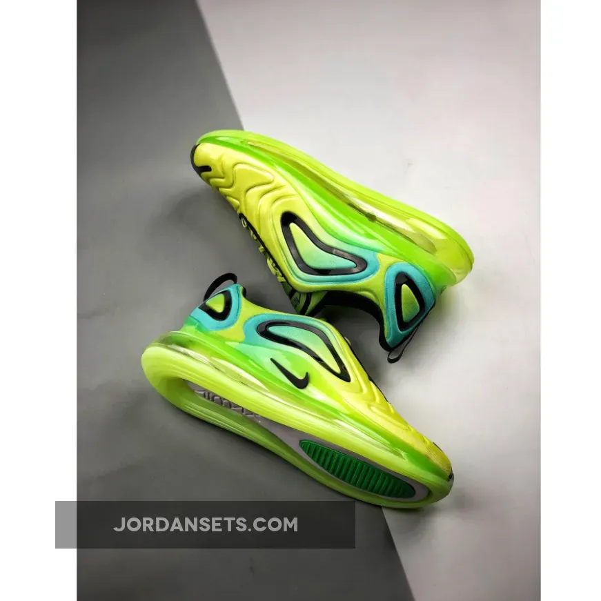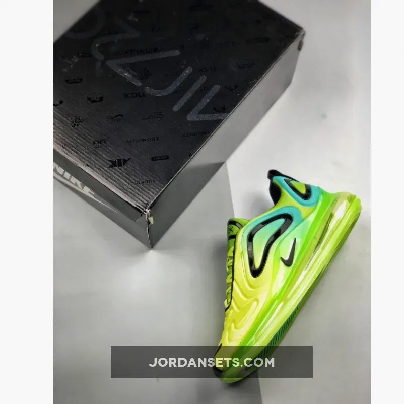 This offering is as bright as it gets dressed in a Volt, Black, Bordeaux, and Space Glow color scheme. Its entire upper is done in a mix of Volt and Fluorescent Green with Black overlays atop the models signature Air Max sole unit.