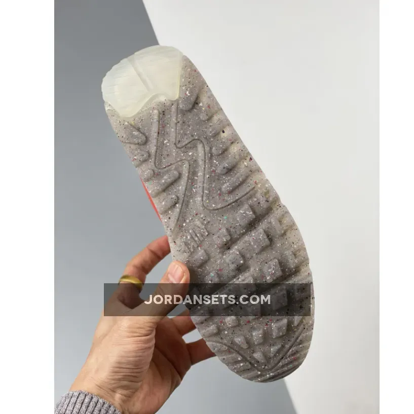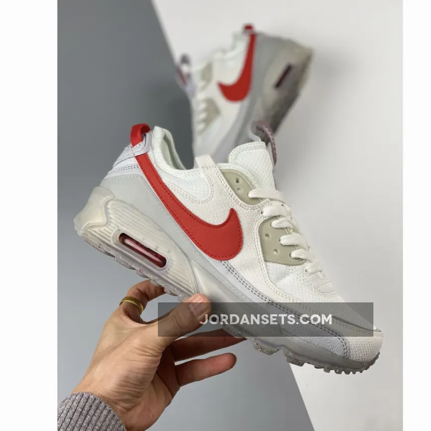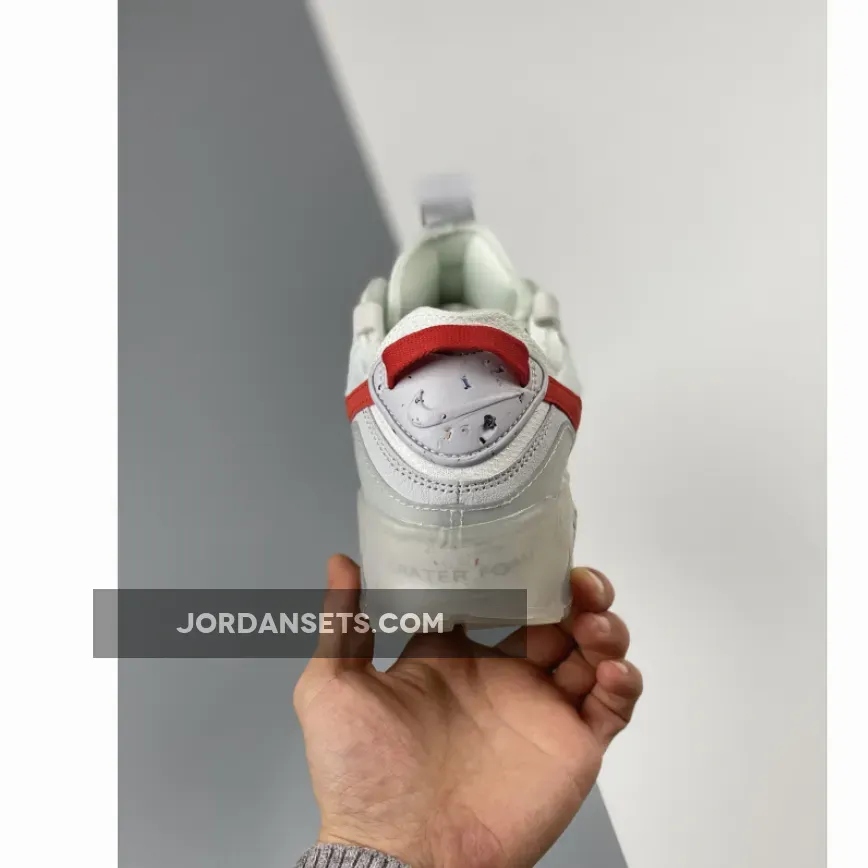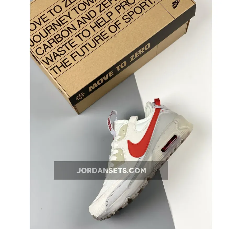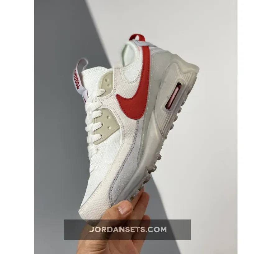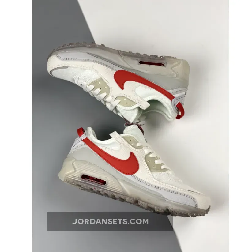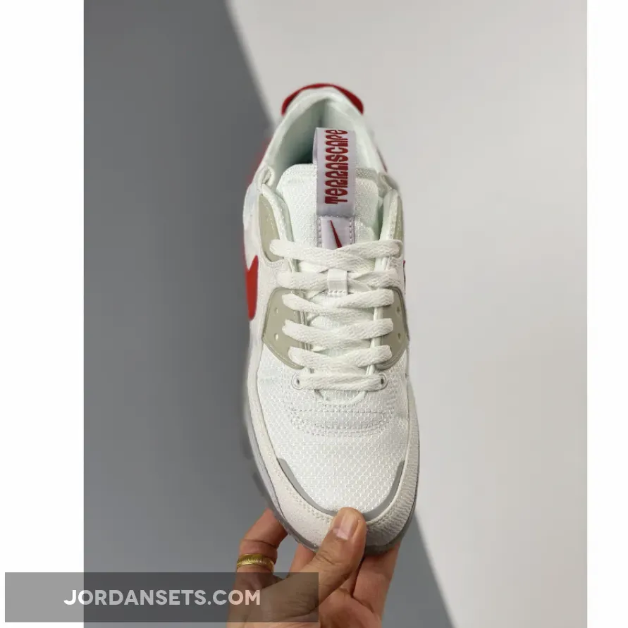 Retro-looking yet thoroughly modern when it comes to its construction, the Nike Air Max 90 Terrascape Gym Red is a truly unique must-have pair. It starts off with a bright white breathable mesh base. On top, is a smoke-coloured synthetic overlay, a white textured cage, and a grey smooth leather mudguard. Thanks to this layered, monochromatic base, the bold red Swooshes and tongue tab become even more eye-catching. It’s a shoe that offers sustainability without sacrificing style.
