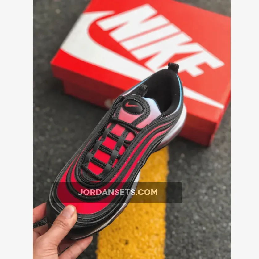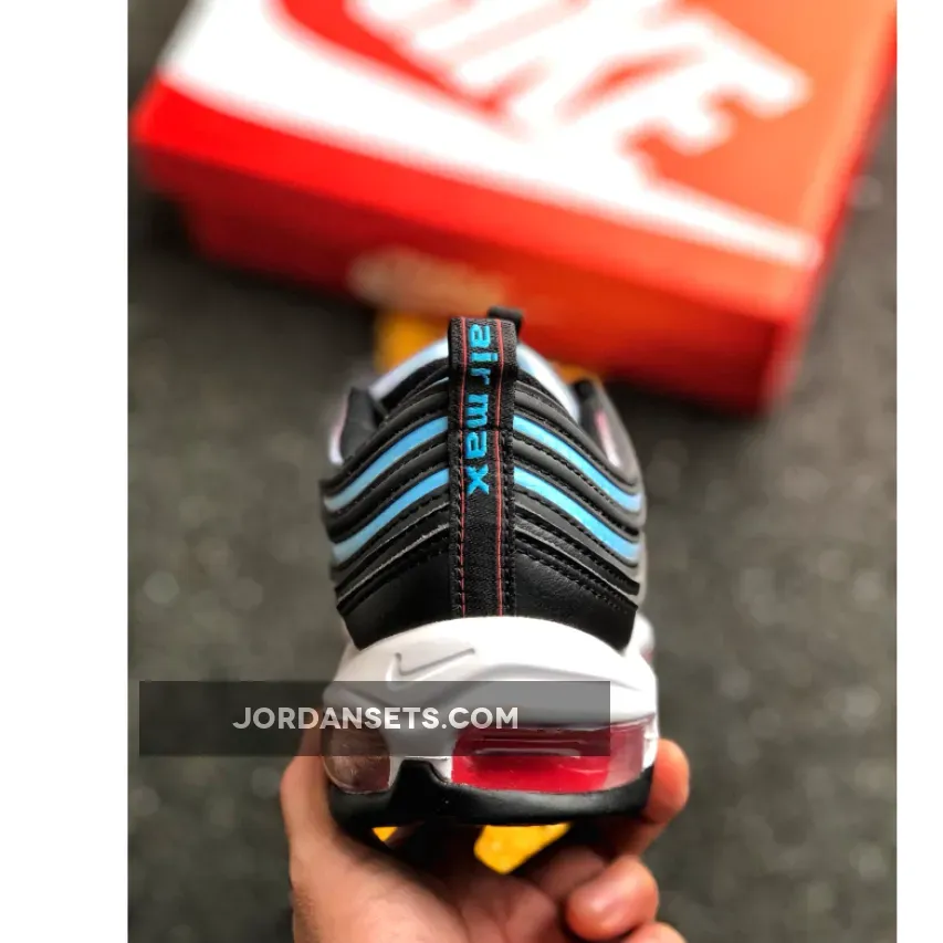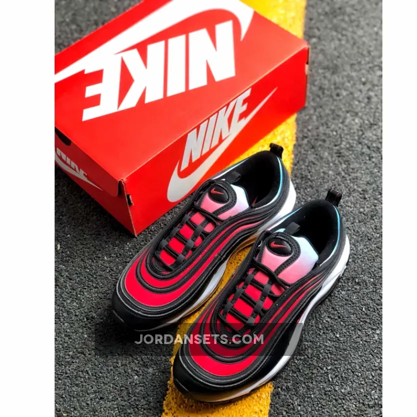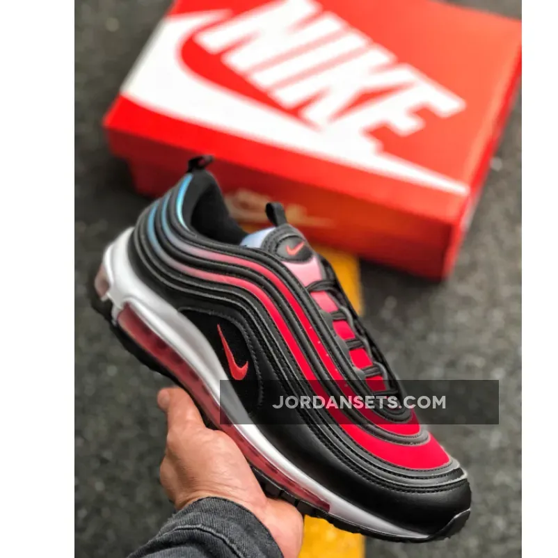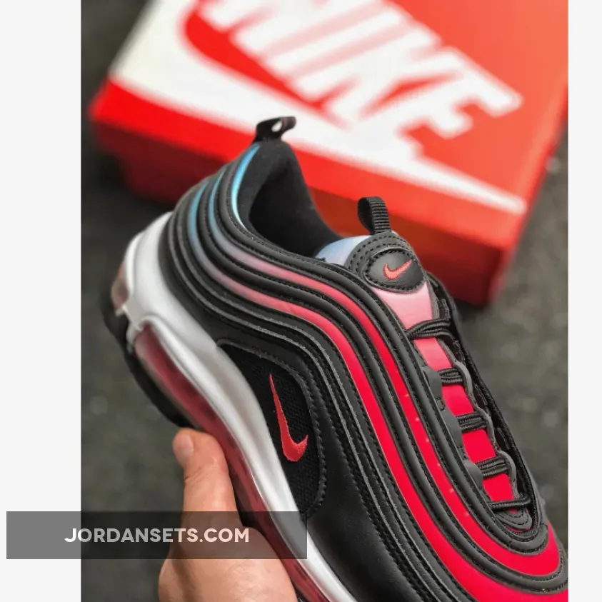 Dressed in a Black, Ember Glow, White, and Blue Fury color scheme. This Nike Air Max 97 features a Black leather upper highlighted with gradient colors on the underlays and tongues. A White midsole, Bright Red air bubbles atop a Black rubber outsole completes the design.