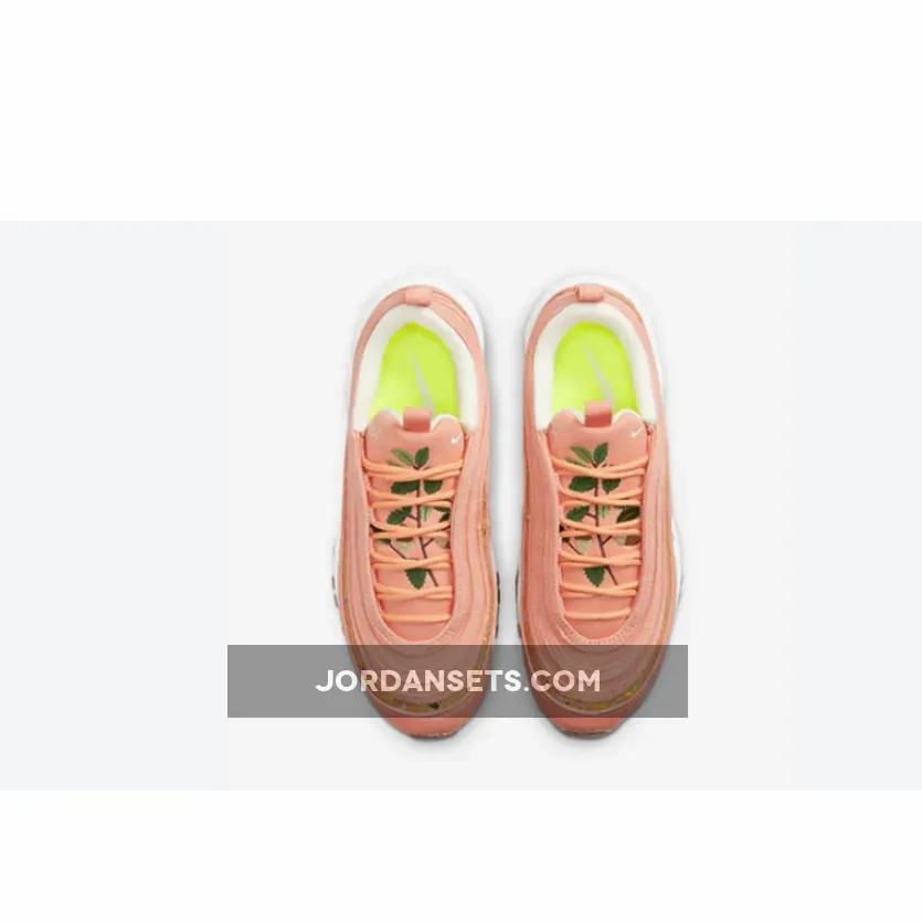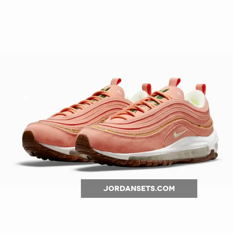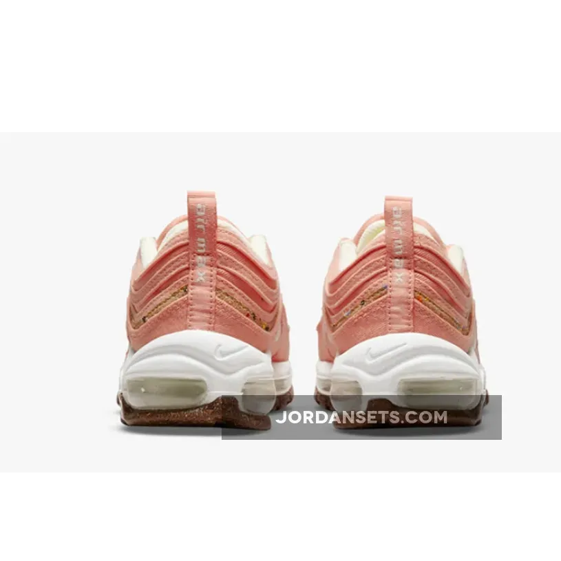 The recycled canvas upper in the Air Max 97’s signature wavy design is dressed up in the titular pink but in a more coral shade. The only exception is one layer of paint-speckled cork. When viewed from the top, you’ll see an embroidered cork plant on the tongues. The mid-panel window features a dainty embroidered white mini Swoosh. The mini Swoosh is repeated on one corner of the tongue. The full-length Air unit that has been a standard on the Air Max 97 has a transparent cassette featuring the white construction inside.