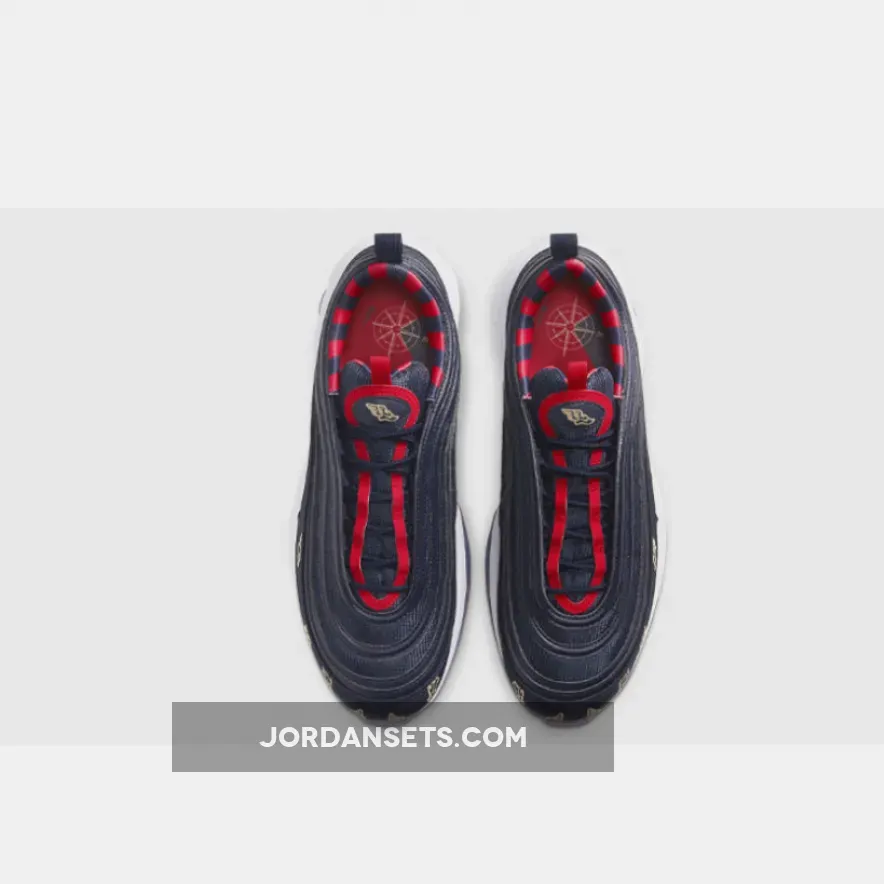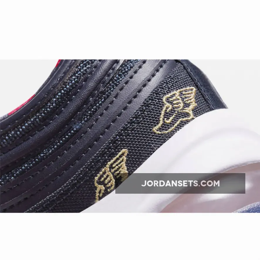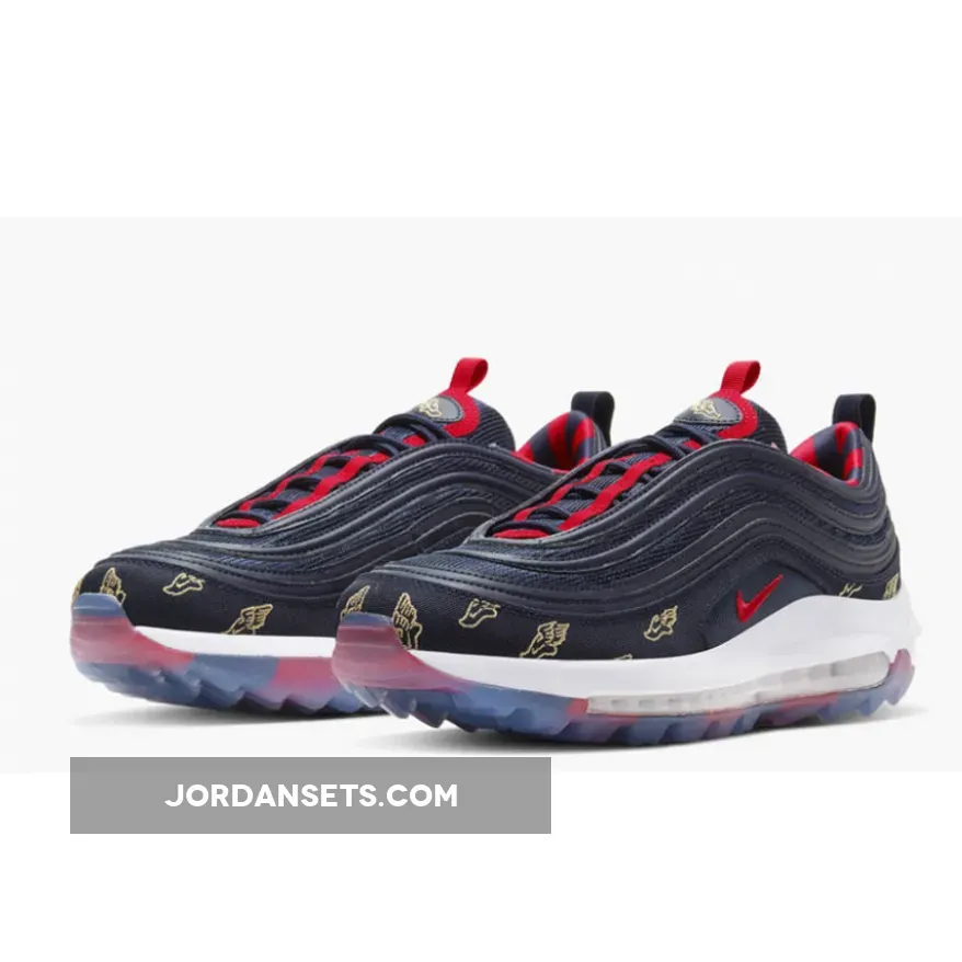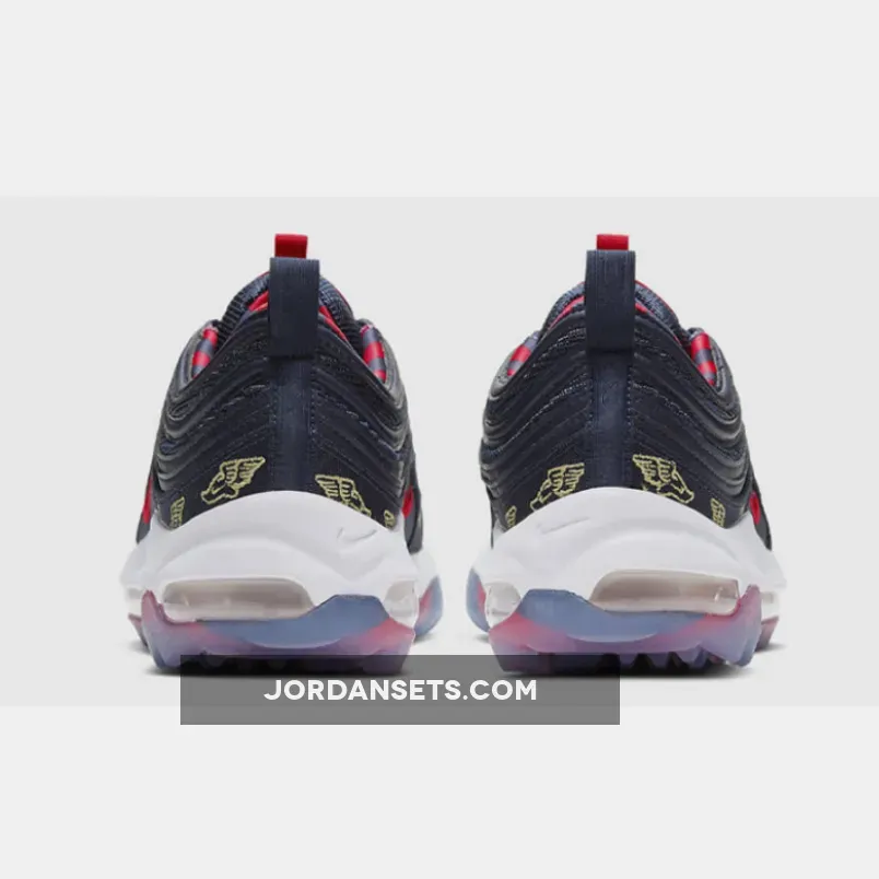 .Initially released in 1997, the Air Max 97 went off the radar for some time and returned in 2016 with the OG Silver Bullet colourway. The forthcoming pair posses Golf technology features that are nothing but more than perfect to score an ace on the golf course. Attired with a navy colour scheme, a combination of red and gold accents appear throughout the silhouette. It’s upper showcases a premium leather material and textured mesh for a cutting-edge look. Gold-toned embroidery repeatedly makes its appearance on the mudguards in the symbol of “The Talaria of Mercury”, an emblem of the winged sandals worn by Hermes as the fastest messenger of the great Olympian Gods. All this sits atop a full-length Nike Air unit that provides ultra comfort and cushioning. While you’re here, be sure to browse our latest release page for your daily footwear fix.