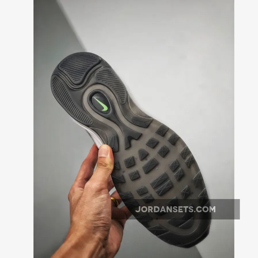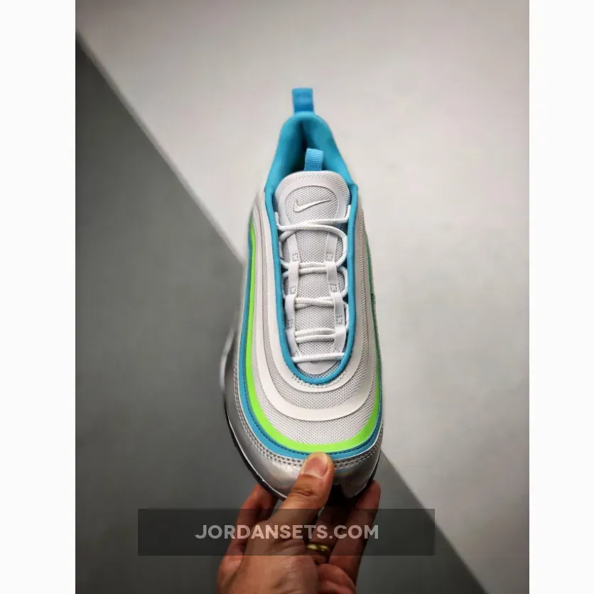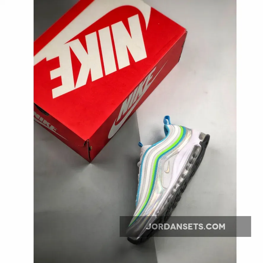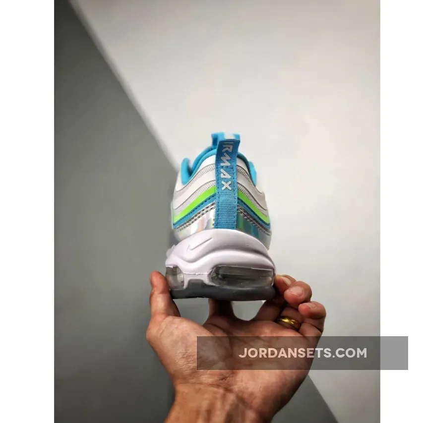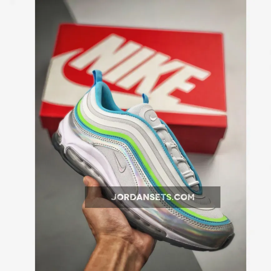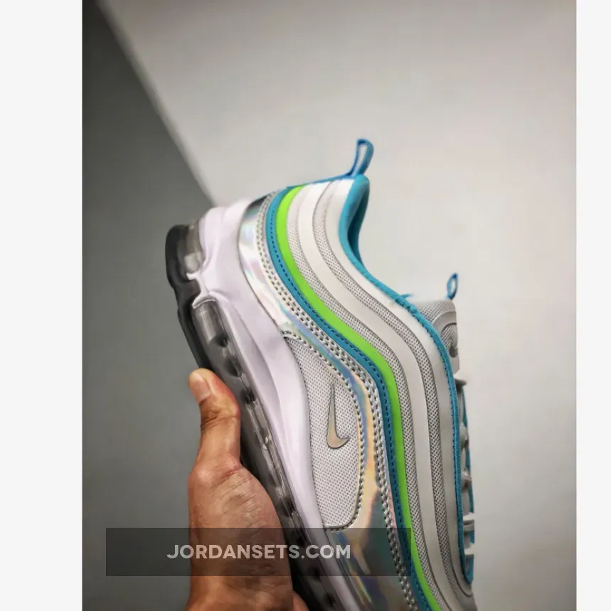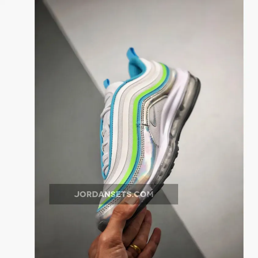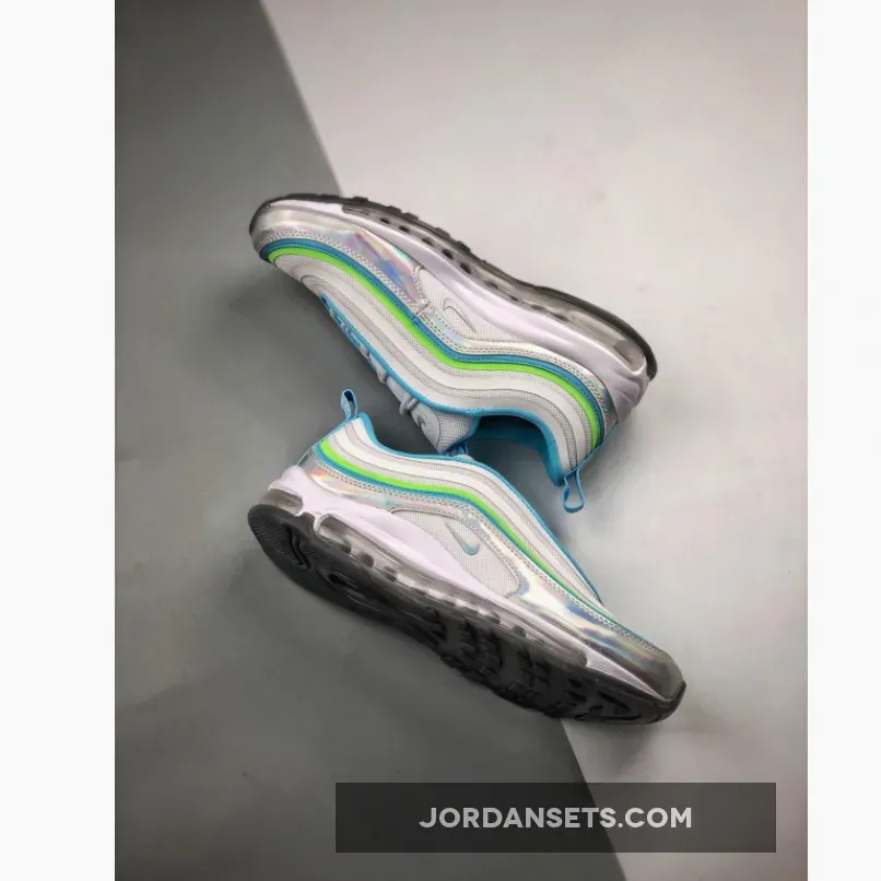 As you can see this Nike Air Max 97 features a shimmering iridescent across the mudguard which displays various shades. We also have White across the upper, Blue and Light Green. Other details includes White on the midsole and Air Max unit while a Grey smokey translucent outsole finishes the look.