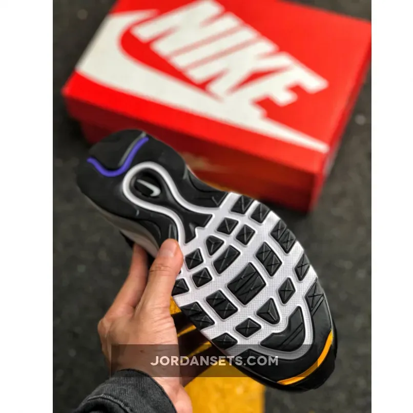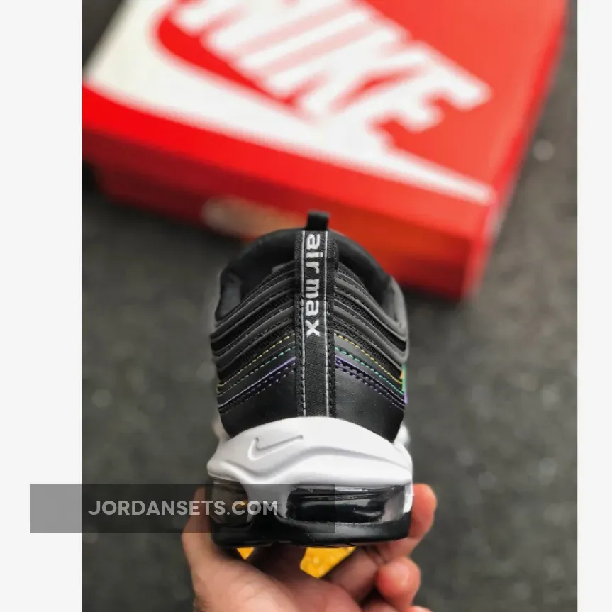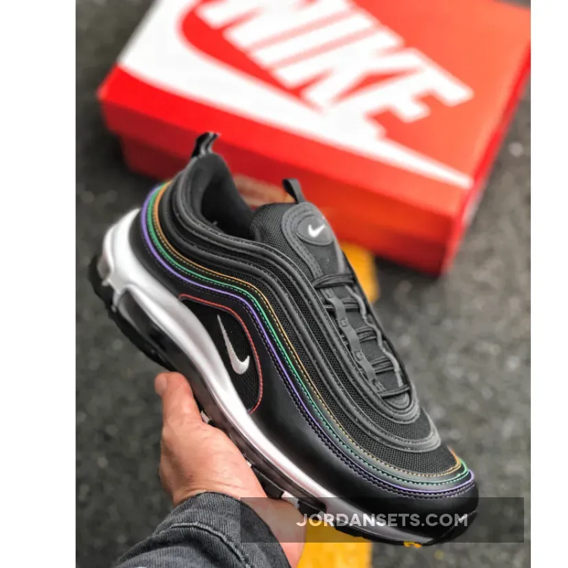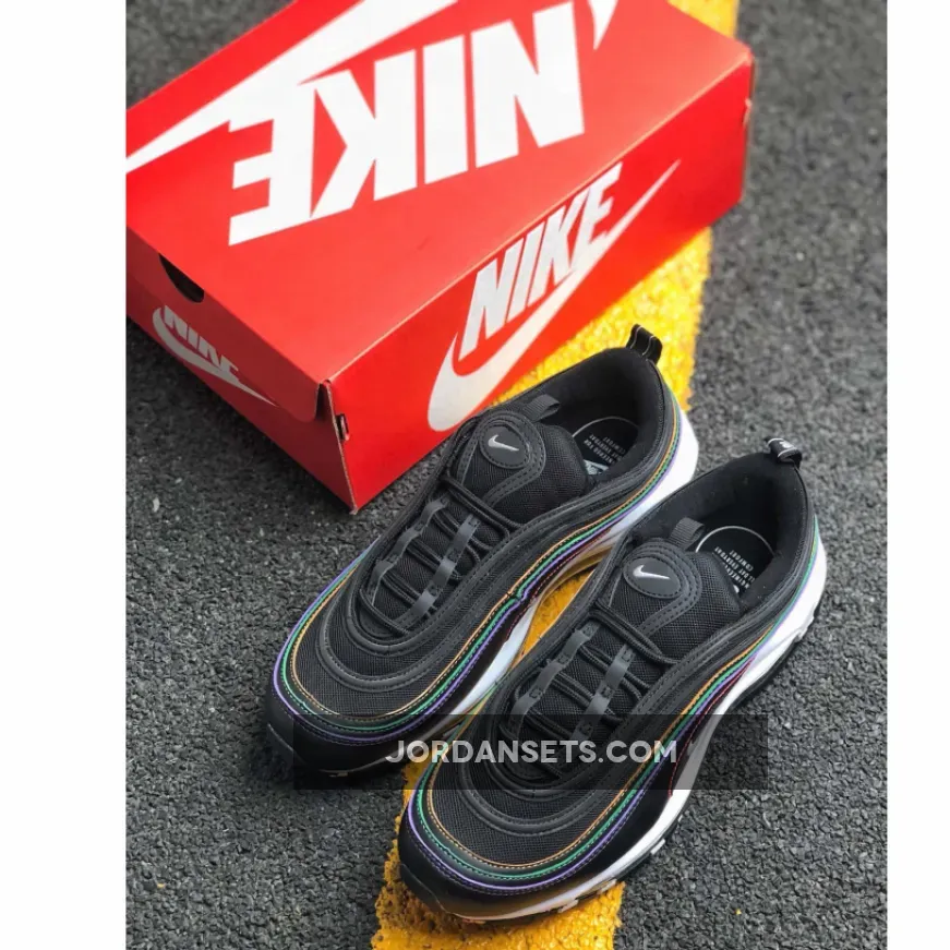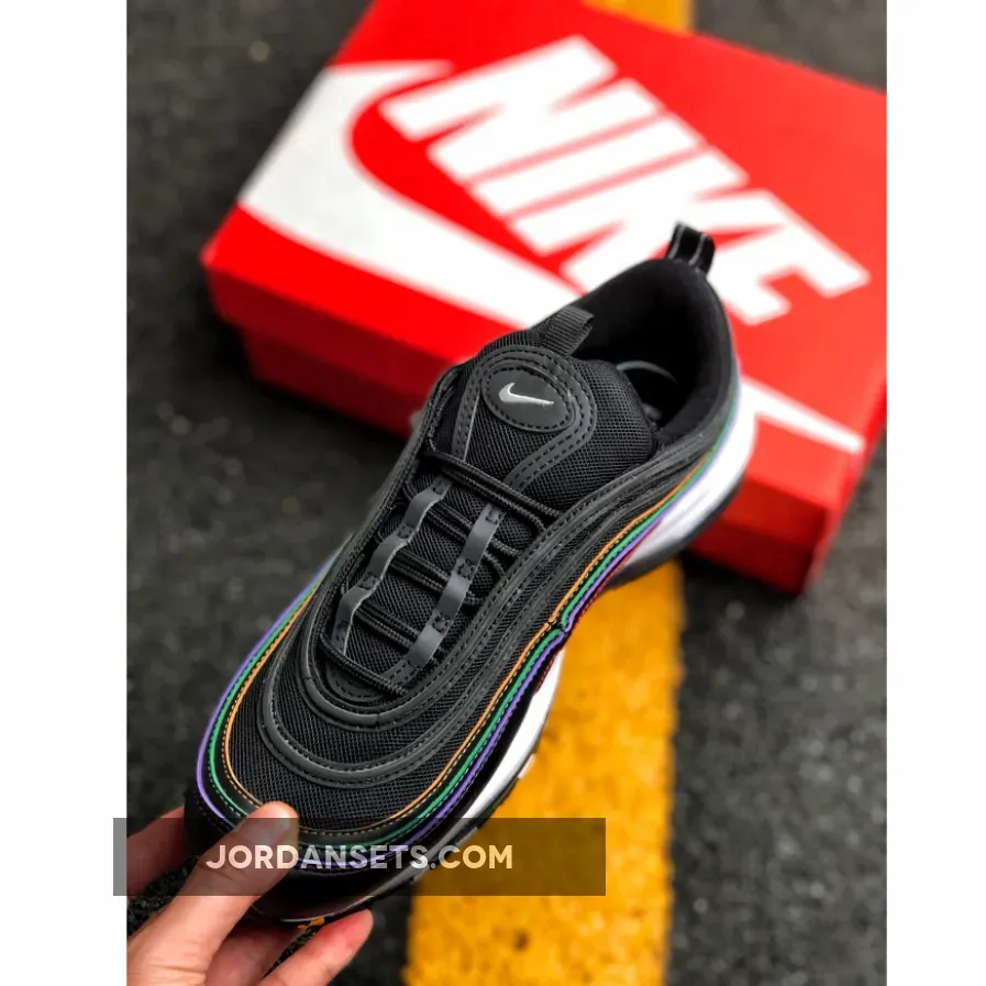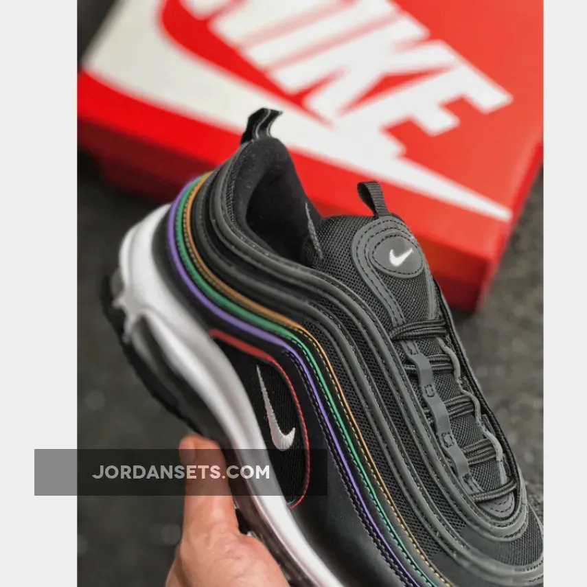 This Nike Air Max 97 features a Black leather and mesh upper atop a White midsole and Black rubber outsole. Highlighting the shoe are multicolored stitching in Yellow, Green, Purple, and Pink hues to complete the design.