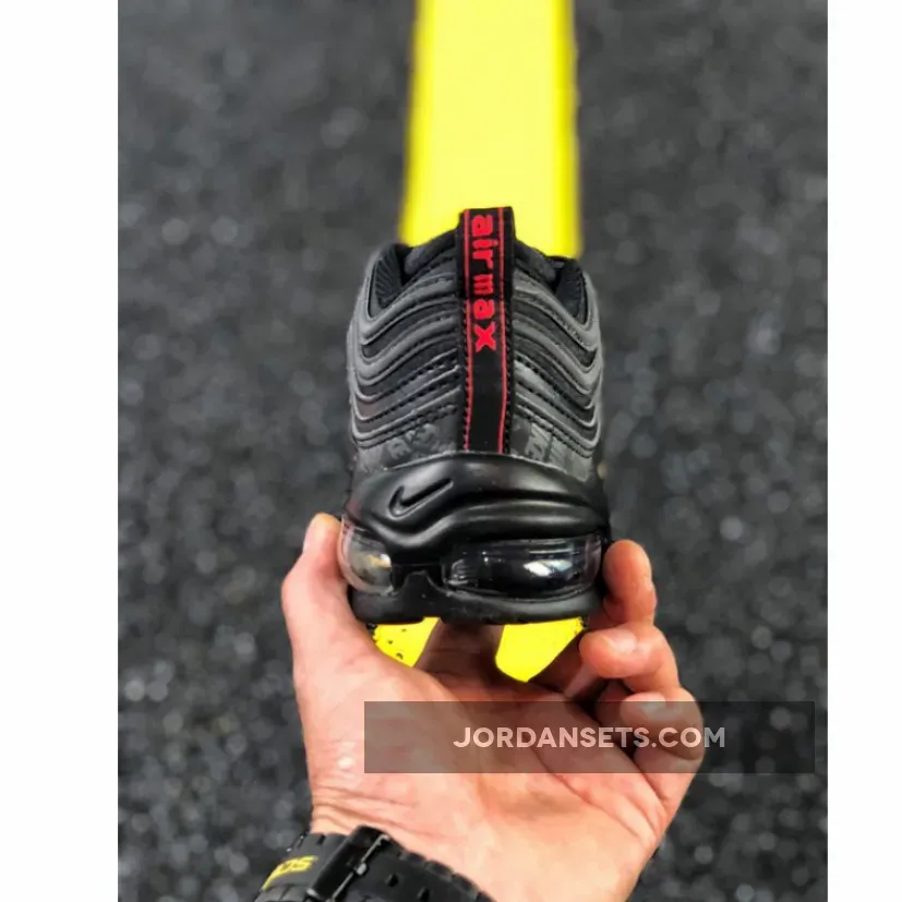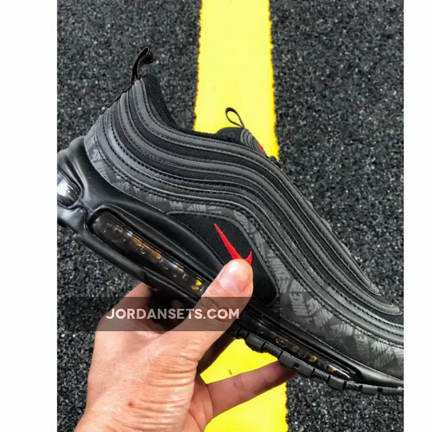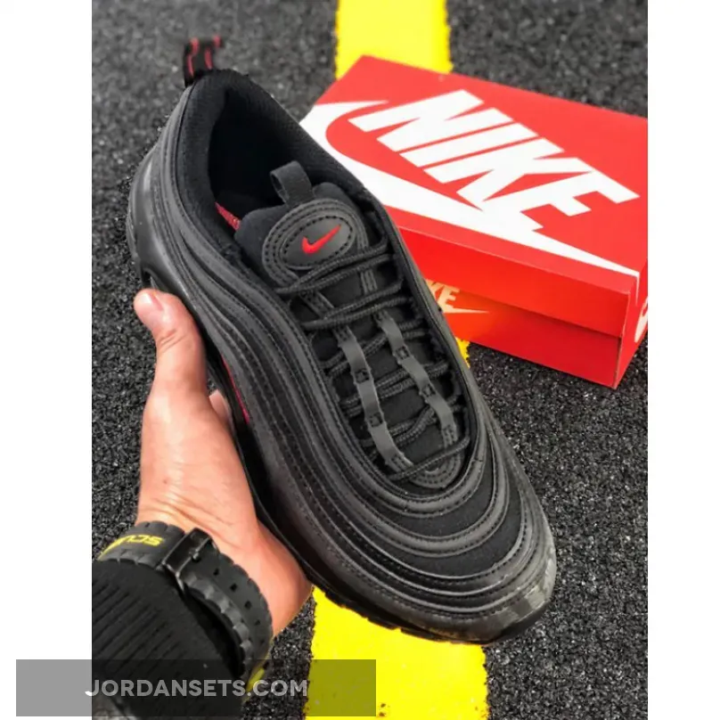 Inspired by the famous Japanese bullet trains, the Nike Air Max 97 Black Red is one of the most versatile sneakers out there. Painted in a murdered out colourway, contrasting red accents hit the Swoosh logos and the heel tab for a stealthy aesthetic. Finely crafted from premium leather and breathable mesh, this AM97 sits atop a blacked out Air Max bubble unit for additional comfort and a smoother stride.