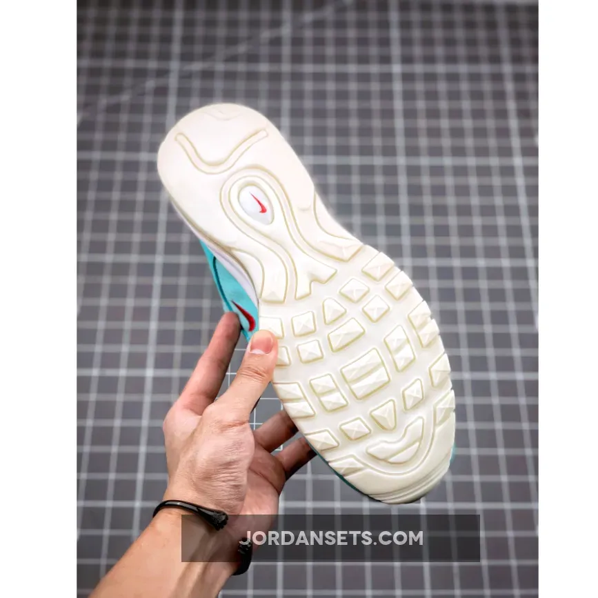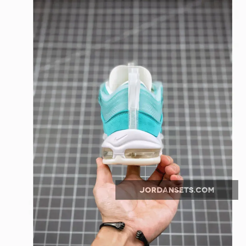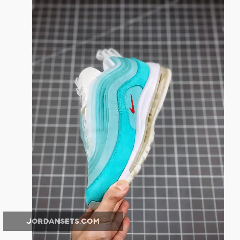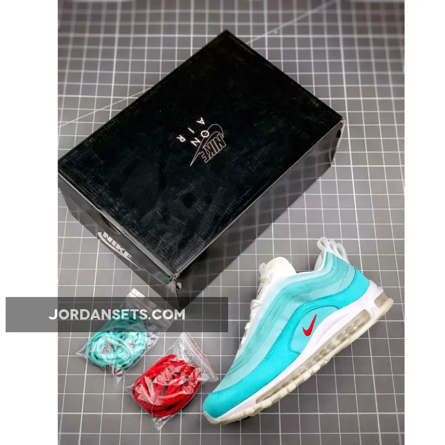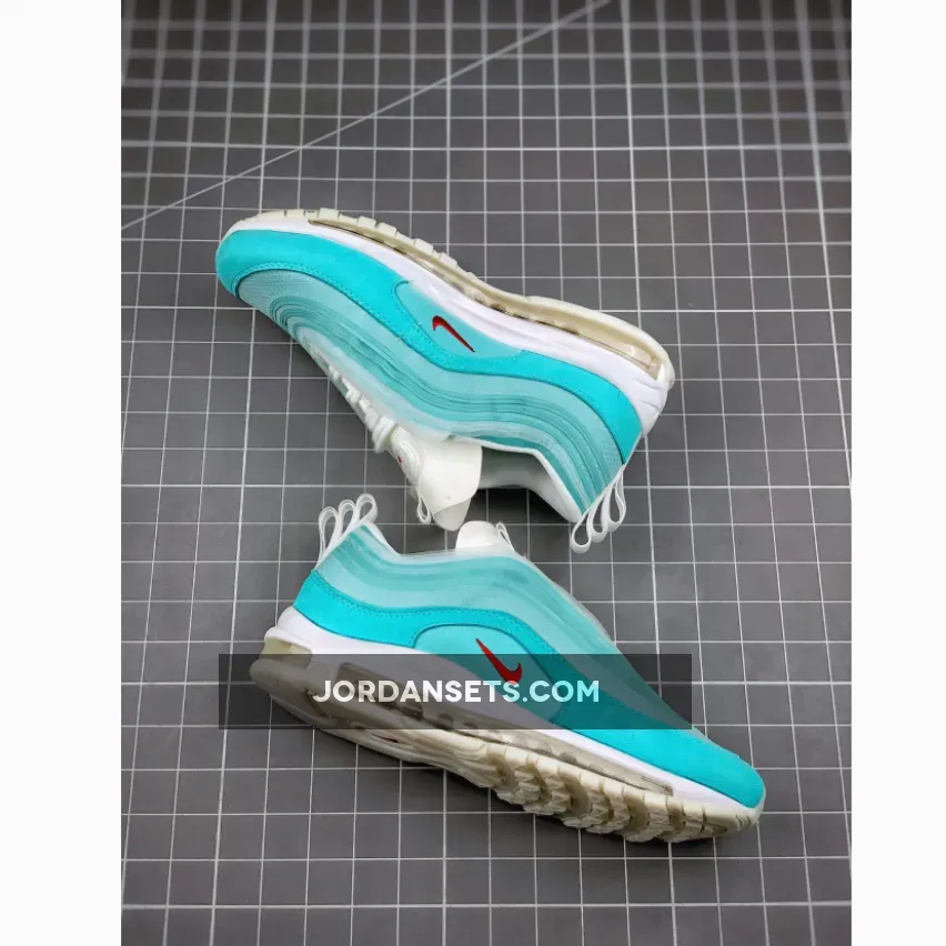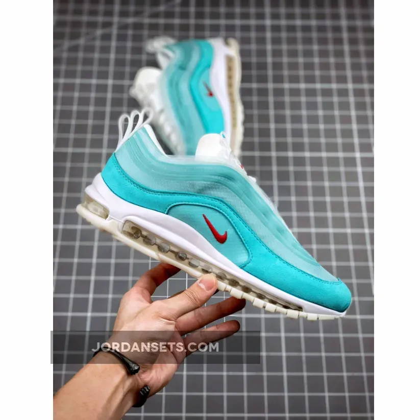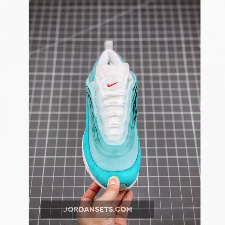 this Nike Air Max 97 features multi-layered upper which is paired with a Blue translucent upper, suede on the mudguard and White accents. In addition we have Red branding on the tongue and panel. Following we have multiple tongue and heel pull tabs, White placed within the Air Max unit and three Swoosh logos on the insoles.