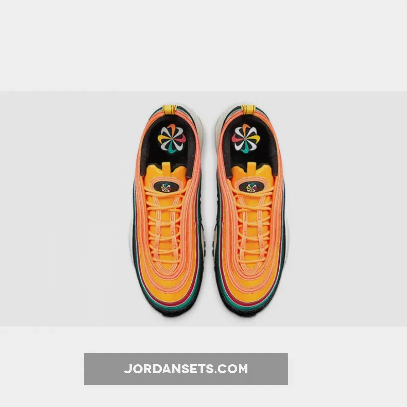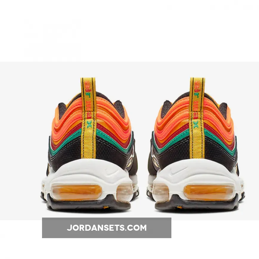 The Sunburst logo was developed in 1972 while considering how to translate the asymmetry of a single Swoosh to apparel. The circular nature of the design allowed for club names to be arched over it — a regular conceit in collegiate and sportswear graphics of the era. Dressed in a Black, University Gold, and Lucid Green color scheme. This Nike Air Max 97 features a Golden Yellow upper paired with Orange, Red, and Green tones on its wavy overlays.