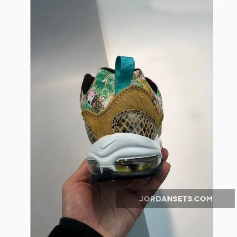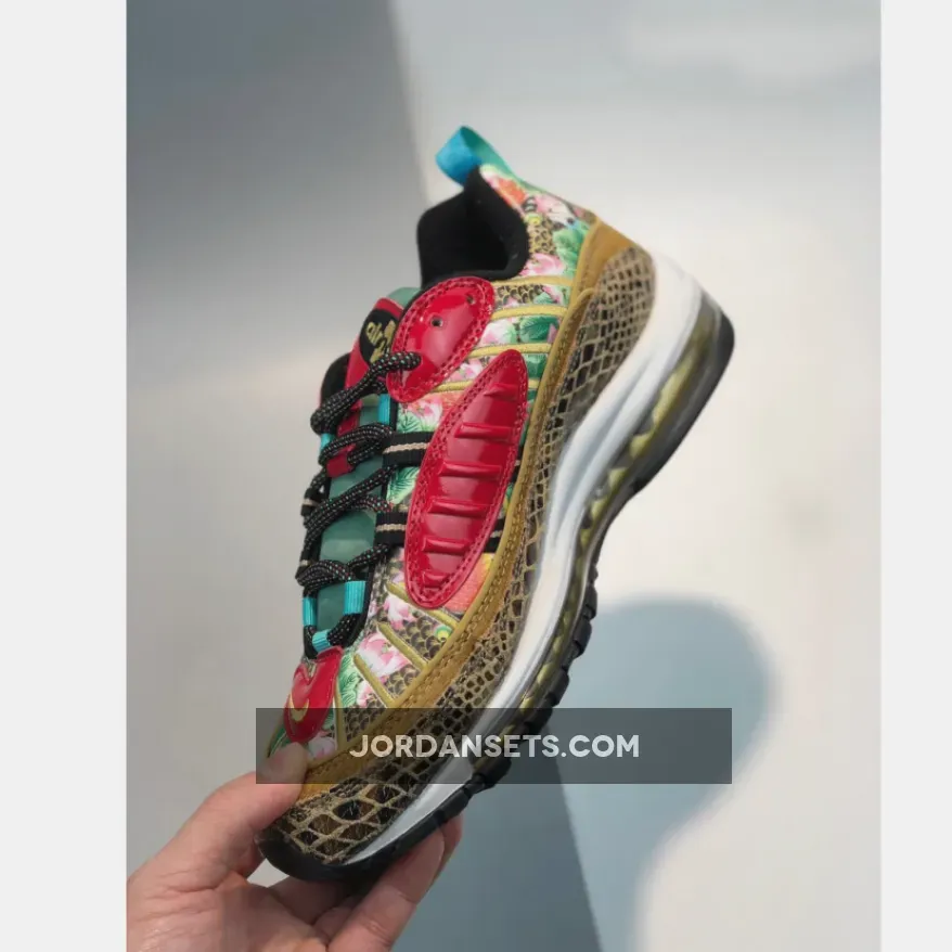 Having a similar pattern as the “Tianjin” Foamposites from 2015, this Nike Air Max 98 features lotus flowers and Chinese artwork on its upper. Below on the sides is a mix of some exotic materials like pony hair and snakeskin, while having Red patent leather detailing and Teal accents. Reflective racing stripe, Gold hits, speckled thick rope laces atop a White midsole and Black rubber outsole displaying praying hands completes the design.