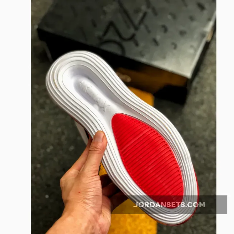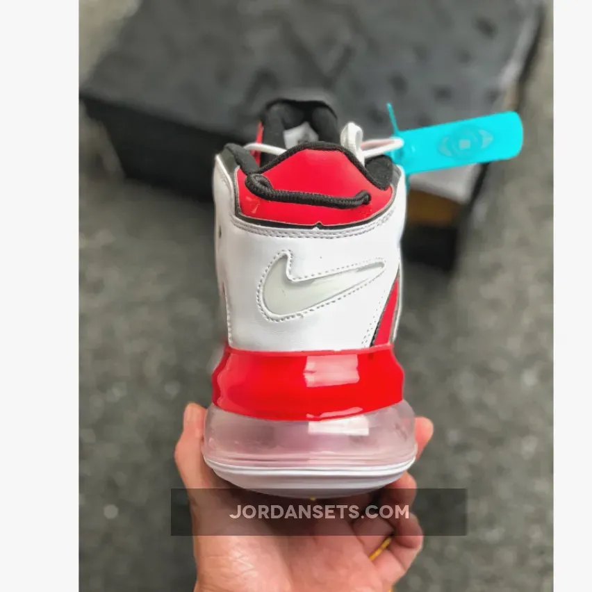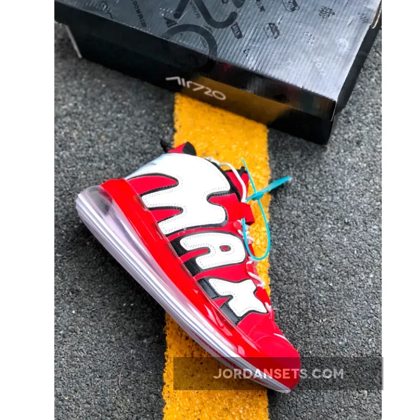 Dressed in a University Red and White color scheme that’s constructed in a mix of mesh, suede, and leather. The shoe features an upper from the 1996 Air More Uptempo that sits atop an Air Max 720 Air unit. But highlighting the shoe is the text on the sides that gets reimagined to “AIR MAX” instead of “AIR” on the sides.