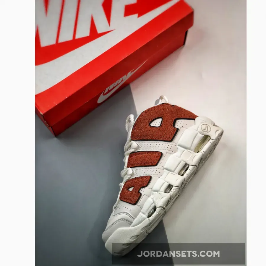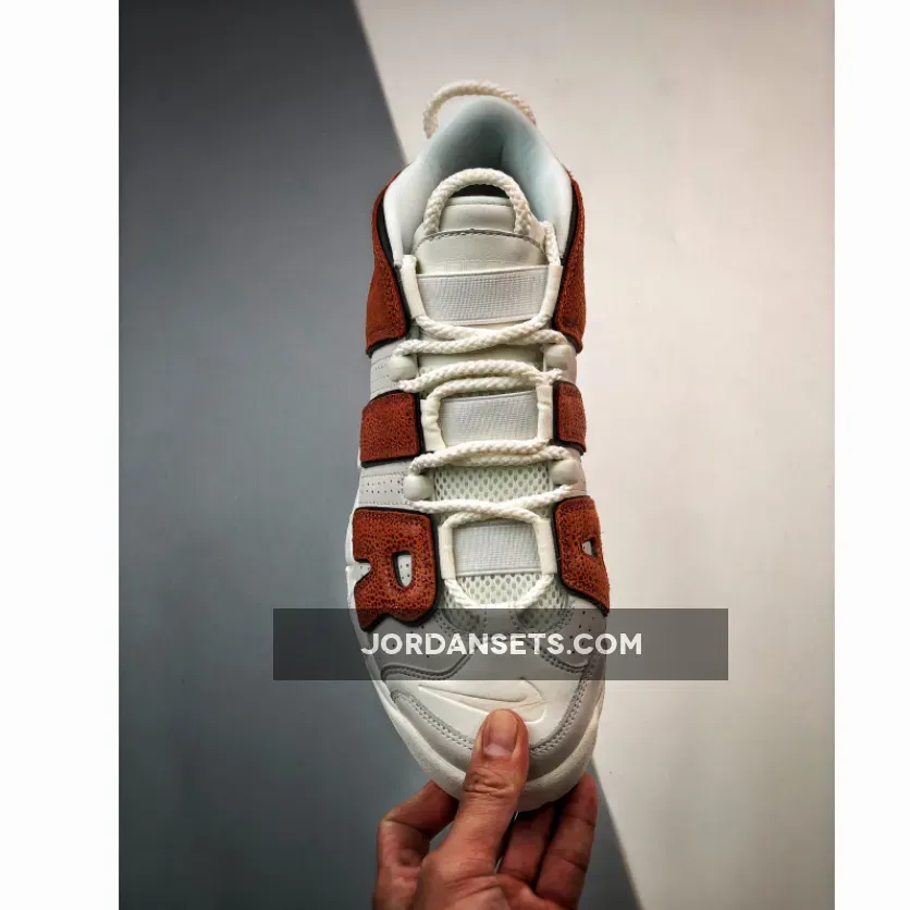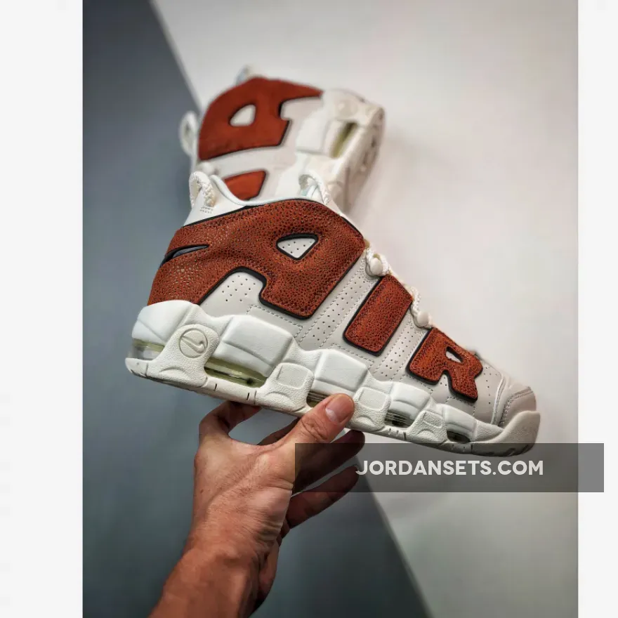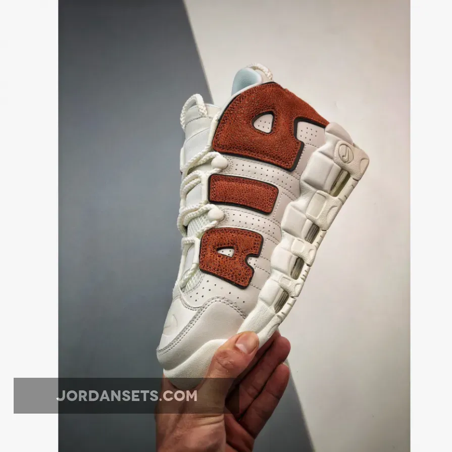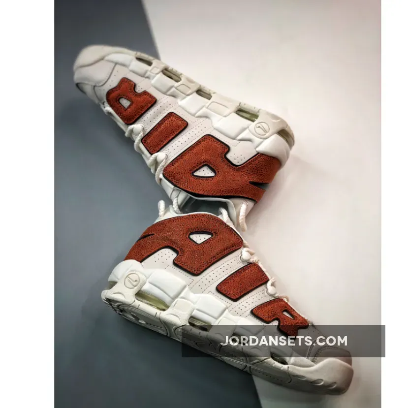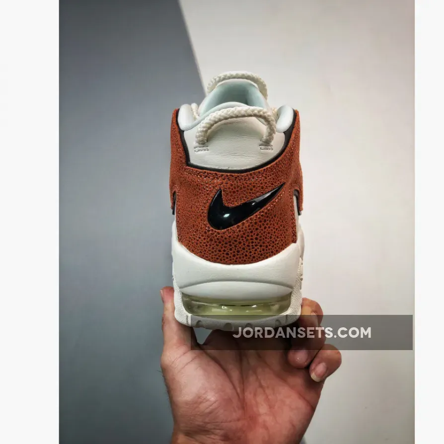 Meanwhile, large “AIR” letter patches on the side panels are dressed in a textured brown tumbled leather that’s reminiscent of a gritty basketball surface. Finally, classic Nike Air More Uptempo features such as lightweight Air bubble units and convenient loops are retained.