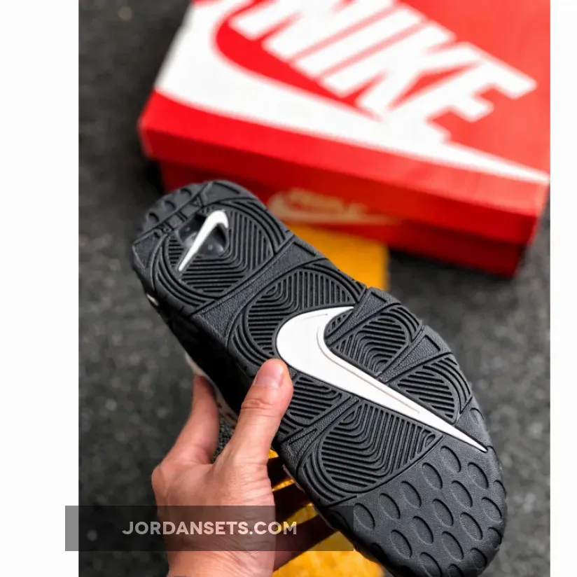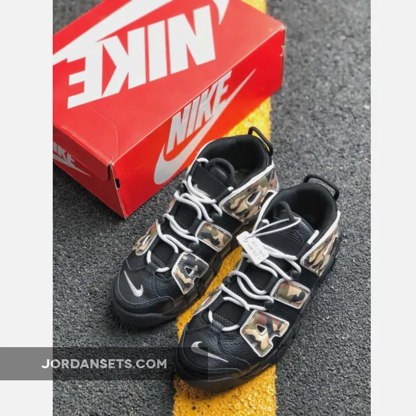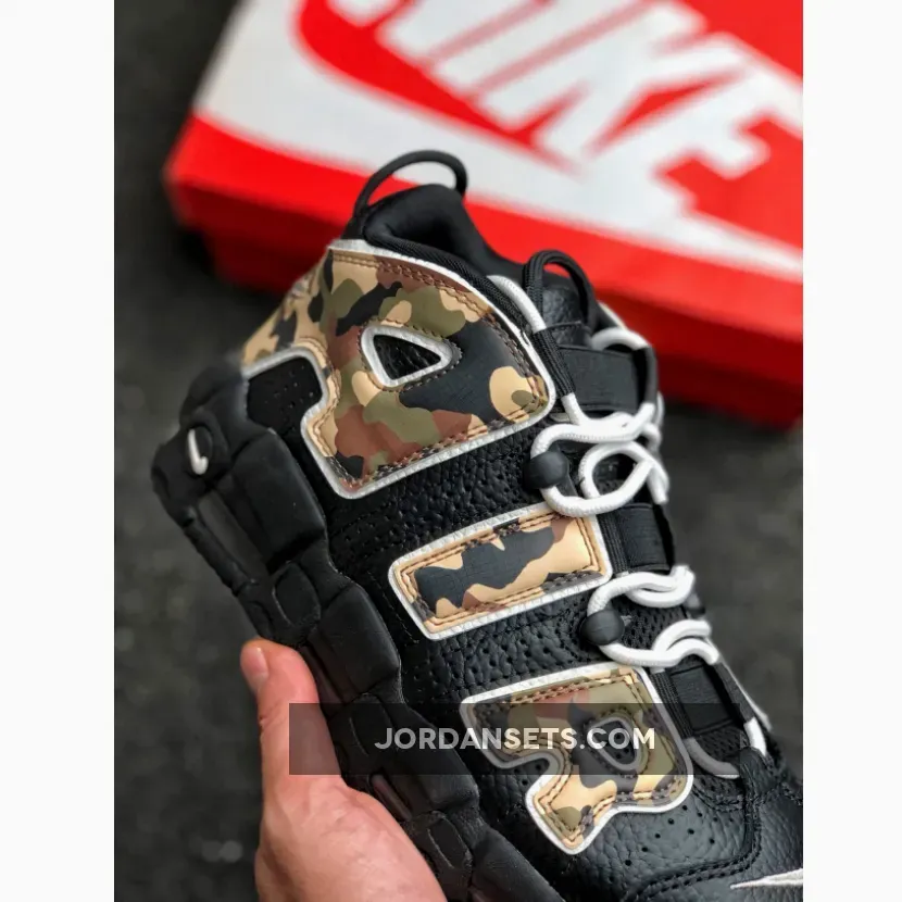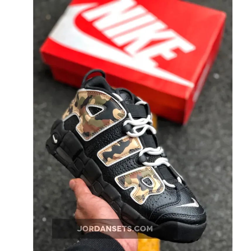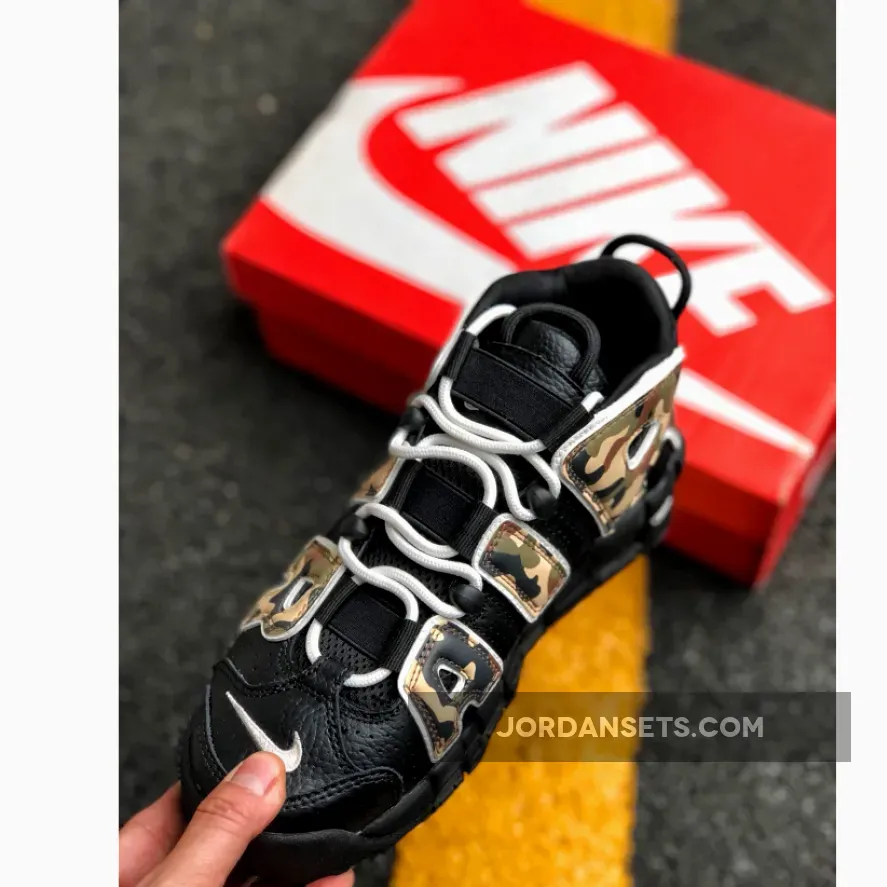 Dressed in a Black, Sail, and Light British Tan color scheme. This Nike Air More Uptempo features a Black premium tumbled leather upper highlighted with camouflage “AIR” lettering on the sides and heel outlined in White. A solid Black rubber sole with a large Swoosh logo on the outsole completes the design.