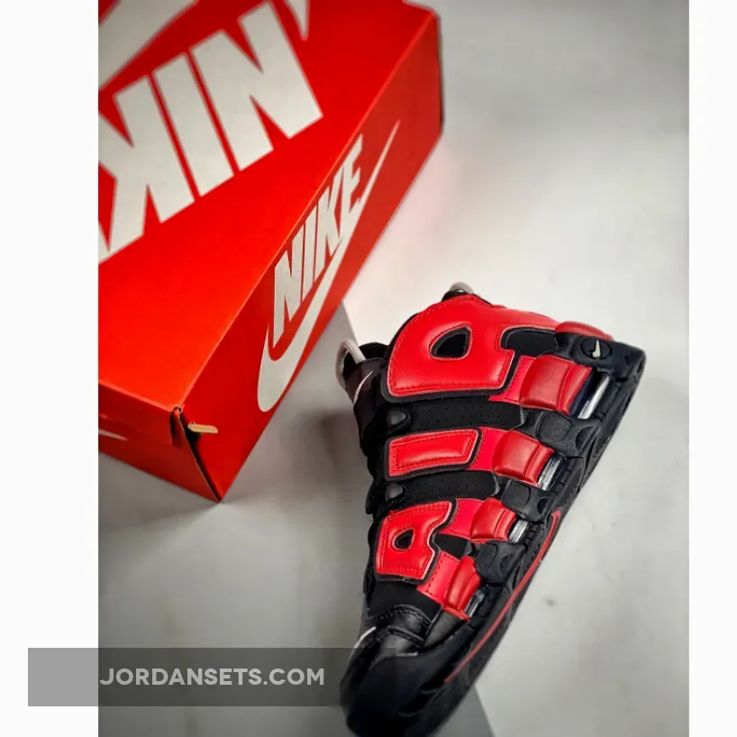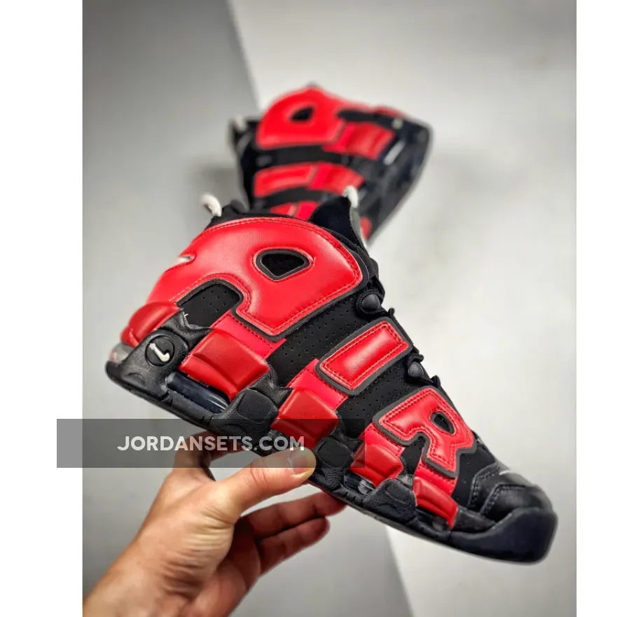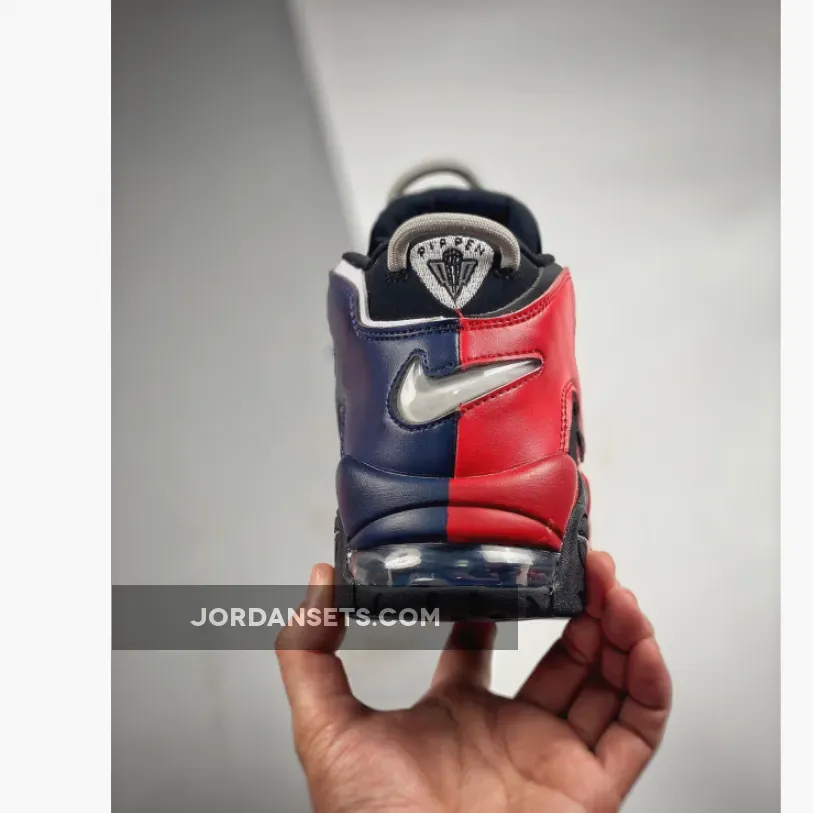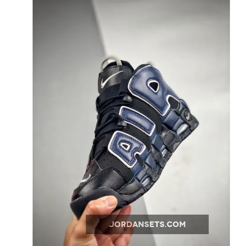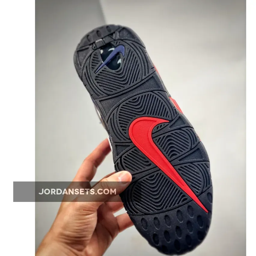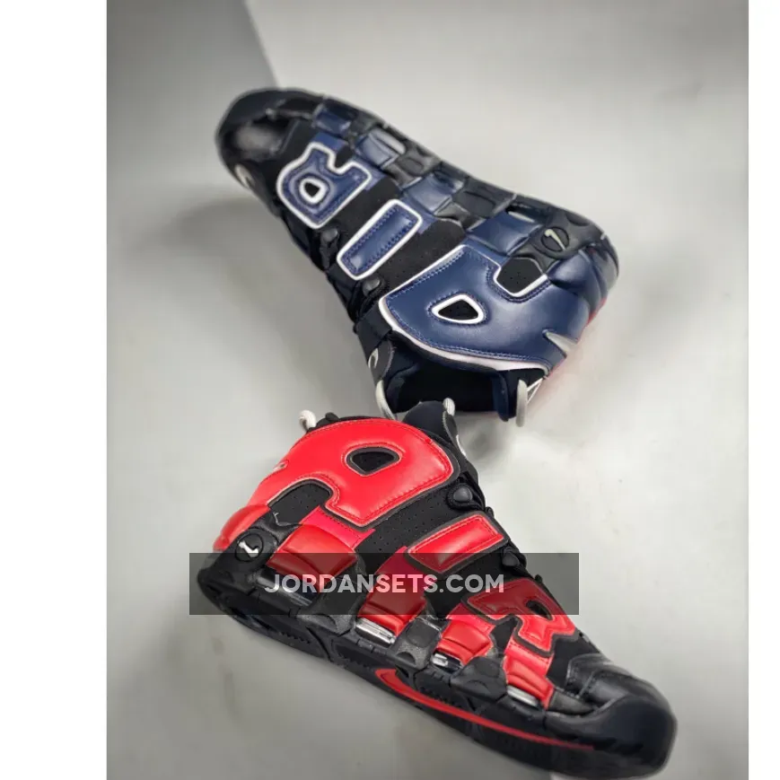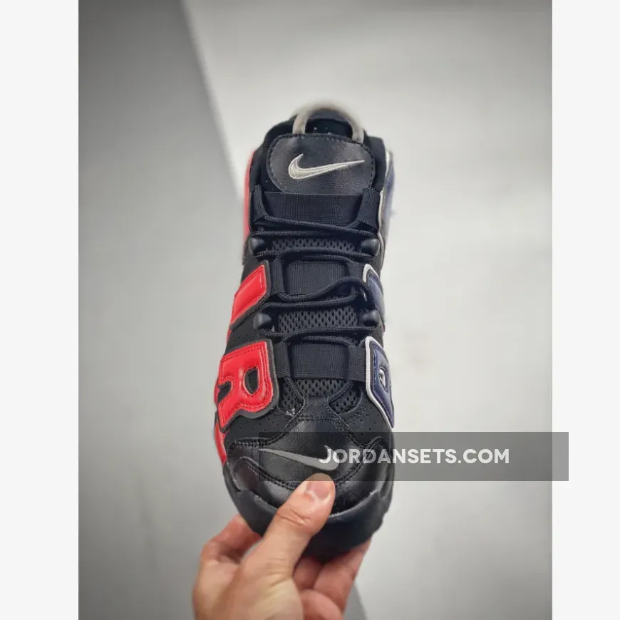 The Nike Air More Uptempo has always had playful design opportunities with its oversized “AIR” branding inspired by ‘90s graffiti and pop art. The new Nike Air More Uptempo Black Navy Red is the latest iteration of this exciting line.The base of the upper is perforated suede in black with smooth leather overlays on the toe also in matching black. This dark composition makes the perfect backdrop for the zany “AIR” appliques covering the entire quarter and wrapping around the heel. On the lateral side, the “AIR” appliques are in vivid red with black outlines. The red extends further, coating the black midsole. On the medial side, the “AIR” appliques are in navy with a white border. Similar to the treatment on the lateral side, the blue hue extends onto the midsole. White Swooshes can be seen on the toe box and the midsoles while a jelly-like Swoosh adorns the heel. A tribute to basketball legend Scottie Pippen in black, grey and white can be seen on the heel, right below the grey cord heel pull.