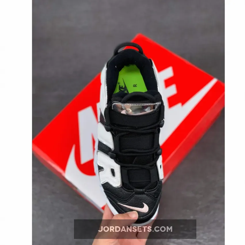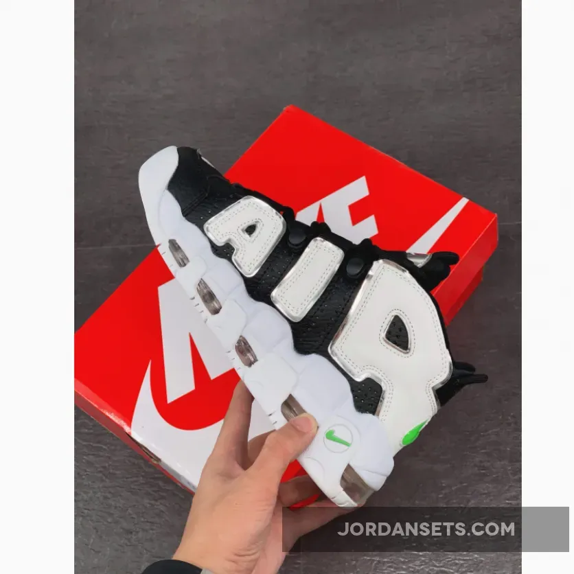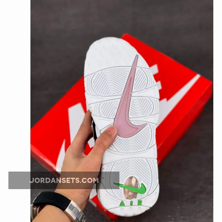 This offering of the Nike Air More Uptempo features a Black tumbled leather upper with White bold “AIR” lettering outlined in Metallic Silver, which is also used on the tongue tags. Highlighting the shoe are Green and Pink contrasting accents throughout completed with a solid White rubber sole.