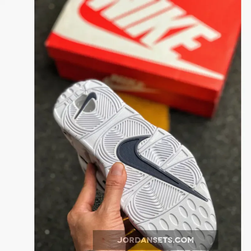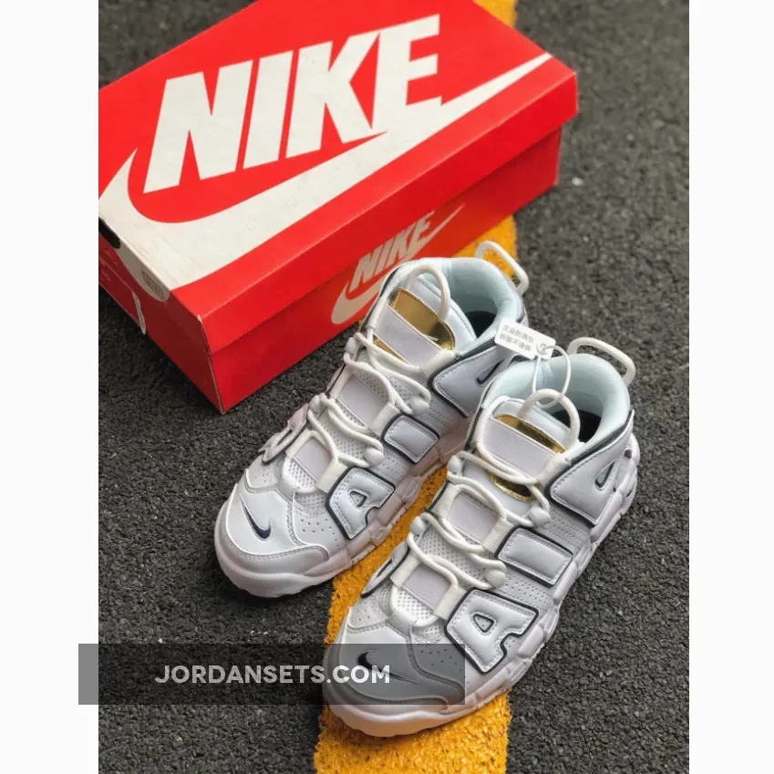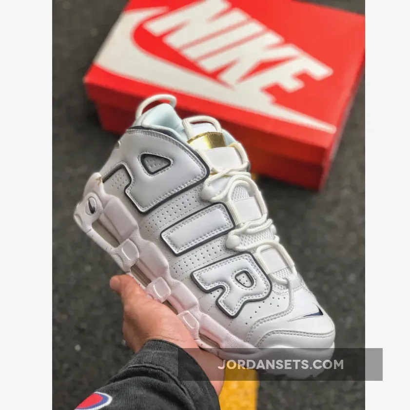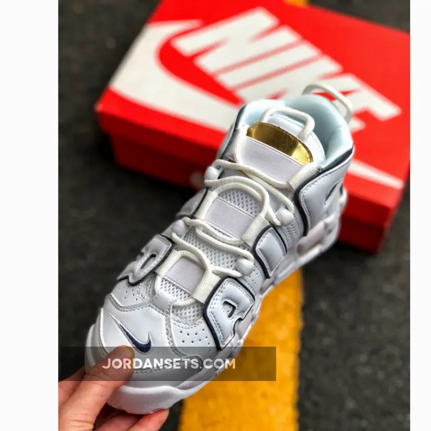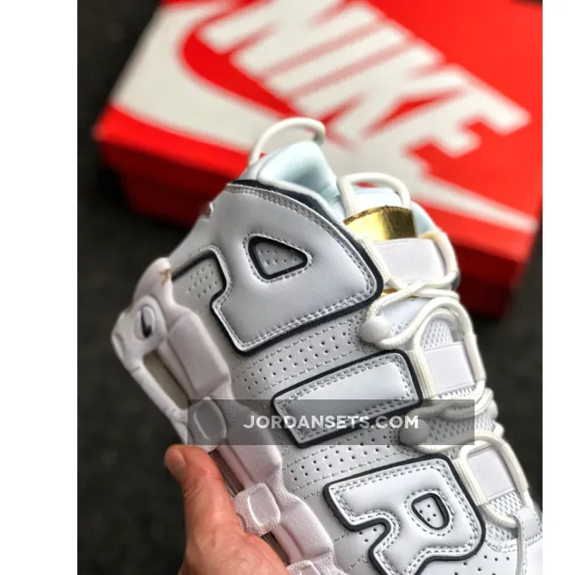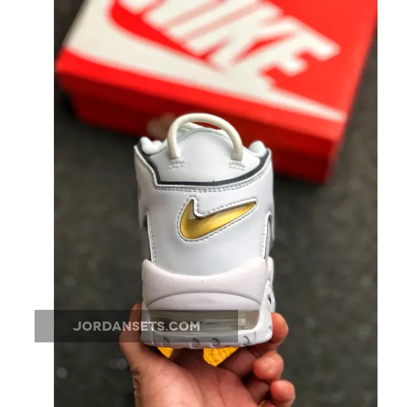 Dressed in a White, Midnight Navy, and Metallic Gold color scheme. This Nike Air More Uptempo is a kids exclusive that features a clean White upper, detailed with Navy trimming, and highlights with Gold accents.