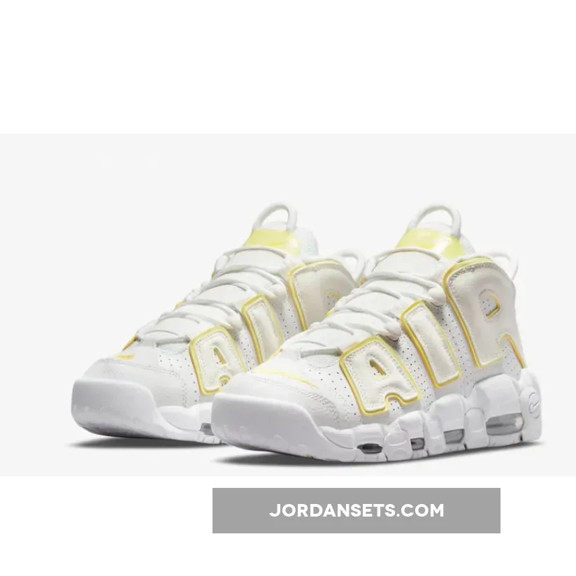 This Nike Air More Uptempo utilizing a clean and simple theme of White and Light Citron. First, White tumbled leather adorns the upper and large ‘AIR’ on the side while Yellow hits the trimming, allowing it to stand out. Another unique element, we have a TPU overlay on the tongue.