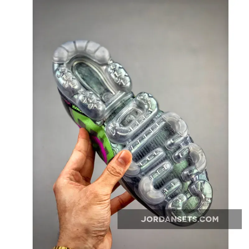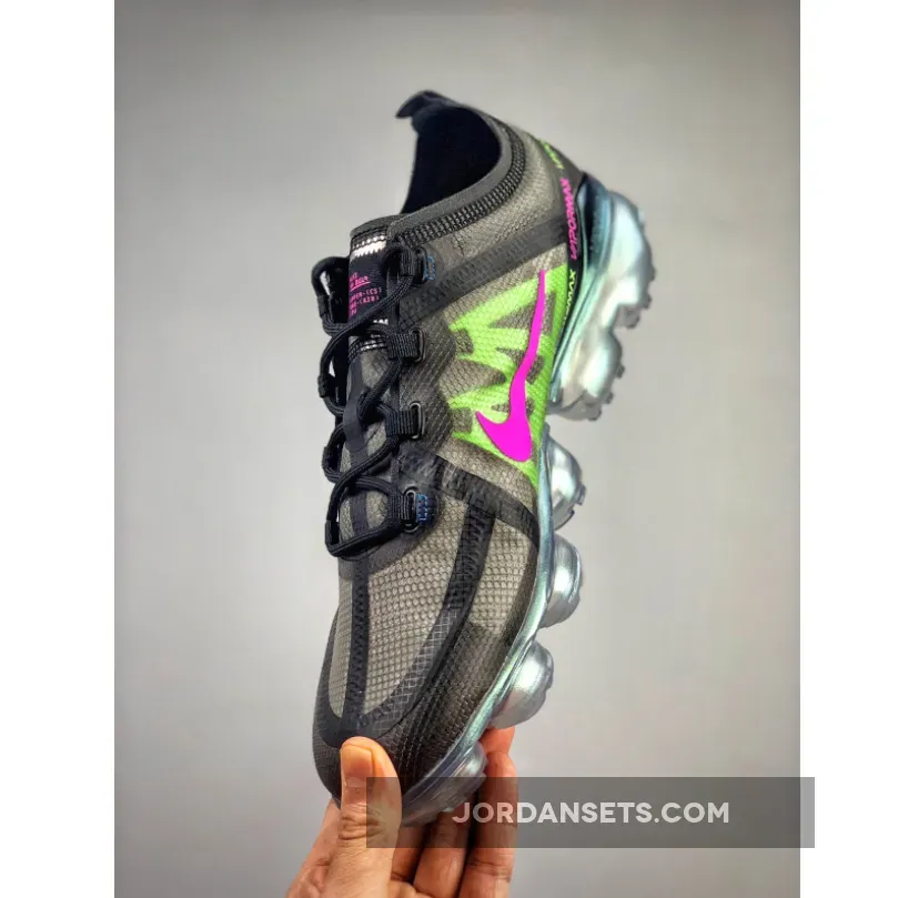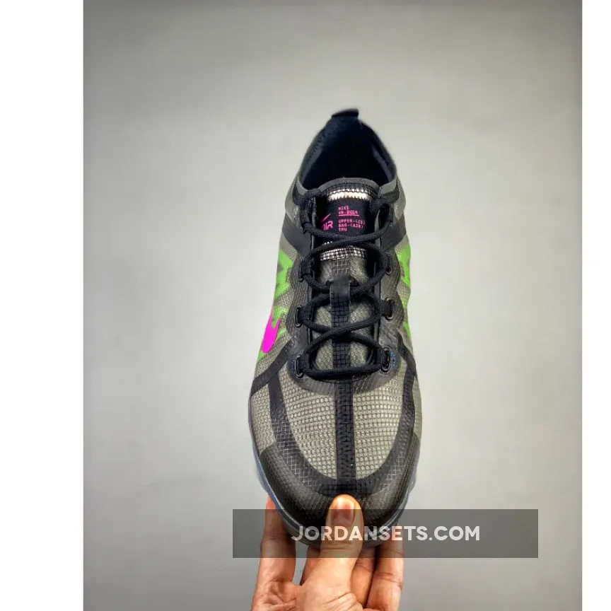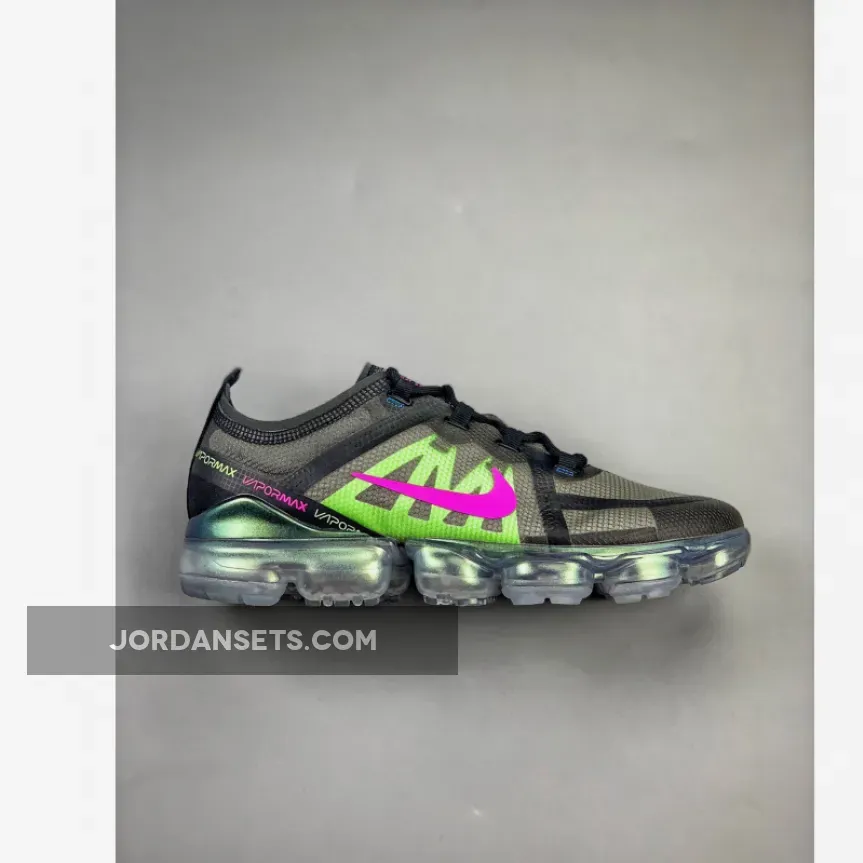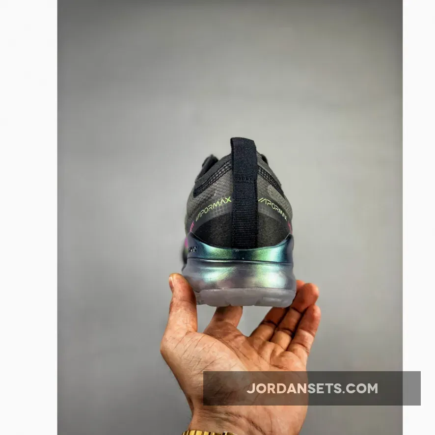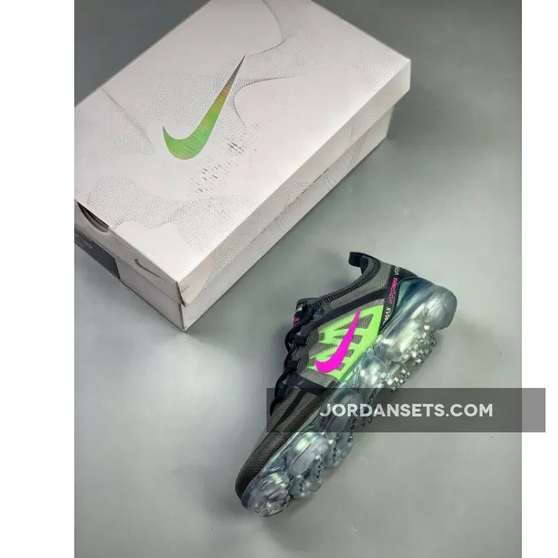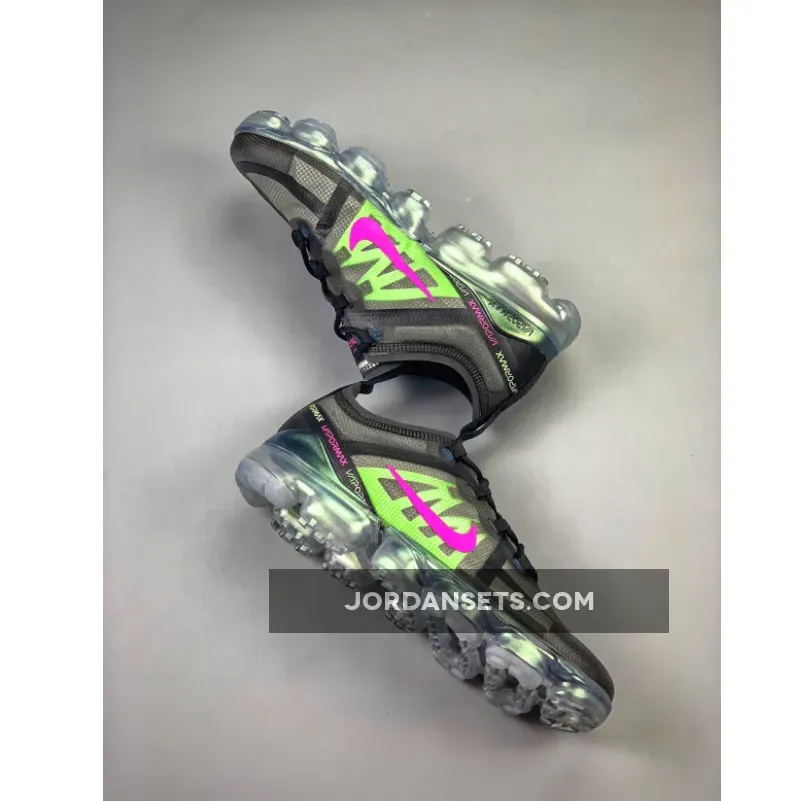 One of those pairs comes dressed in a Black, Active Fuchsia, Photo Blue, Lime Blast, and Wolf Grey color scheme. Featuring a Black TPE-equipped upper highlighted with Pink, Lime Green, and Blue contrasting accents. An iridescent full-length VaporMax sole unit completes the design.