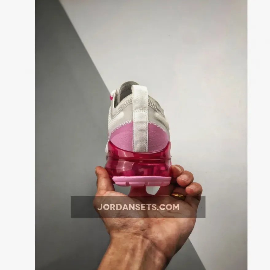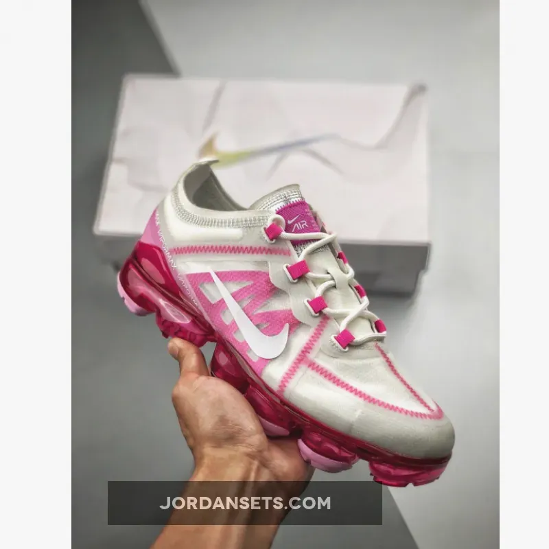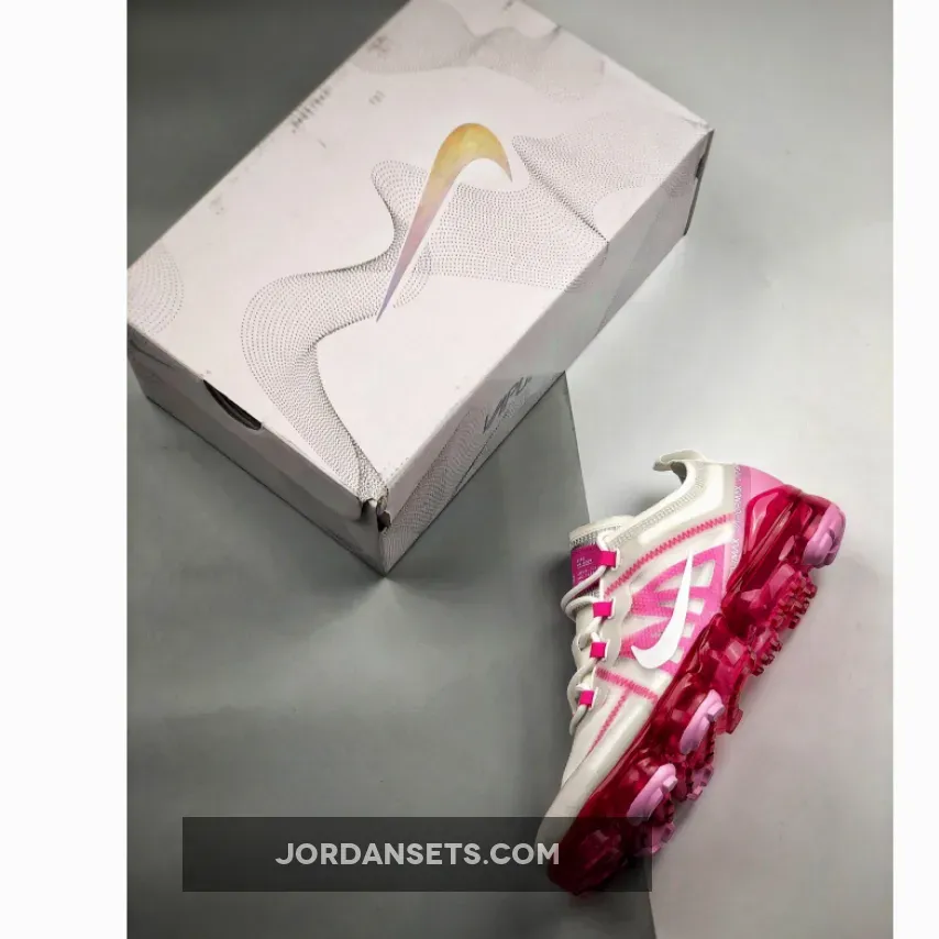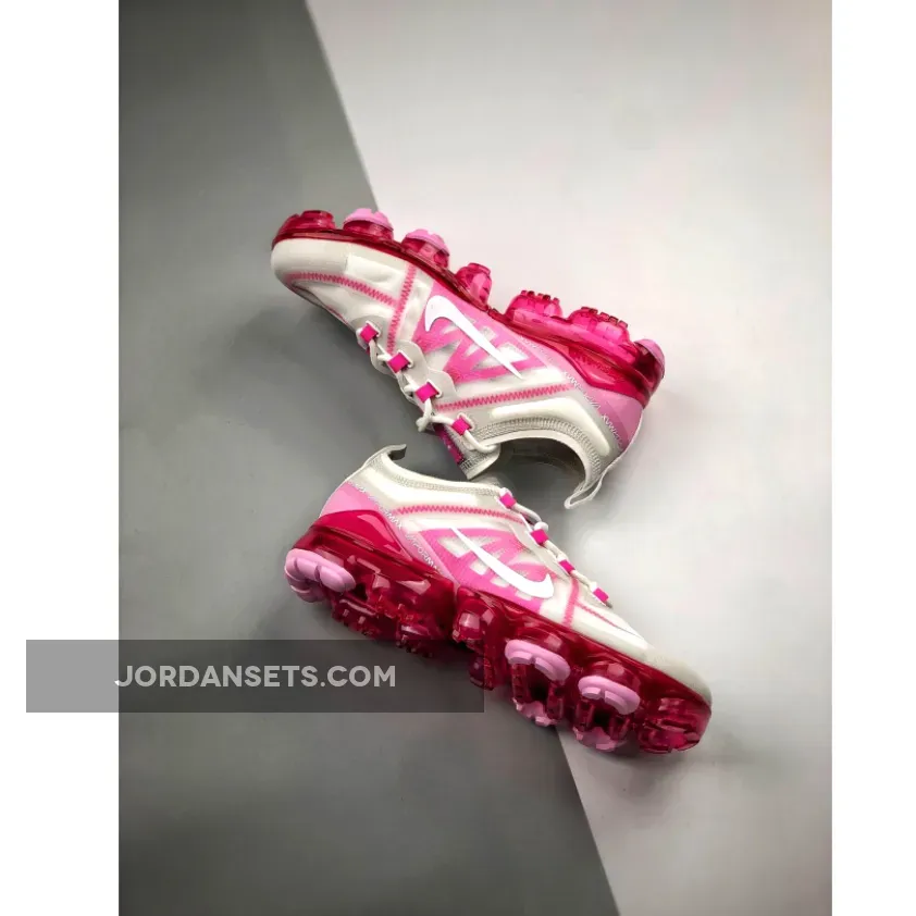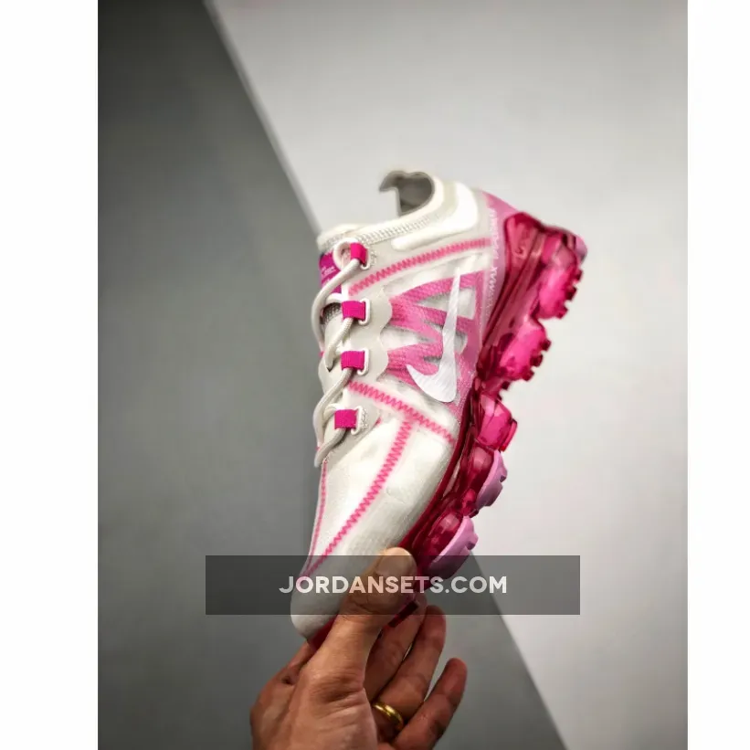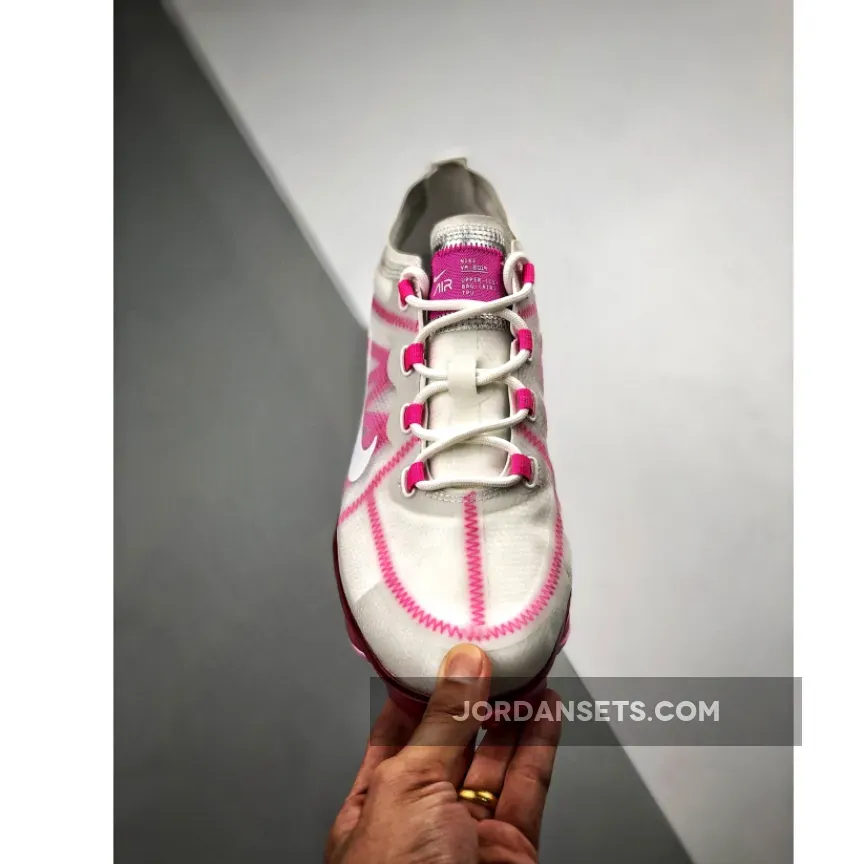 Dressed in a Summit White, Laser Fuchsia, and Pink Rise color scheme. This Nike Air VaporMax 2019 features a White translucent TPE-infused upper paired with Fuchsia and Pink contrasting accents.