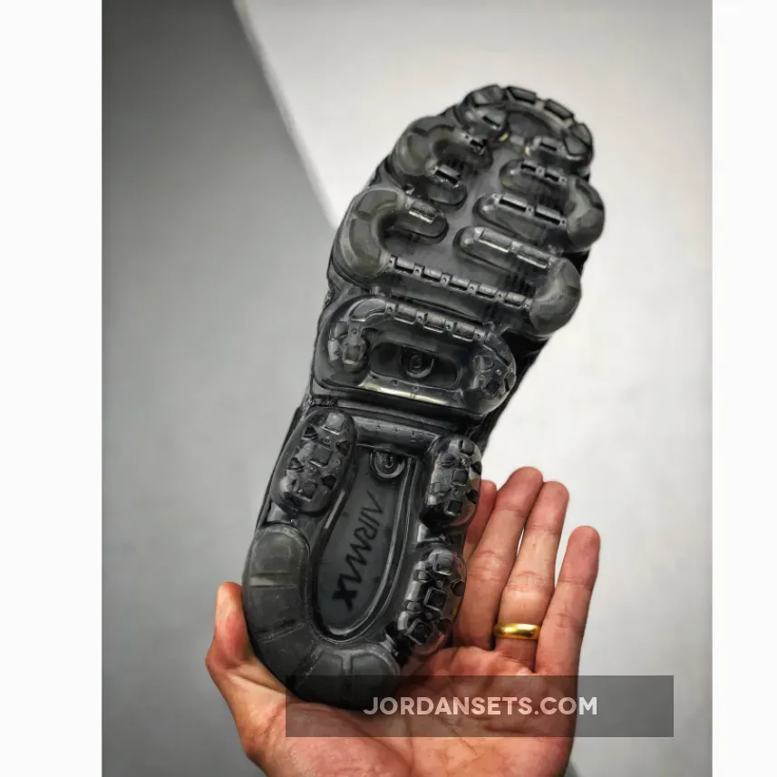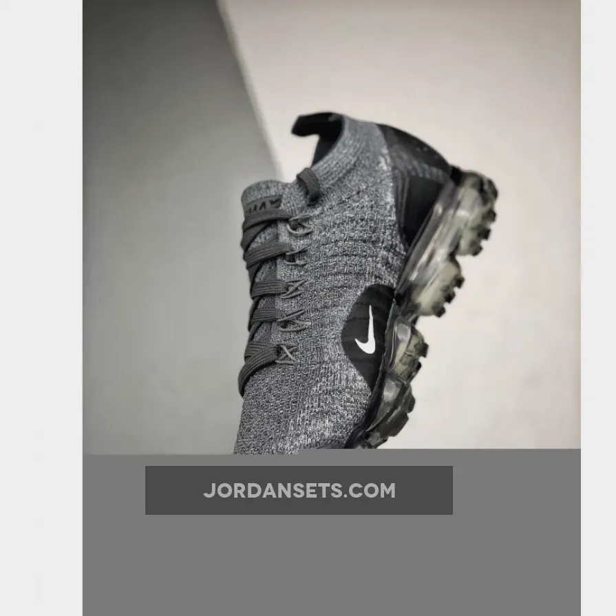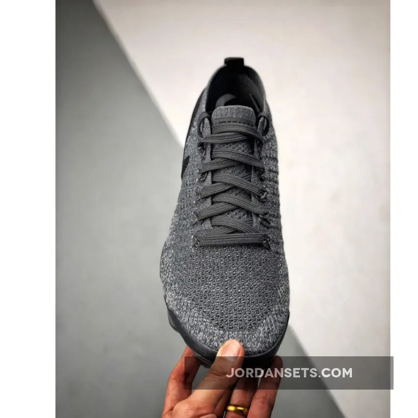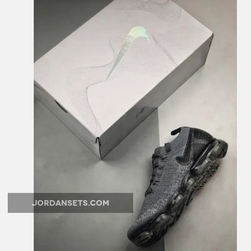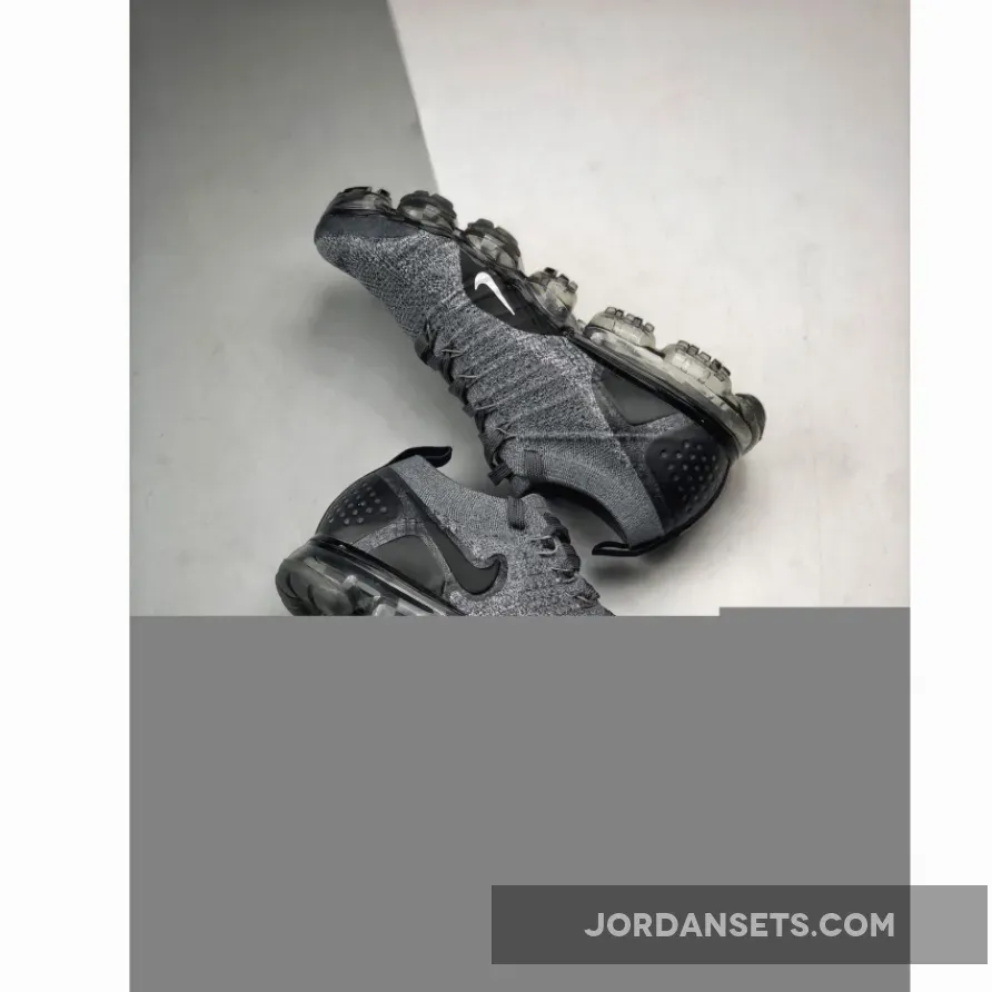 This Nike Air VaporMax features a Dark Grey and Wolf Grey Flyknit upper paired with Black detailing the Nike Swoosh logo and heel counter for a monochromatic look. A clear VaporMax sole unit completes the design.