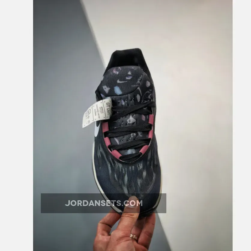 This Zoom GT Cut 2 has a semi-translucent black mesh base which provides great contrast to the Summit White 3D Swooshes on both the medial and lateral mid-panels. The aforementioned gemstone print covers the padded tongue. Mauve-like Desert Berry accents show up on the eye stay panel, the moulded heel clip and part of the mid-foot tread. A unique navy-coloured heel tab shows off triangular perforations.