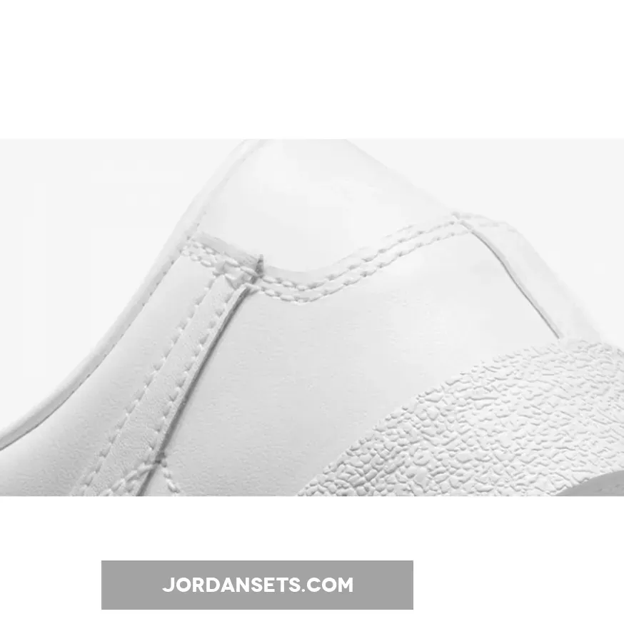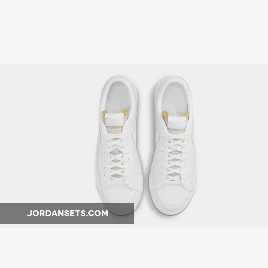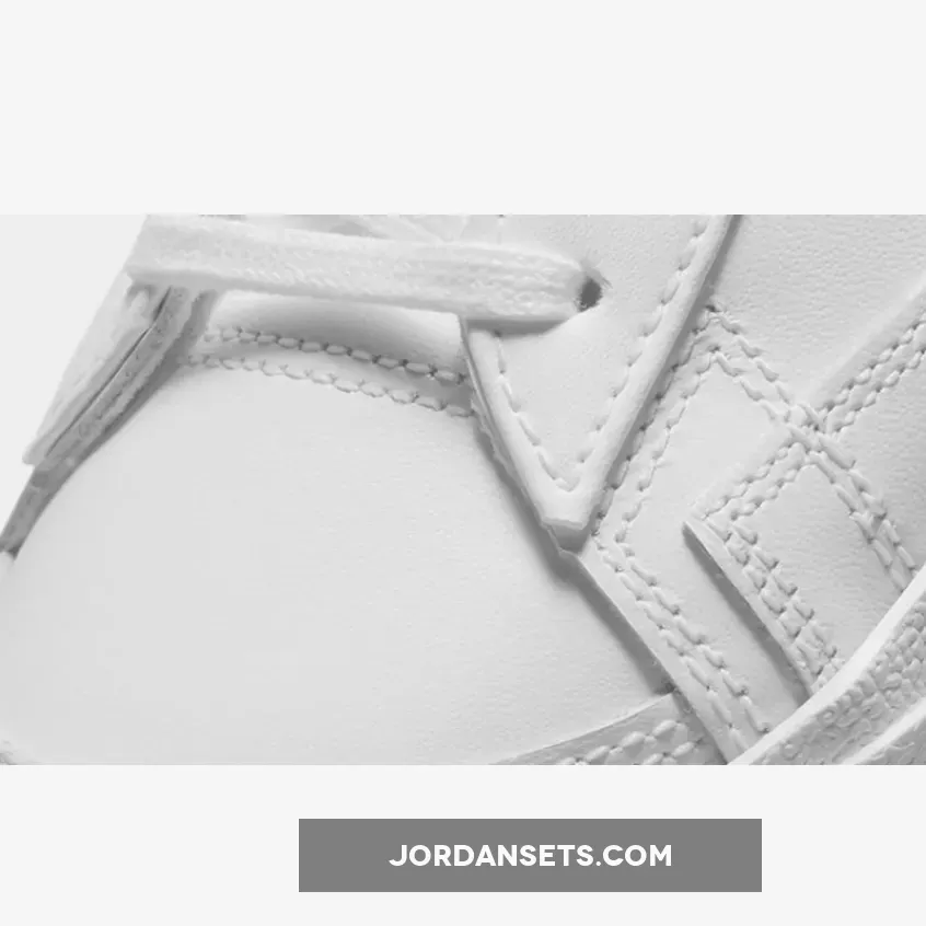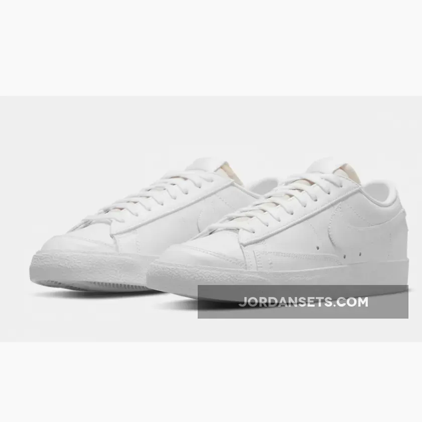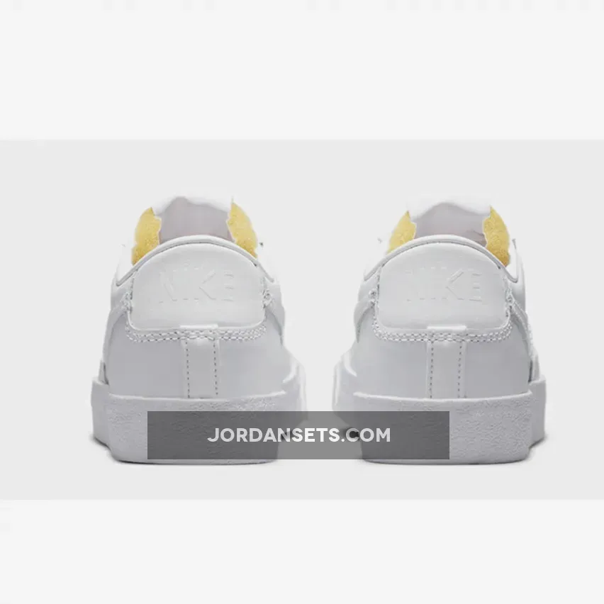 This offering of the Nike Blazer Low features an all-White leather upper with matching exposed stitching, Swooshes, heel branding, and laces.