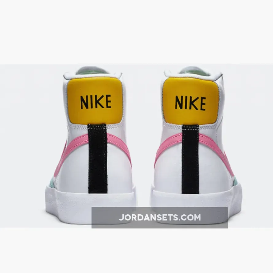 Unlike most iterations of the vintage-style Blazer Mid, this forthcoming pair features leather reinforcement at the toe and lateral forefoot instead of the traditional suede variant. Elsewhere, pink animates the profile Swooshes; a mustard yellow the “NIKE”-branded heel panel; and fluorescent green the tongue tag and sock liner. Although not entirely colorless like most of this Blazer, lace guards and spines add dull grey and black, respectively, into the mix.