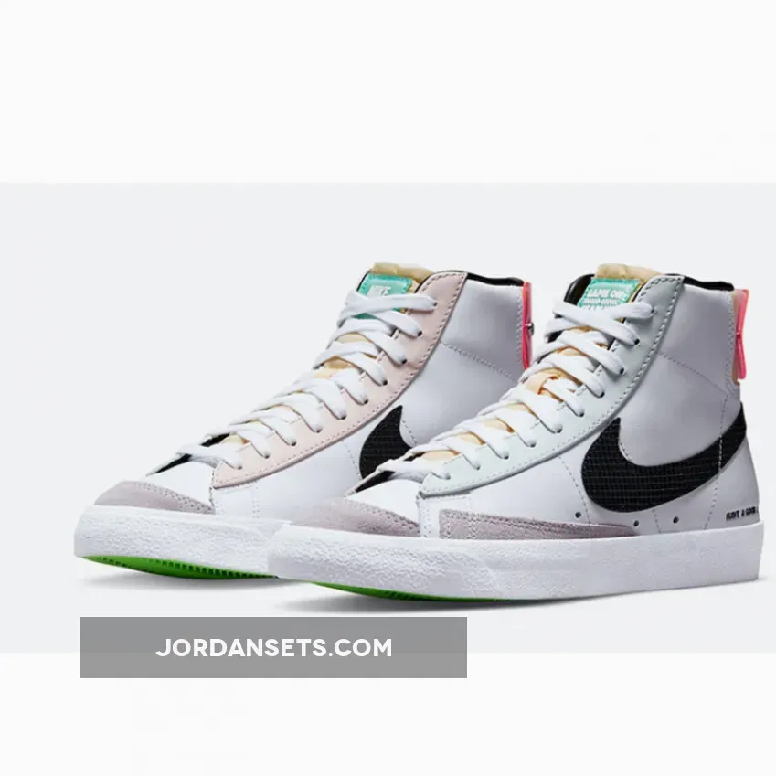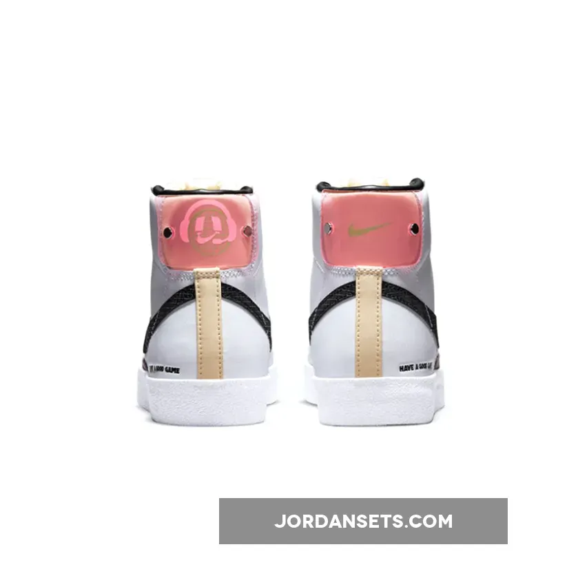 The Nike women’s Blazer Mid ‘77 ‘Have a Good Game’ updates the heritage basketball shoe with playful details inspired by contemporary video-game culture. Smooth white leather is utilized on the upper, accented with a grid-patterned black leather Swoosh and printed text on the lateral heel that reads ‘Have a Good Game.’ The sneaker can be customized with interchangeable translucent decals that are designed to be overlaid on each heel tab via a pair of removable rivets.