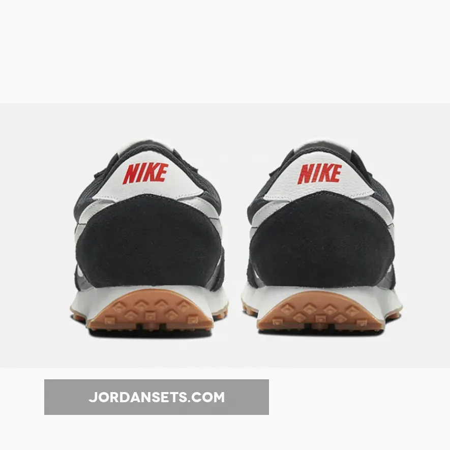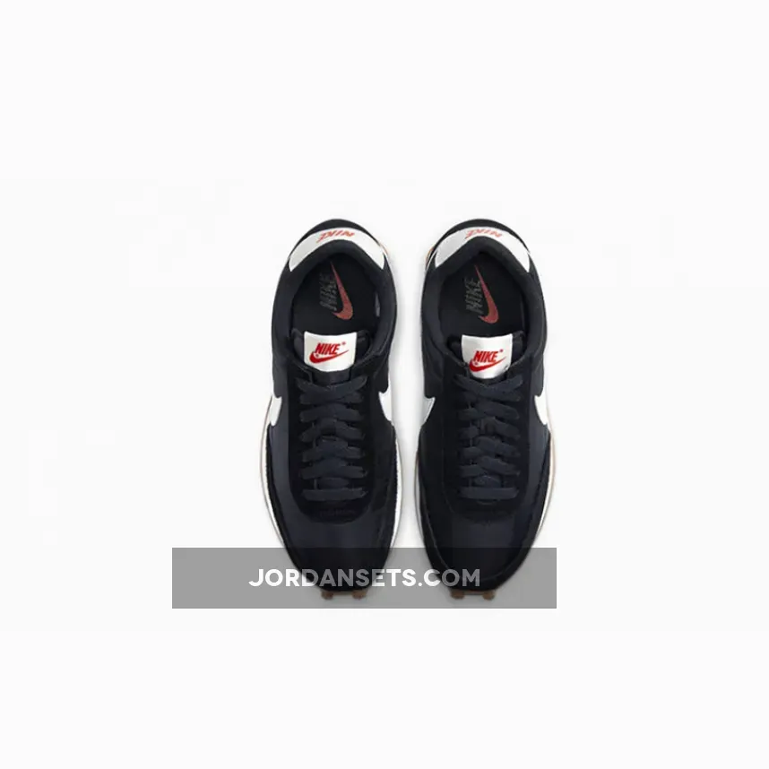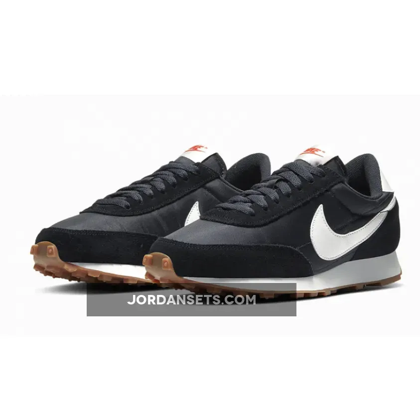 A mix of satin material and black suede covers the upper of the silhouette, in a retro style and one that gives off an instant athletic vibe. White elements highlight the Black Nike Daybreak, around the heel, tongue and Swooshes to the sidewalls, with red Nike branding to really make the shoe pop.