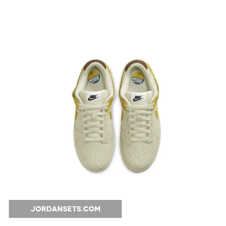 Finishing off the quirky fruit homage of this Dunk Low is a little blue sticker just like the ones on real bananas from the supermarket. Elsewhere at the rear, a dark burgundy suede badge with Nike branding provides a contrast.