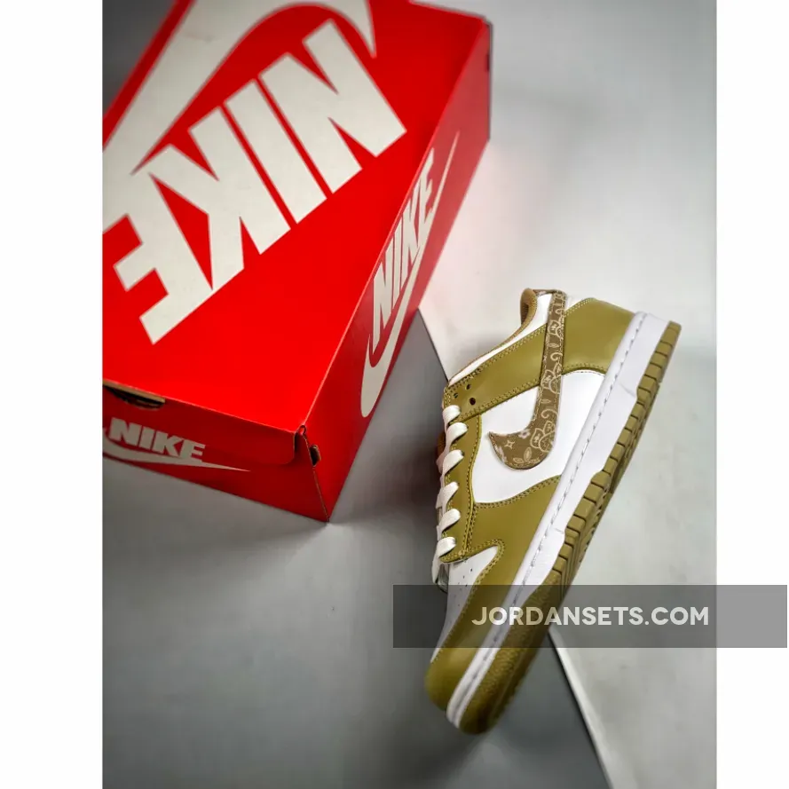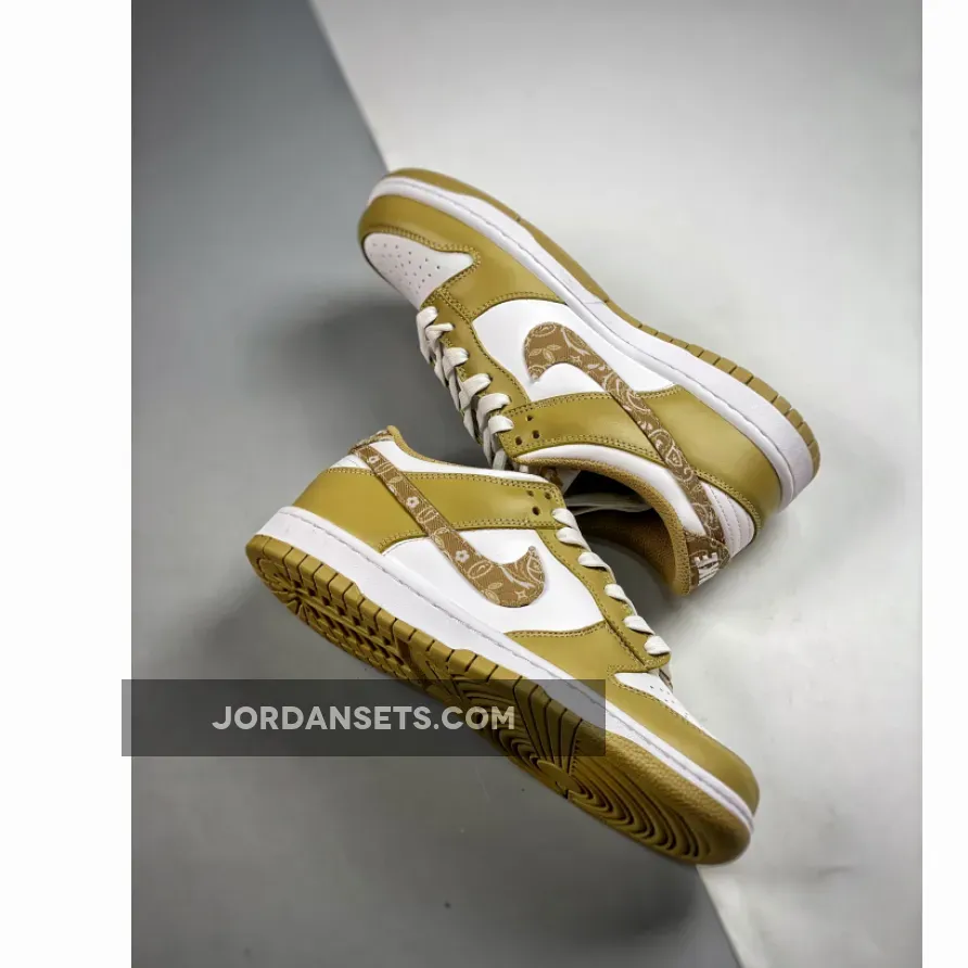 Nike Dunk Low Barley Paisley is the perfect pair for sunny days. This recent addition to the “Paisley Pack” revels in an understated sunny colourway that will match well with warm-weather looks. It begins with a timeless Nike Dunk Low feature: a buttery smooth colourless leather base. On top, dusty gold leather overlays take the spotlight while the titular yellow ochre paisley print adorns the heel tabs, lateral and medial Swooshes. You’re sure to have fun in the sun with this gem.