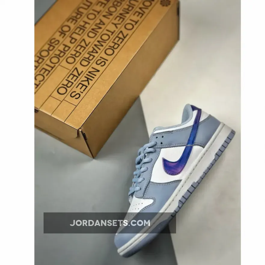 This grade-school colorway of the Nike Dunk Low is given a leather upper consisting of a White base and contrasted by the Muted Blue overlays. More Blue hits land on the laces as well as the mesh tongues and lining. The sneaker is is highlighted by the iridescent hits on the Swooshes, tongues, and heels. A Nike Grind two-tone rubber outsole and insoles housing Nike’s pinwheel logo complete the look.