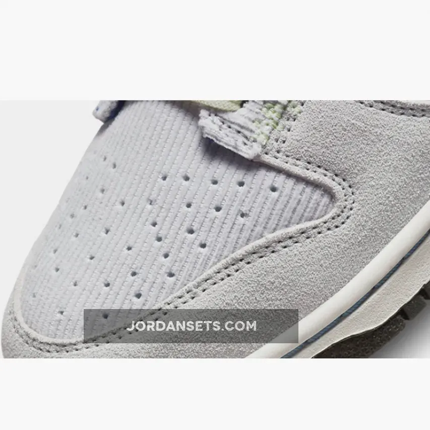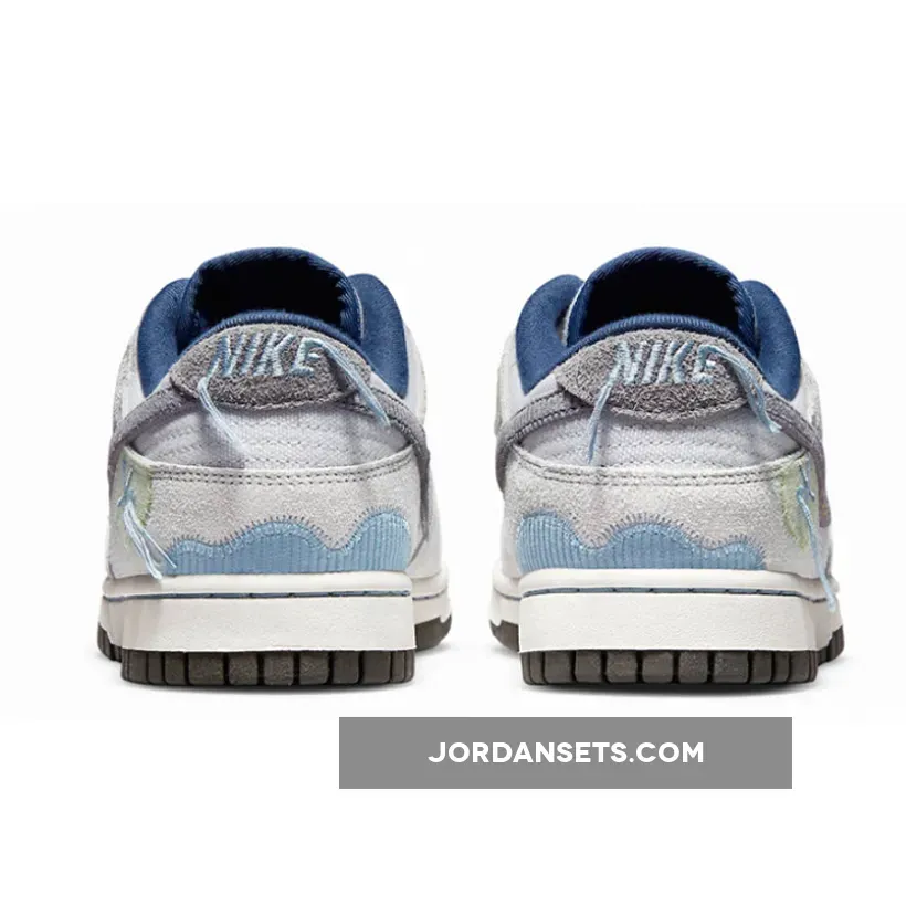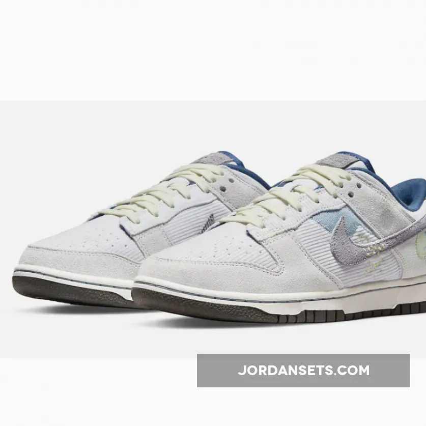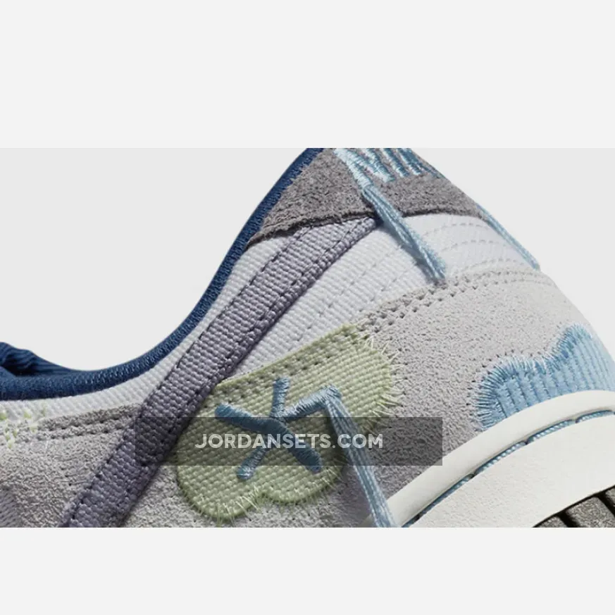 The Nike Dunk Low has just joined a new collection with a positive message to look “on the bright side”. Be inspired by the Nike Dunk Low Bright Side Grey. This Peter Moore-designed shoe shows off a speckled black outsole, hinting at the brand’s Grind technology and its sustainability. The upper is an experimental mix of corduroy, suede, nylon and canvas. The midfoot panel, heel and spine feature frayed detailing, accompanied by embroidered springtime-ready floral patches. The signature profile Swooshes are mismatched, denim-like fabric on the lateral side and corduroy on the medial side. An indigo blue sockliner and tongue lining provide a nice finishing touch to the sky blue, white and grey look of the shoe.