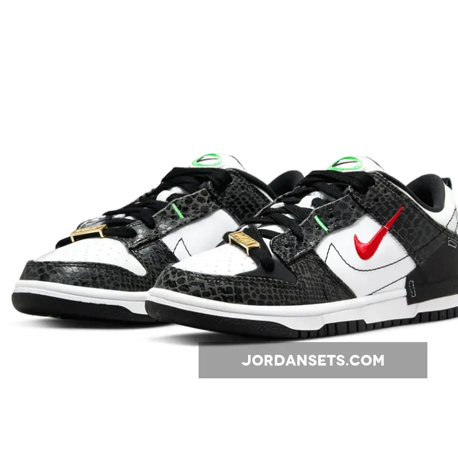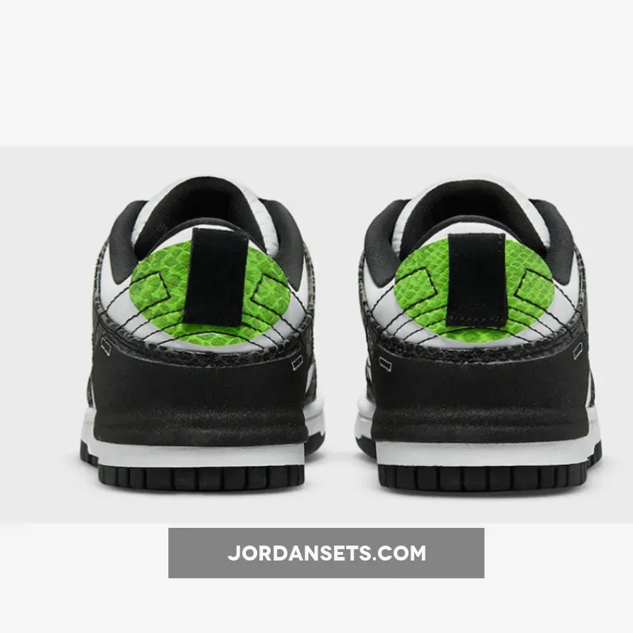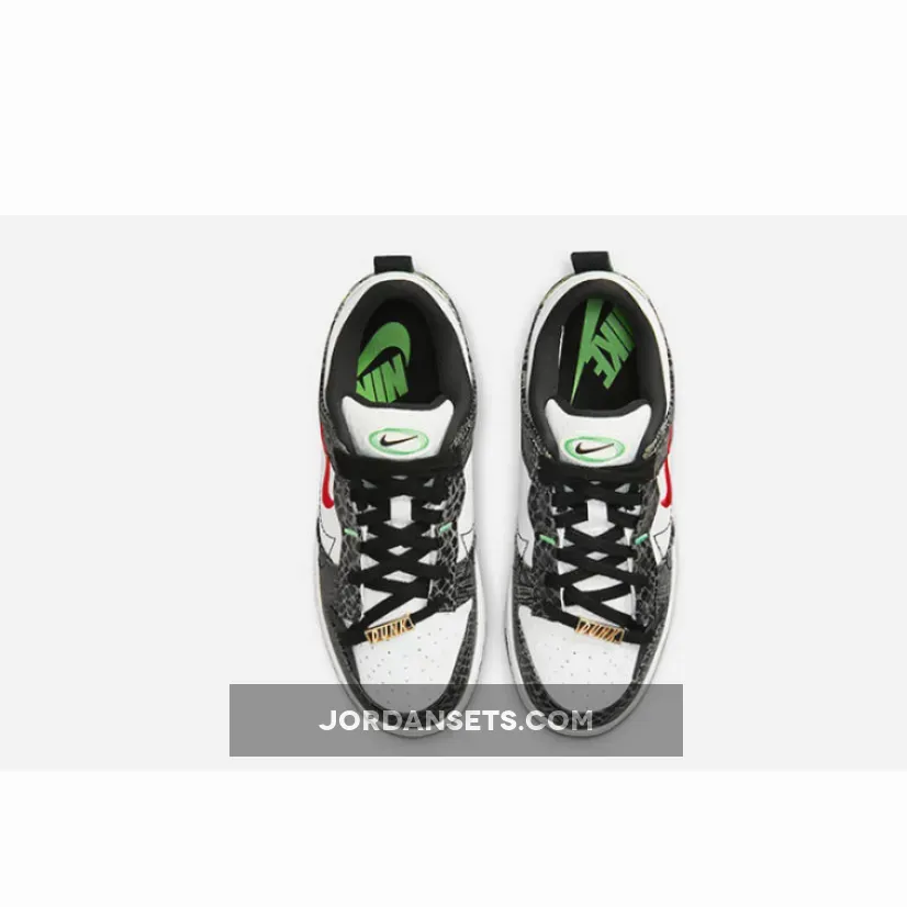 The Dunk Low Disrupt 2 silhouette has a new variant that combines opulence and a classic black-and-white colour scheme. Check out the Nike Dunk Low Disrupt 2 Just Do It Black Snakeskin.The base of this Dunk Low is plain white smooth leather, all the better to show off other eye-catching elements of the shoe. The overlays are glossy faux black snakeskin except for the heel tab which is a bright green snakeskin. The profile Swooshes have a double-stacked motif, with a black stitched Swoosh outline across the lateral quarter and punctuated by an embroidered smaller red Swoosh. More green accents appear on the eyestay panel and the Swoosh branded tongue label.