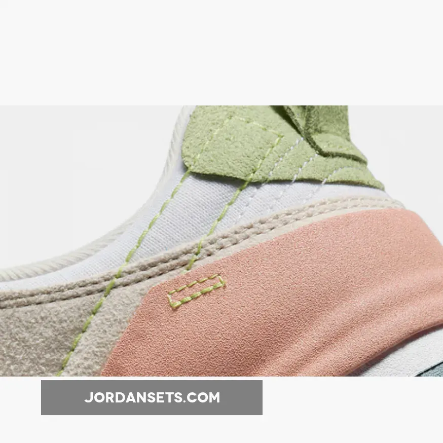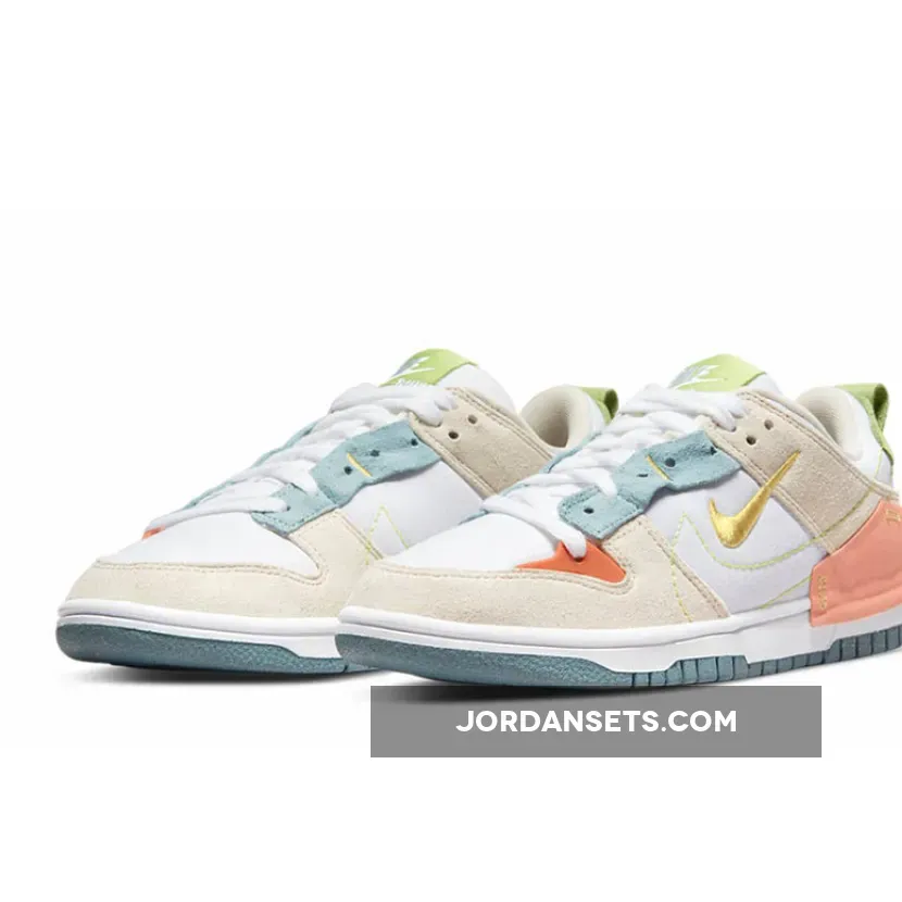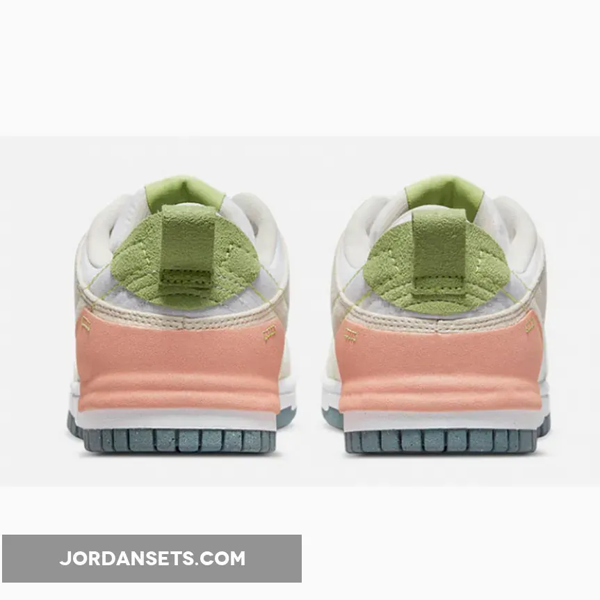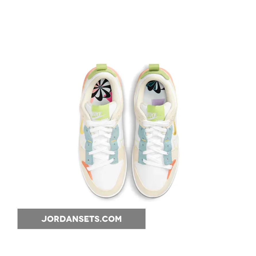 True to its name, the Nike Dunk Low Disrupt has dramatically transformed the beloved Dunk silhouette. As such, it pioneers innovative approaches. Its latest iteration, the Nike Dunk Low Disrupt 2 Next Nature Multi, is a prime example. This shoe has a highly amalgamated feel to it with a buffet of pastel hues mixed in with more neutral shades. Beginning with white canvas uppers, the pair then adds in beige overlays at the toe and heel and a muted slate blue eyestay panel. The mid-panel shows off golden yellow embroidered Swooshes on the lateral side and stitched golden yellow outlines of Swooshes on the medial side. A soothing avocado green joins the mix on the tongue tab and the heel tab. Pops of peach and pink appear on the lateral eyestay accents and the cupsole.