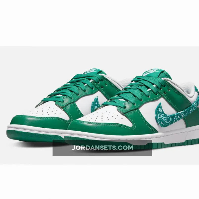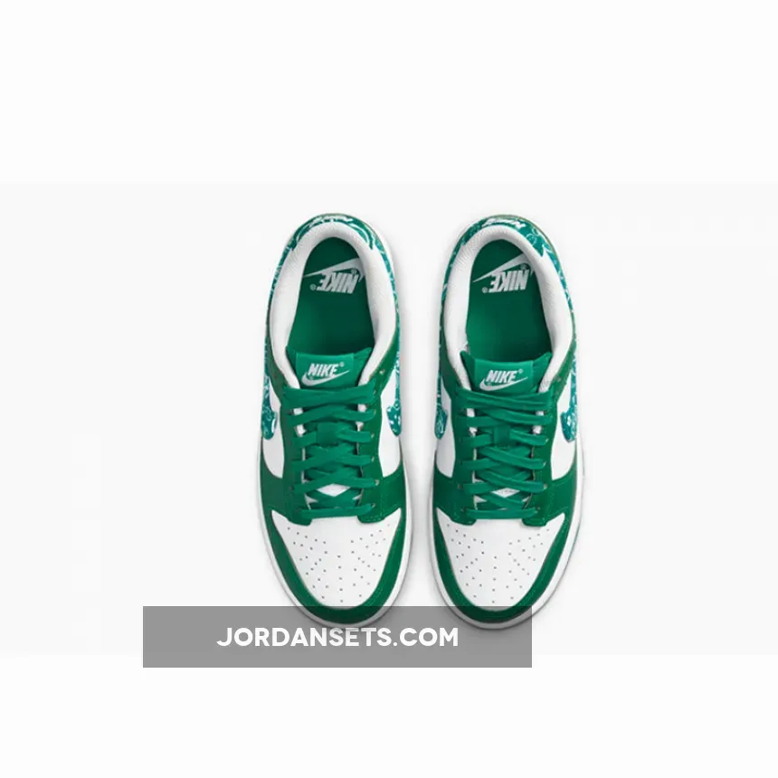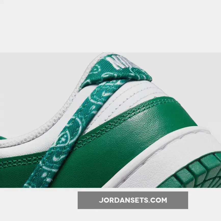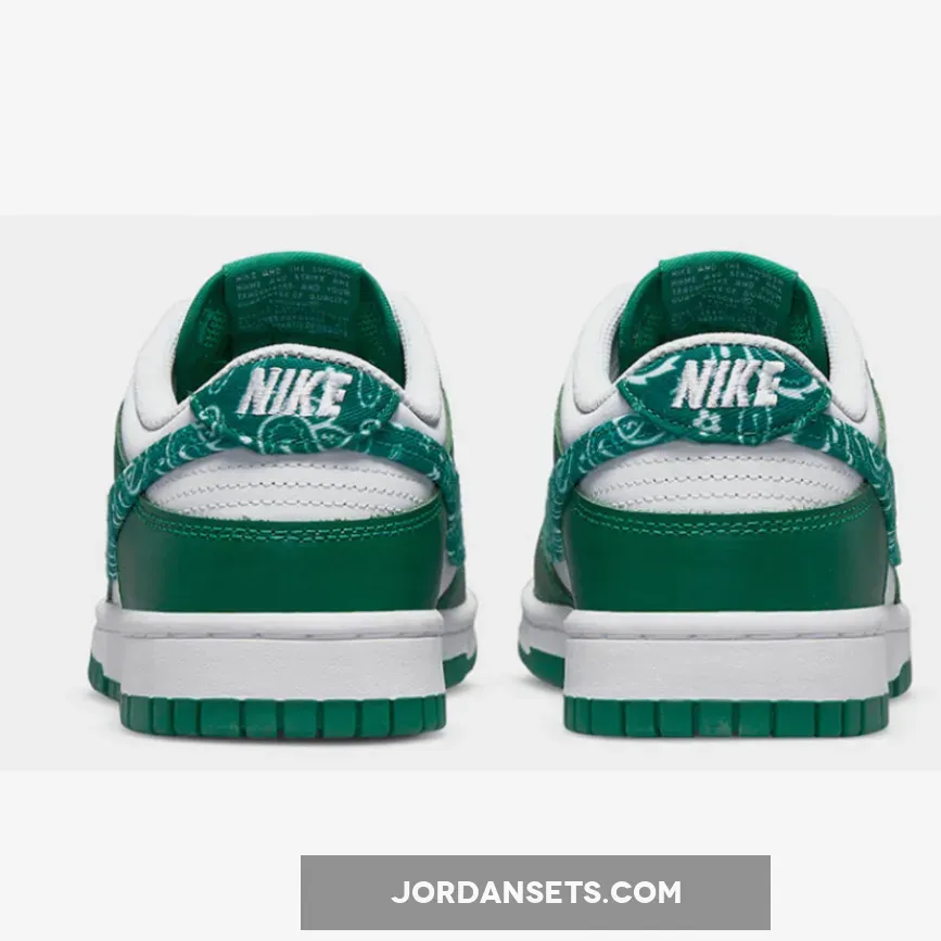 The Nike Dunk Low “Green Paisley” is a sleek and stylish sneaker with a timeless design. The combination of crisp white leather and dark forest green overlays creates a cohesive and elegant look. The intricate Green Paisley print on the Swooshes adds a touch of sophistication. Overall, a well-designed and comfortable sneaker for everyday wear.