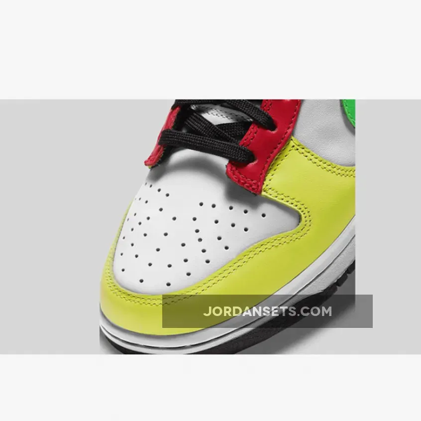 If you’ve been growing your Dunk collection since its resurgence over the past couple of years, then you should cop the most recent Nike Dunk Low Green Strike. Beautifully arranged with various tones, these will no doubt add a splash of colour to your collection so keep reading on for a detailed look at the pair. This variant works atop a crisp white leather base complemented by contrasting accents of red, blue, yellow, green that wrap around panels throughout.