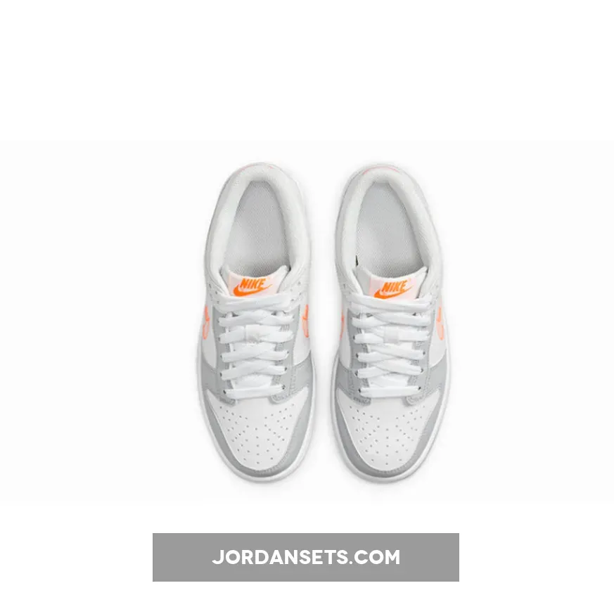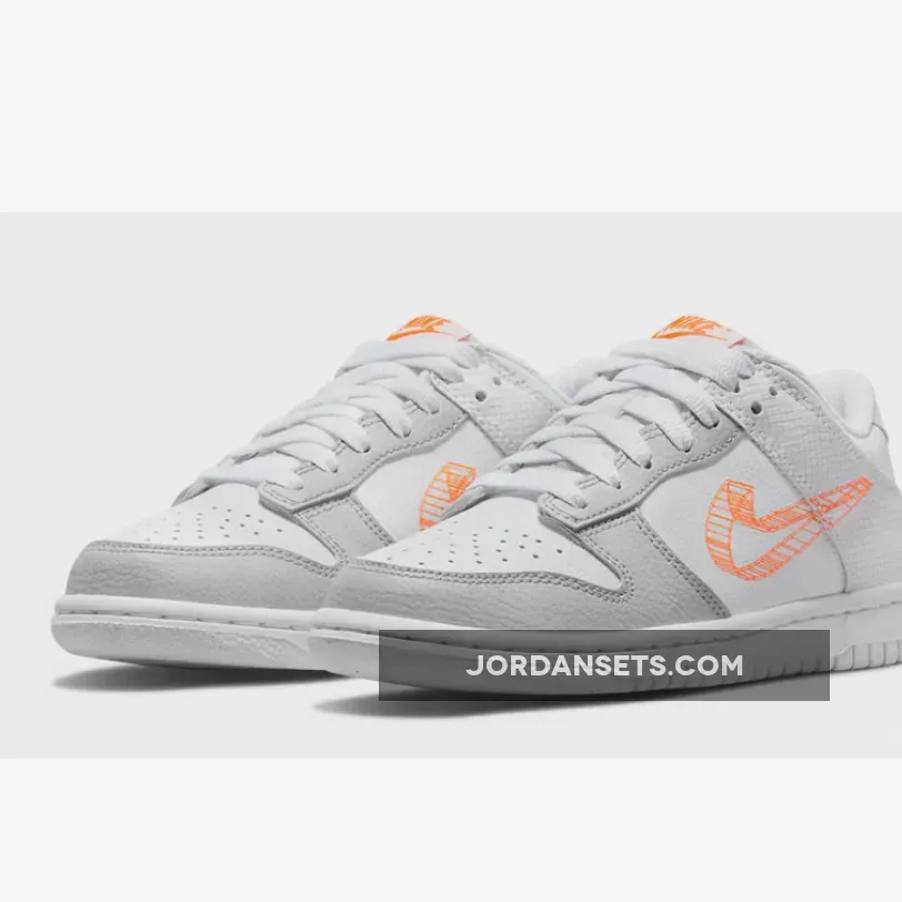 The Peter Moore-designed Nike Dunk Low never stops innovating. Case in point is the new Nike Dunk Low GS 3D Swoosh White Grey, featuring a non-standard Swoosh. It also comes in a smaller size. The upper is completely covered in tumbled leather with white on the toe box, mid-panel and collar then light grey on the toe cap, the mudguard and the eye stay panel. The foxing and collar flap panel features a lighter grey but with a gridded pattern, giving it a subtle contrast. The most eye-catching detail are the titular 3D Swooshes on both the medial and the lateral sides in vivid orange. This bright orange appears again on the white tongue tab and the white heel tab.
