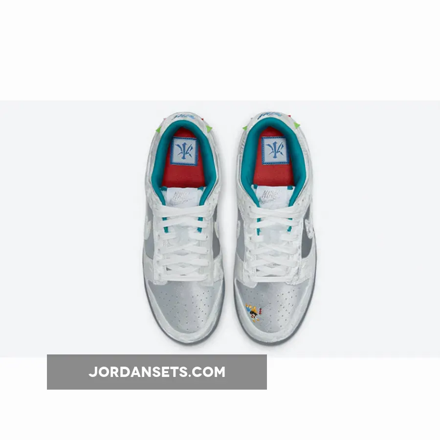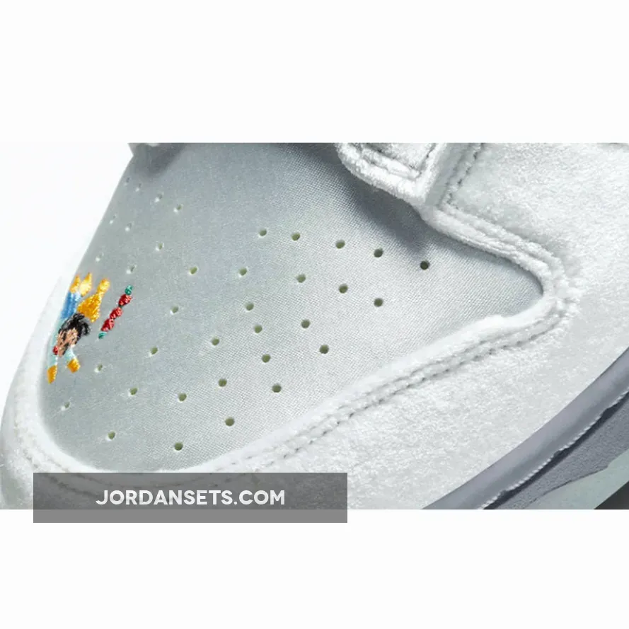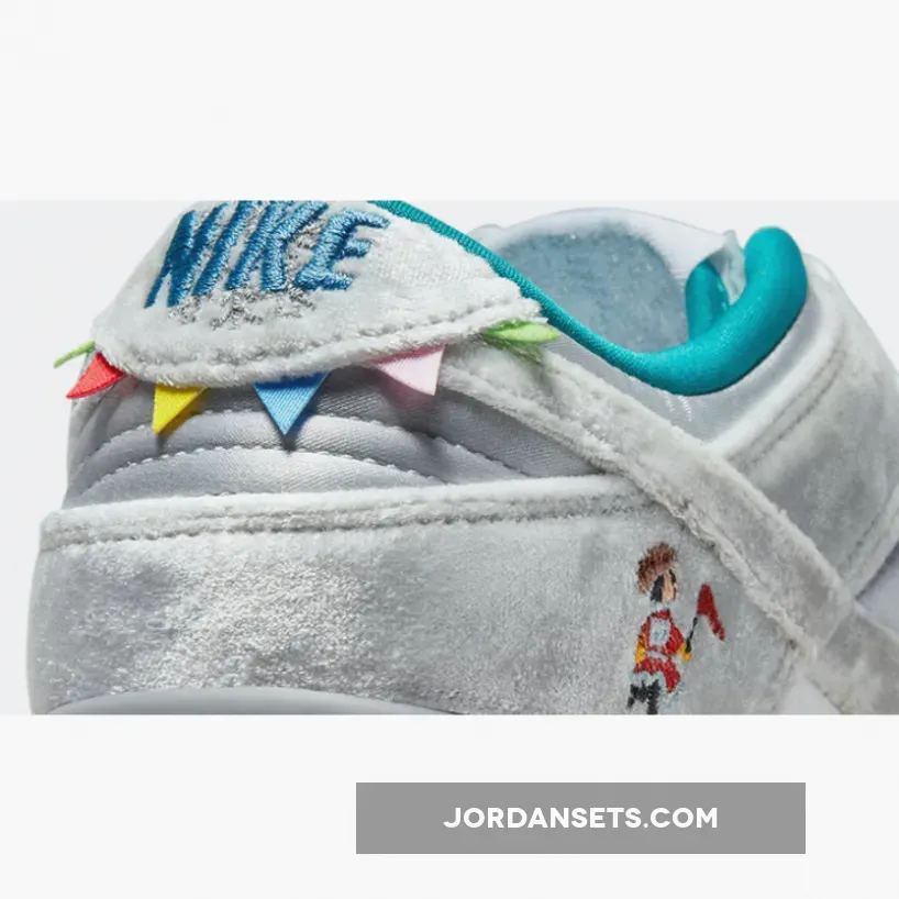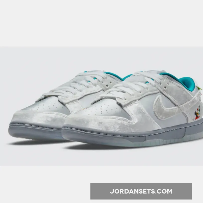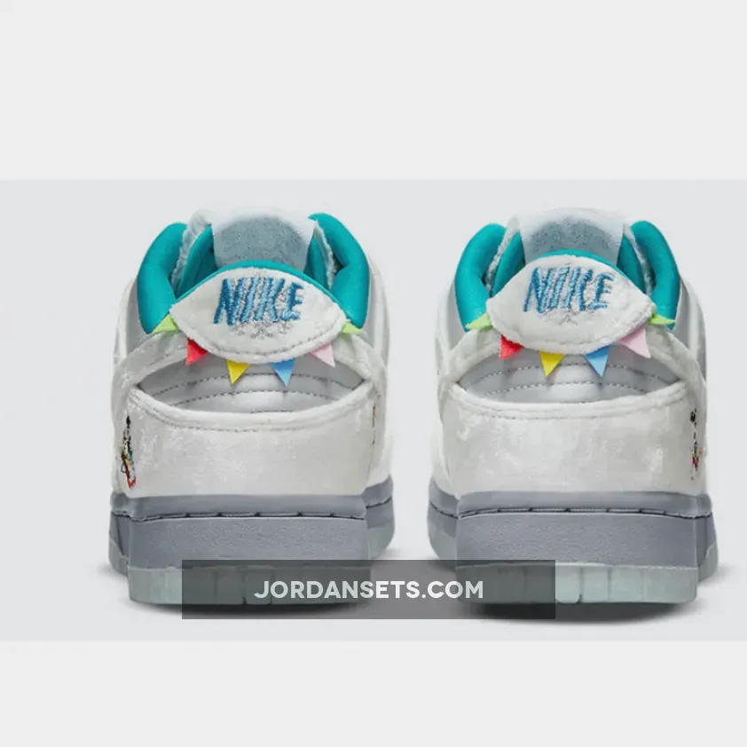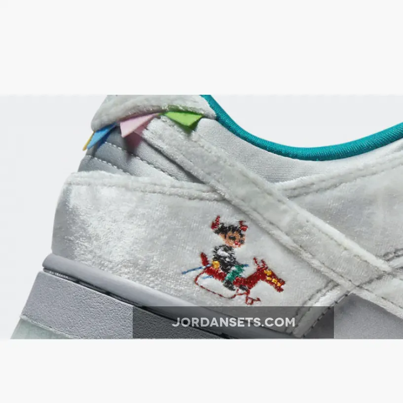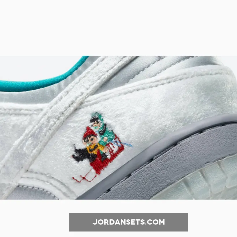 The holiday season is right around the corner and Nike will be releasing a special colorway of the Nike Dunk Low to celebrate winter. Covered in hues that reflect the winter season, this Nike Dunk Low combines Matte Silver and White on the upper in premium materials which include velvet on the overlays and a mesh/nylon for the base. Unique features on this pair include graphics of court jesters and children playing in the snow and sleds, colorful detailing on the collars on the heel tab typically worn by the medieval jokesters, furry tongues, a kanji that translates to “Ice” on the insoles, and translucent outsoles with snowflake graphics.