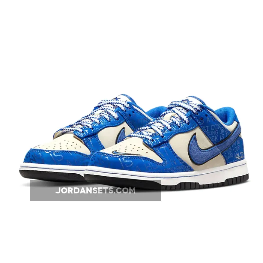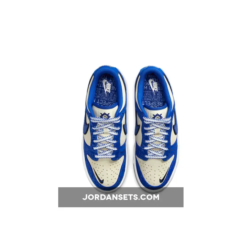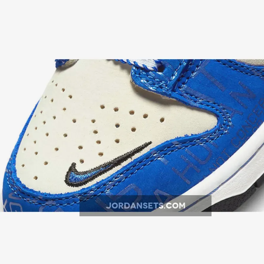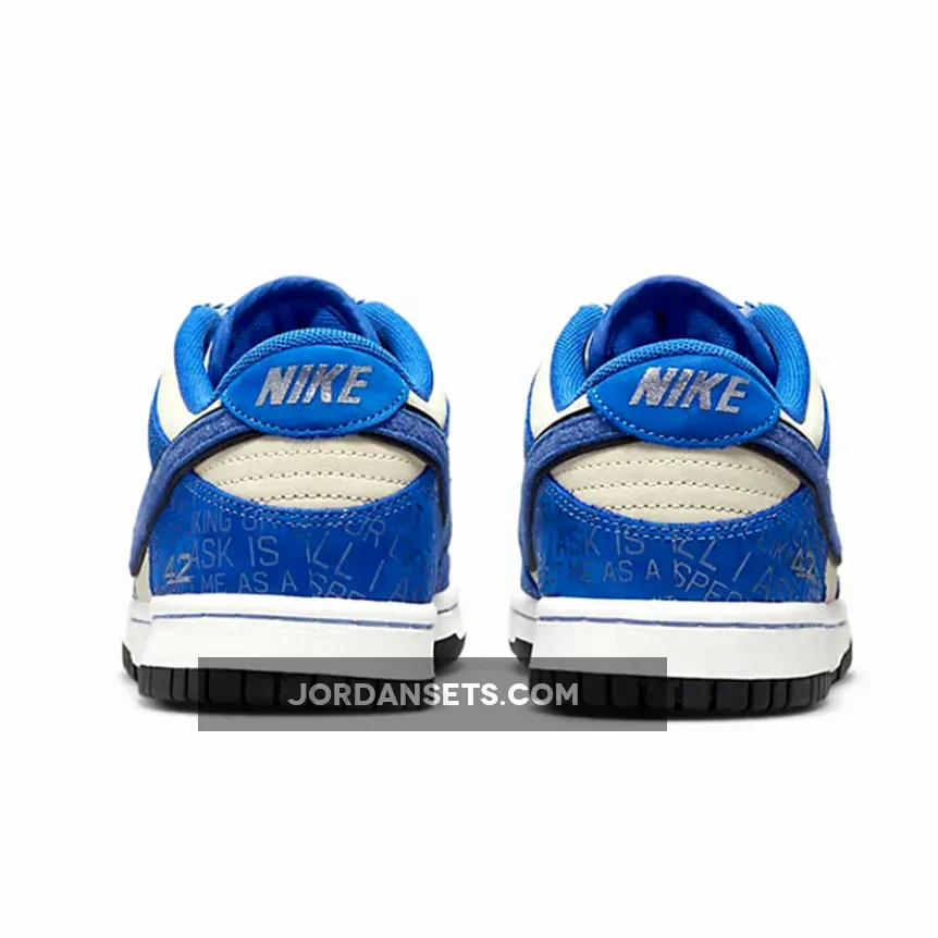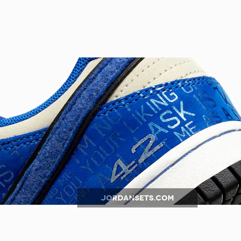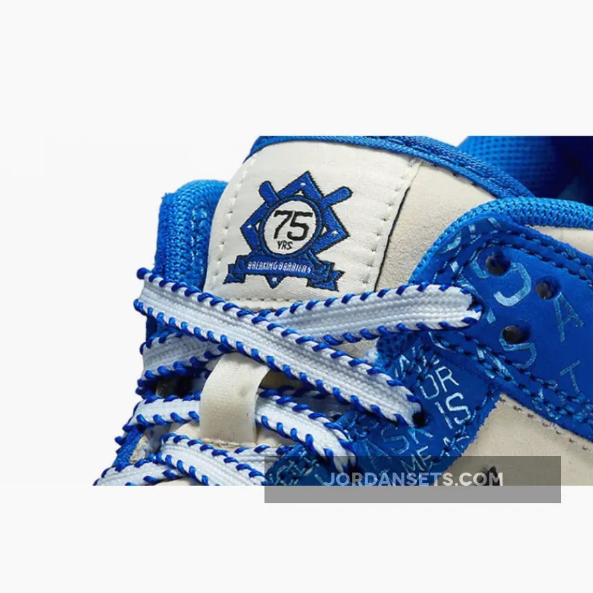 The Nike Dunk Low ‘Jackie Robinson’ celebrates the 75th anniversary of an epochal sports moment. On April 15, 1947, Jackie Robinson broke baseball’s color barrier by making his major league debut with the Brooklyn Dodgers. The team’s colors are represented by the shoe’s leather upper, featuring an off-white base with royal blue overlays. The latter is inscribed with Jackie’s inspirational quotes, while the athlete’s jersey number is stamped on the lateral heel. Additional unique details include stitched laces, felt Swooshes, and a 75th anniversary tongue tag.