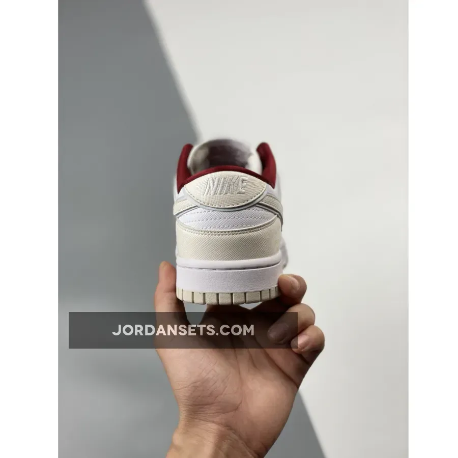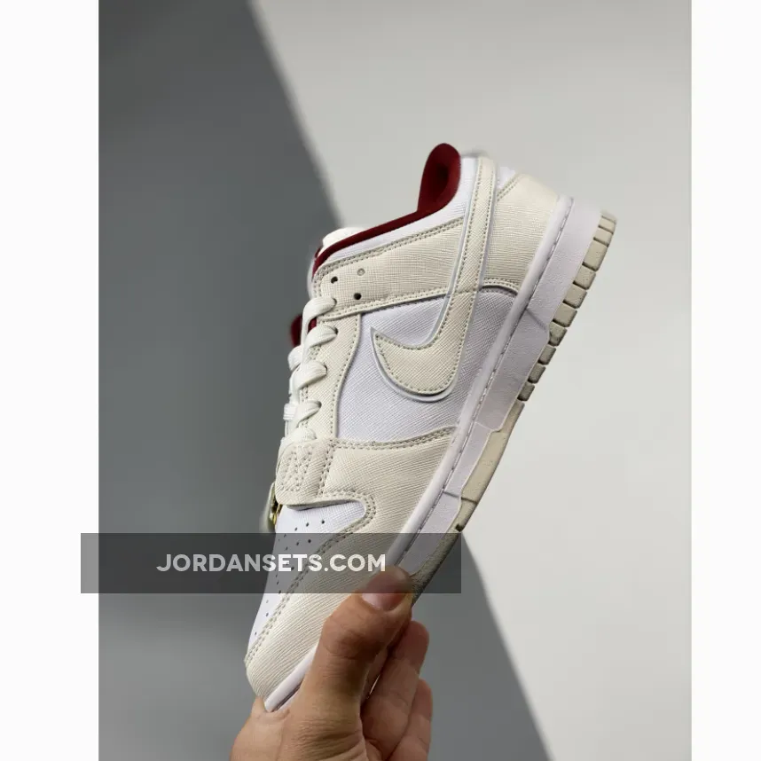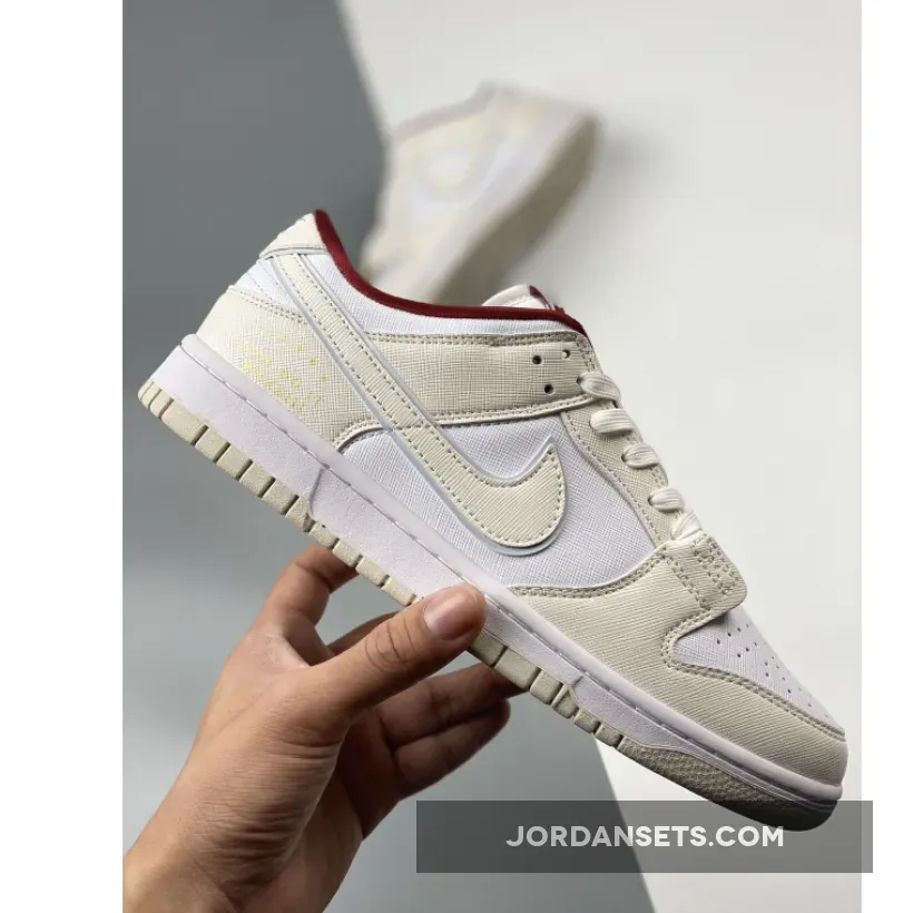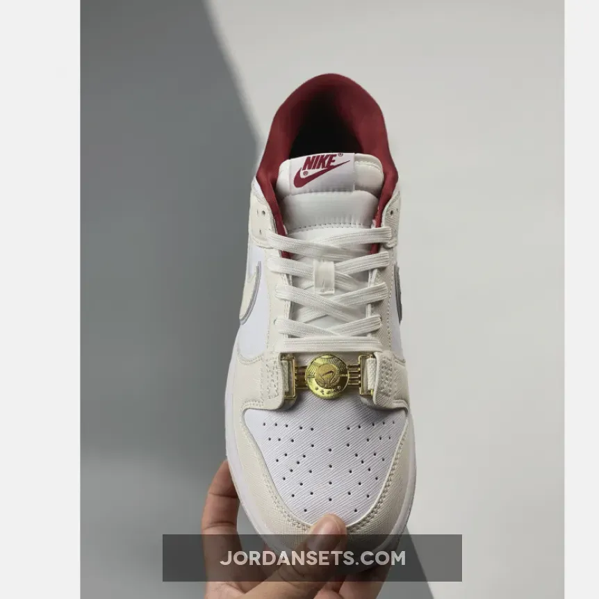 The Dunk Low gets coated in soft hues and sharp slogans for this iteration of the Just Do It collection. Dropping alongside a Nike Blazer and Air Force 1 Low, another iconic silhouette joins a strong roster for the JDI collection. Embodying a gentle approach, Nike packs a sophisticated punch with the smaller details on this edition.Imbued in white and sail leather, the classy upper keeps it cool while the gold details do all the talking. On the lateral heel, Nike’s iconic slogan is announced in capitalised gold lettering, with gold stars arching above that’ll have you reminiscing about your outdated EU Passport. Inside, the passport motif is continued with a regal shade of burgundy, suggesting you need these laced on your feet for any upcoming flighty adventures. The ring-shaped dubraes are a playful addition that are similar to a number of other contemporary Nike releases that have toyed with the traditional lace decorations, such as the “Cuban Link” Air Max 90s from 2020. The dubraes boast the same slogan and line detailing seen on the insoles, rounding off the Just Do It motif.