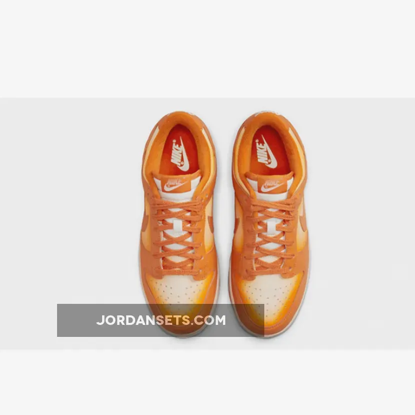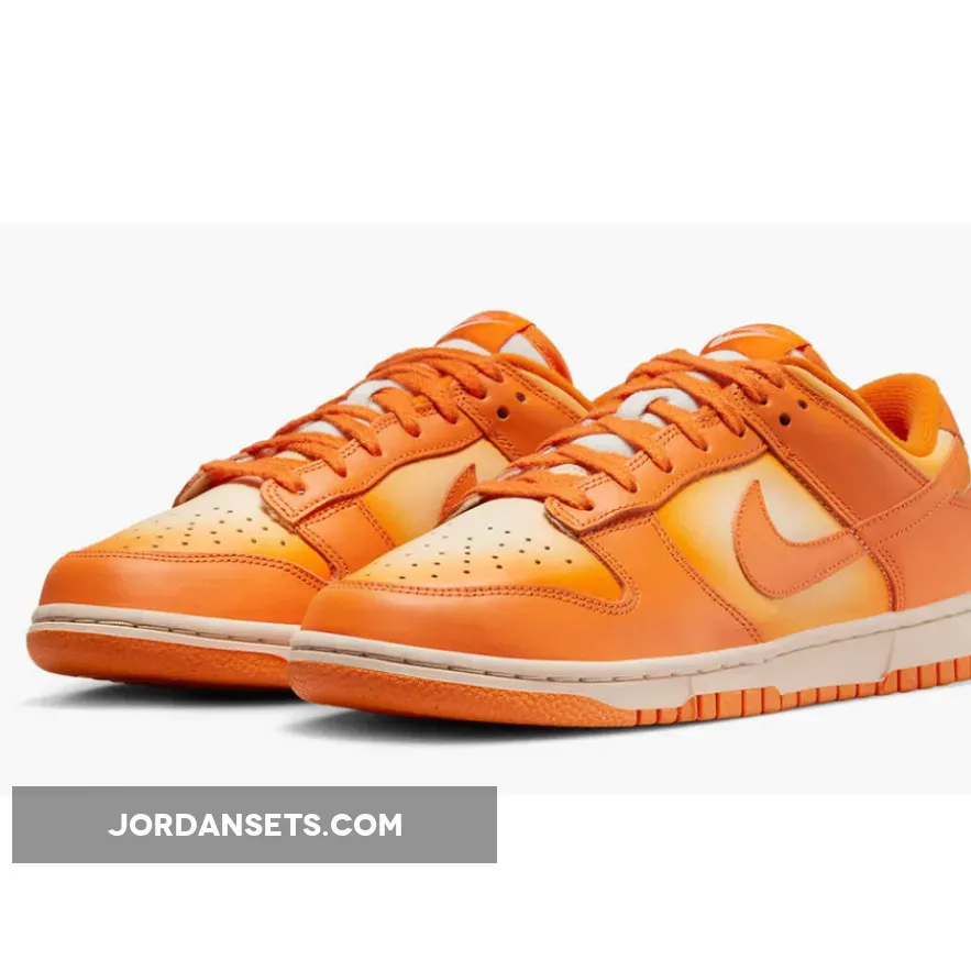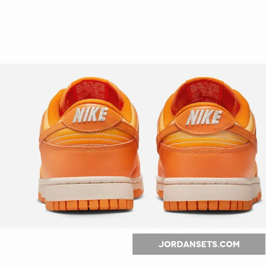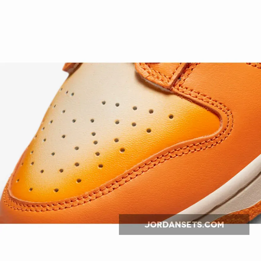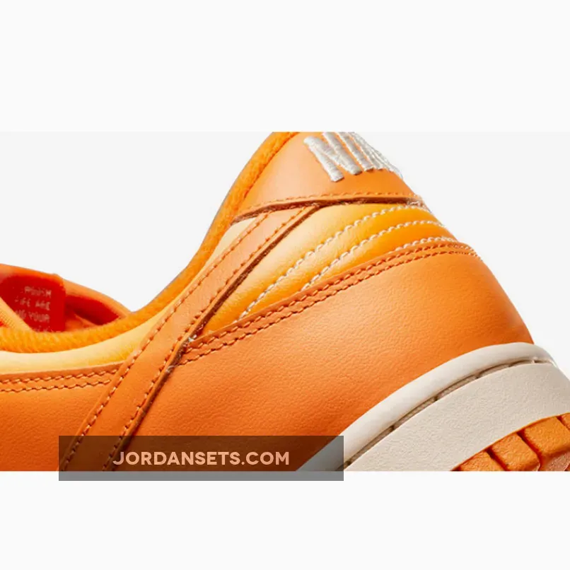 The Peter Moore-designed retro basketball sneaker of Nike, the Dunk, has a hot new drop in a blazing warm tone. Meet the Nike Dunk Low Magma Orange. This Dunk Low’s overlays are all in smooth Magma Orange leather, including the signature profile Swooshes on both mid-panels. However, what will catch your eye is the gradient treatment of the smooth leather base panels in Pearl White gradually turning Magma Orange on the outer edges. A pure white nylon tongue with Magma Orange lining features a Magma Orange tongue tab with white Nike branding. Embroidered white Nike text branding stands out on the Magma Orange heel tabs.