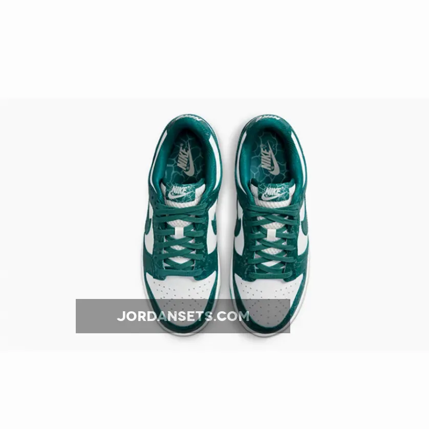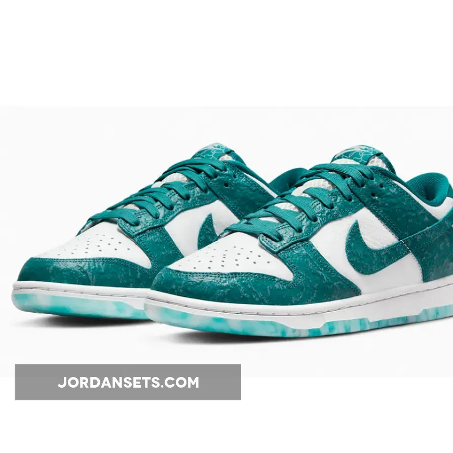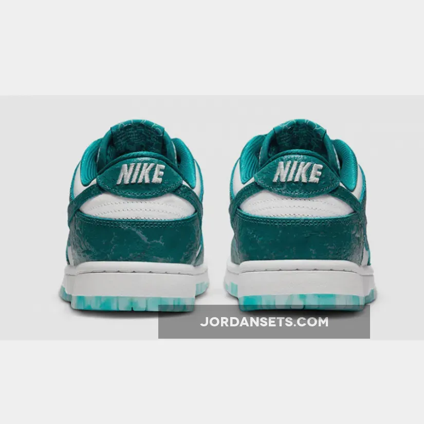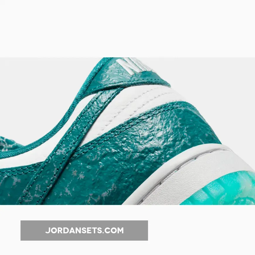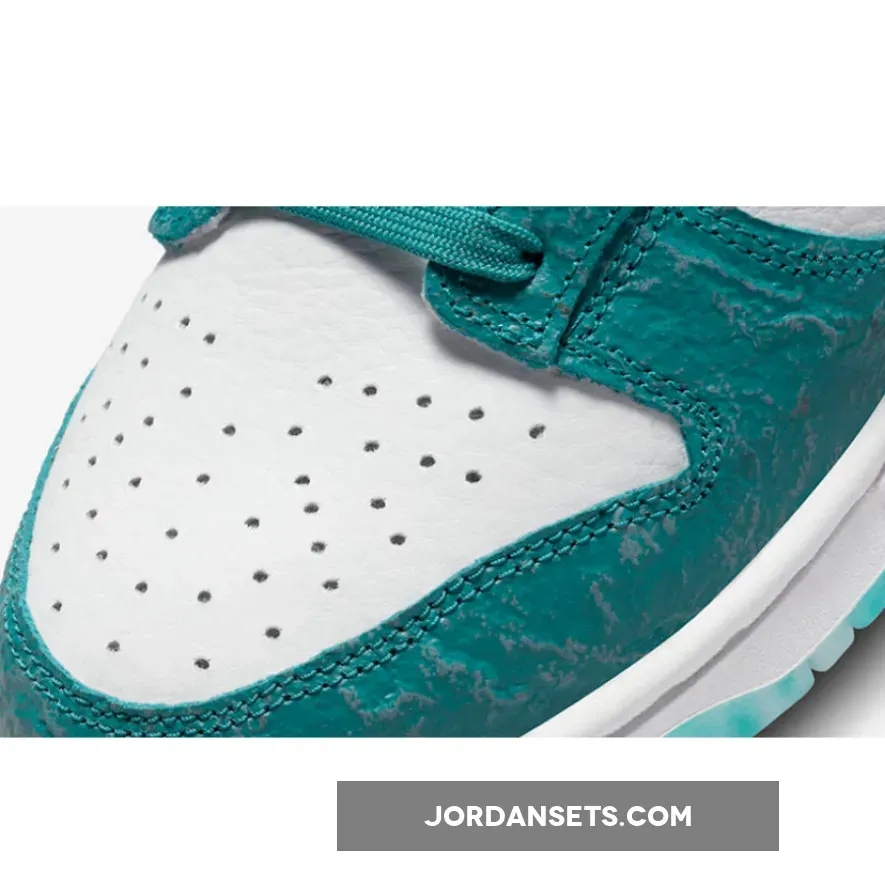 Feeling beachy? The Nike Dunk Low Ocean is for you. This summery iteration of the versatile low-top silhouette features cool blue-green panels with a texture akin to jagged seaside rocks in the toe, throat and heel areas. Even the Swooshes of this Dunk Low sport the same ocean-inspired aesthetic. Meanwhile, the perforated toe box and side panels are dressed in pebbled white leather.