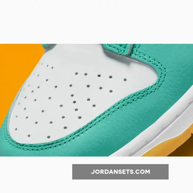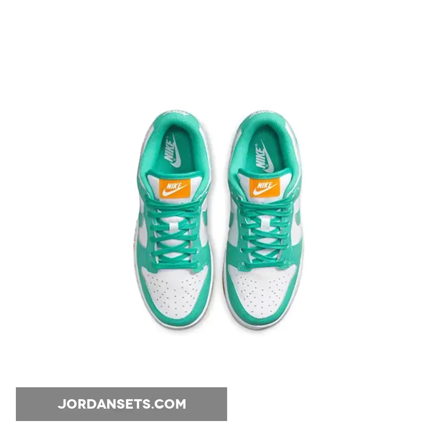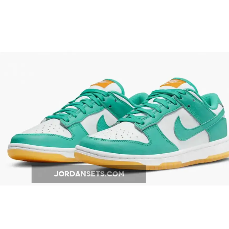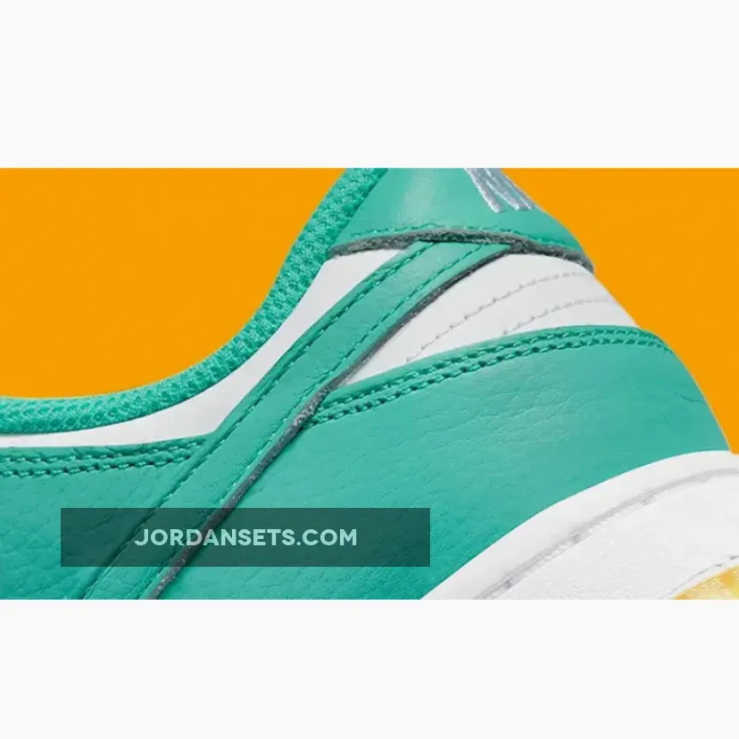 The Nike Dunk Low prepares for hotter weather with a splash of cool “Turquoise Green” and a dash of citrusy “Orange”. Check out the Nike Dunk Low Turquoise Green Orange.Calling to mind tropical scenes and beach vibes, this Dunk Low sports a clean white base overlaid with easy-on-the-eyes Turquoise Green tumbled leather, matching the laces, the mesh sockliner and the tongue lining. A lively pop of orange comes in the form of the tongue tab with white Nike branding. This pair is a perfect staple for your travel gear.