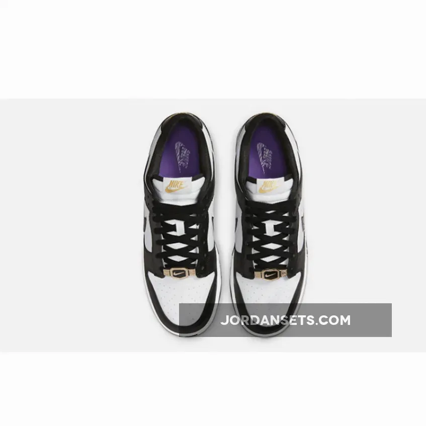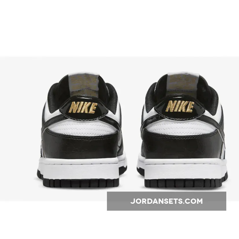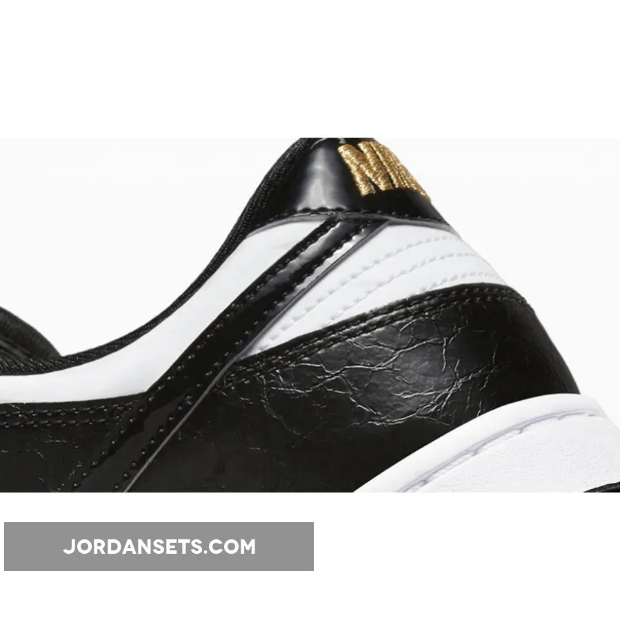 Continuing the glitzy makeover are the glossy patent leather Swooshes, a glittery gold Nike branding at the tongue tag and a gold wrestling belt-inspired dubrae. Underfoot, the shoe retains the yin and yang palette and the signature Dunk Low lightweight cushioning you can depend on.