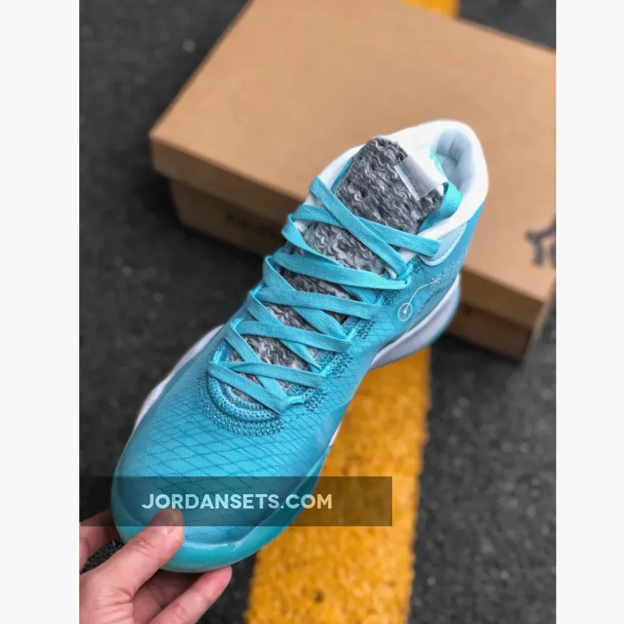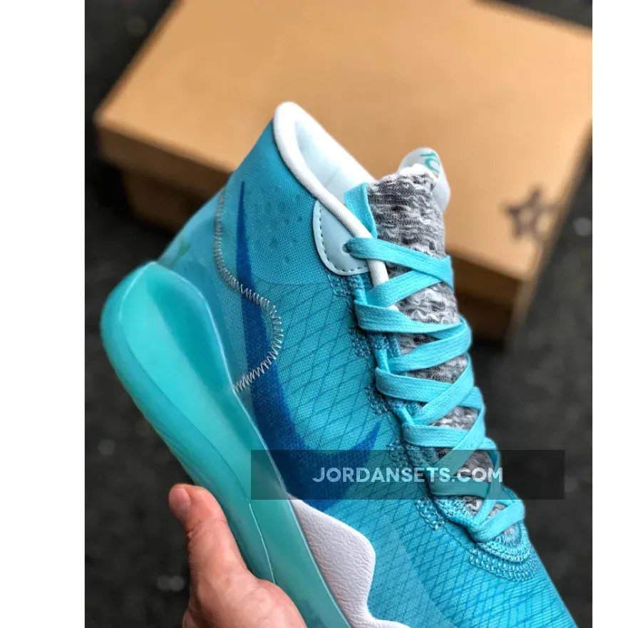 this Nike KD 12 features a Blue Gaze, Photo Blue and Blue Tint color combination. Highlighted with a Teal translucent upper while a darker shade of Blue lands on the base and Swoosh logos on the panels. White hits the liner and midsole, Grey runs across the tongue while a Teal translucent outsole completes the look.