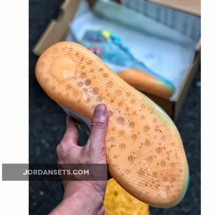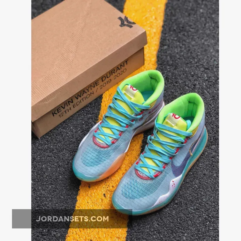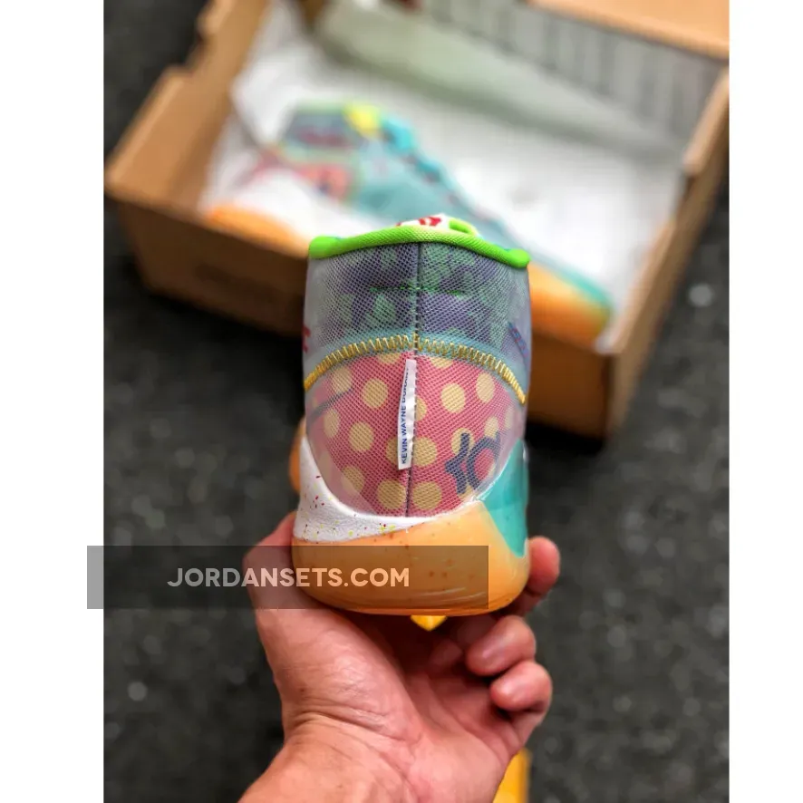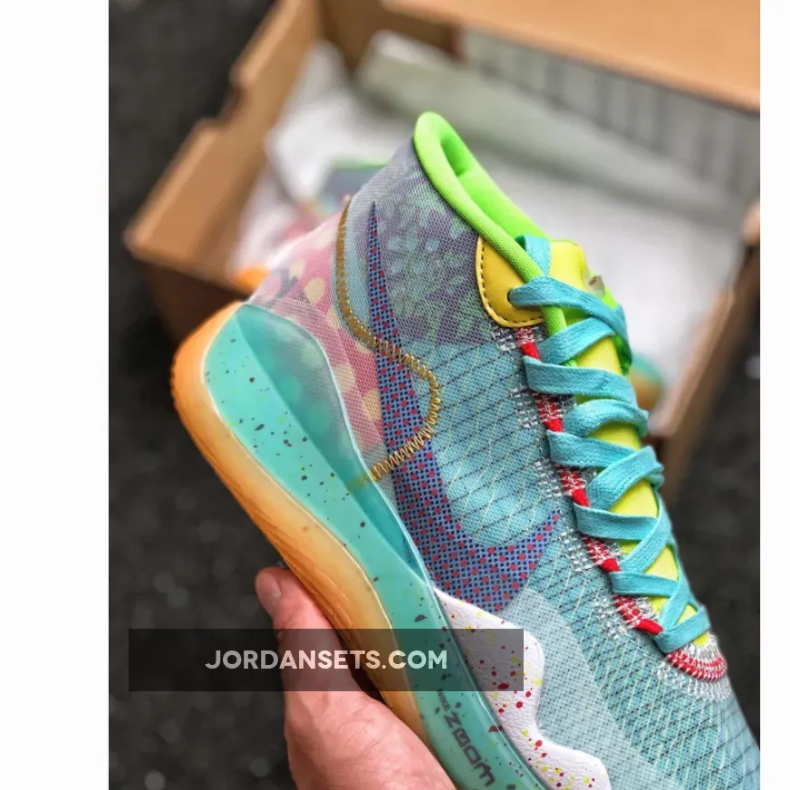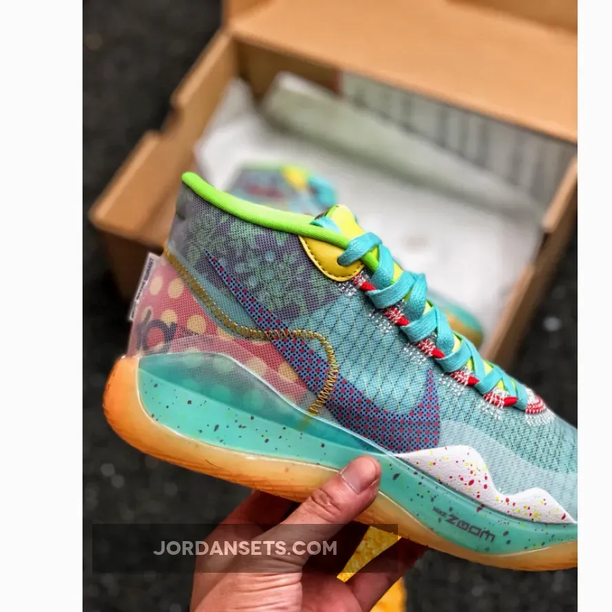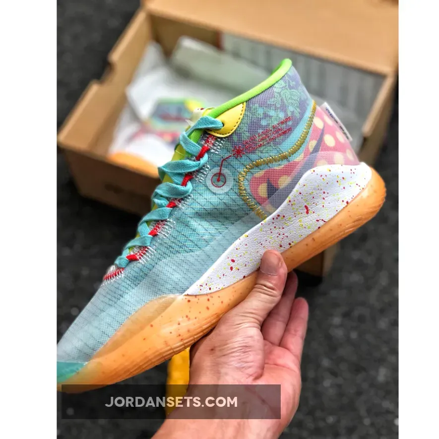 This Nike KD 12 uses vibrant shades throughout which is fit due to previous models having a flashy theme. Using Grey on the upper, we have accents of Peach, Crimson, Lime Green and Blue throughout. In addition a translucent midsole overlay is used while floral graphics are placed above it. Finishing the look is aBlue and Green checkered pattern on the Swoosh and EYBL branding by the heel.