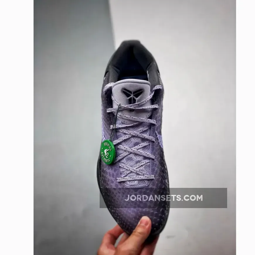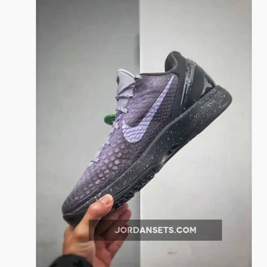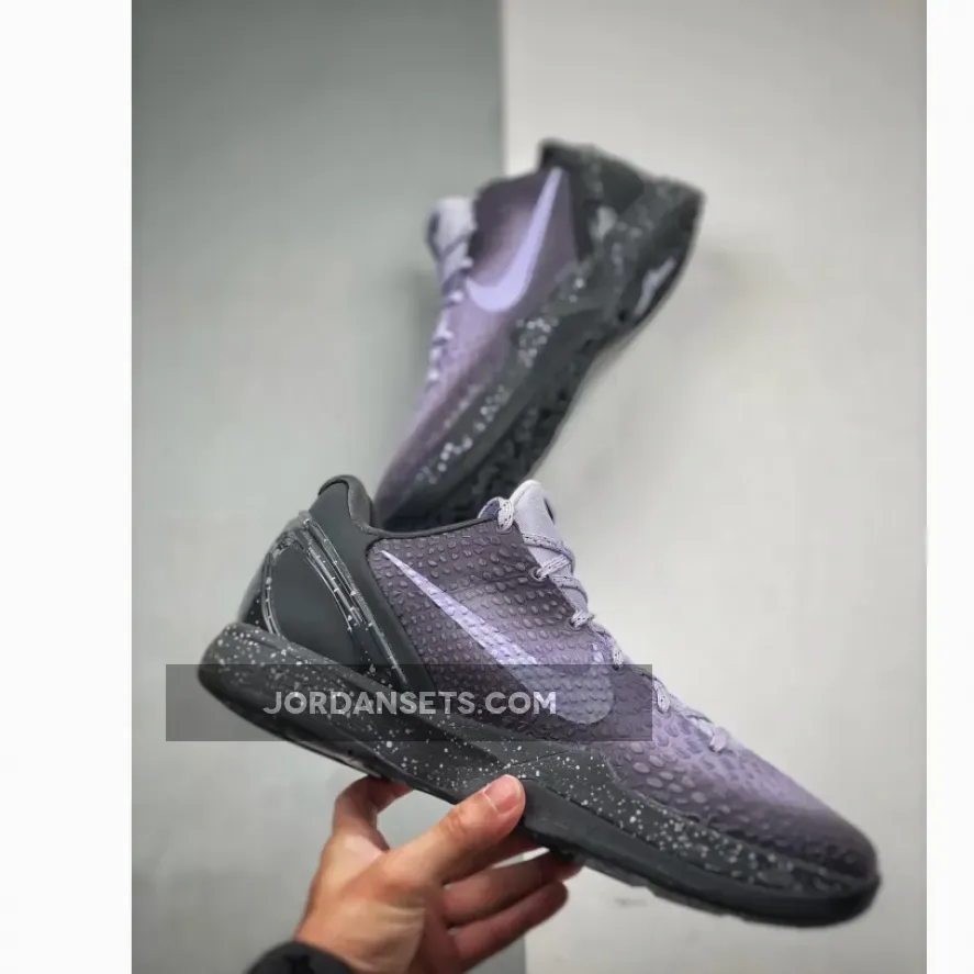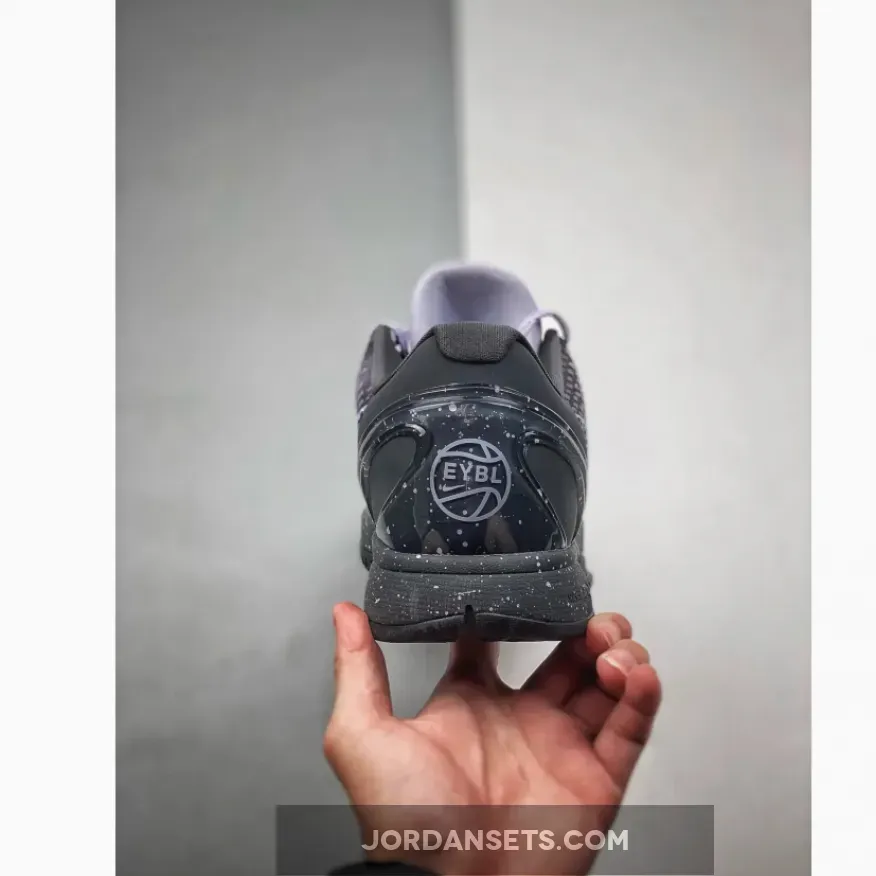 the colorway picks up where the series left off, opting this time for shades of deep purple and black. The latter dyes the entirety of the heel clip and midsole, speckled with splatters of grey all throughout. Above, the Swoosh opts for a white neutral, its scales lightly tinted with the purple that air brushes behind in varying levels of intensity. Kobe’s logo, then, outfits the tongue, placed opposite to the EYBL insignia that dresses the heel in what looks to be reflective paint.